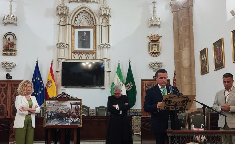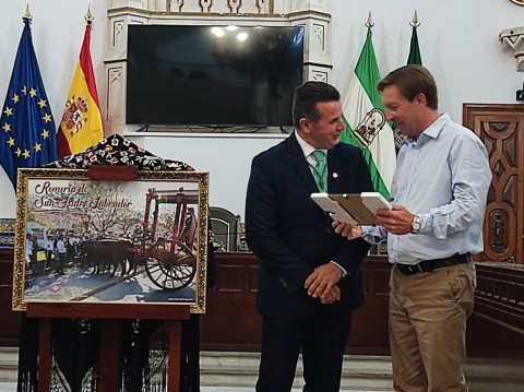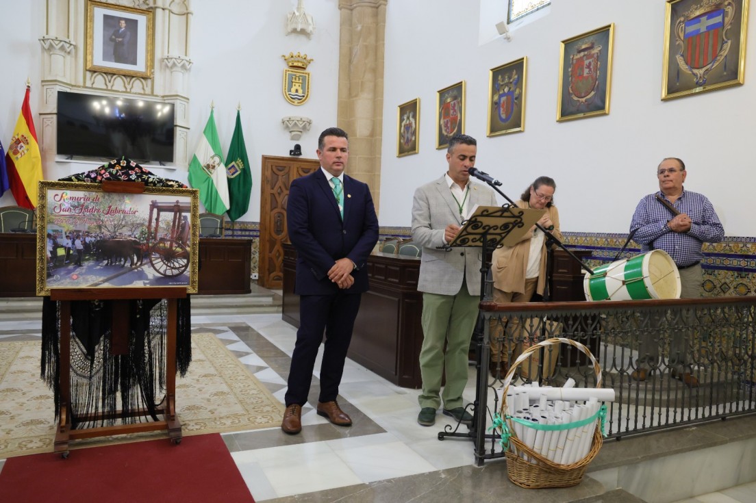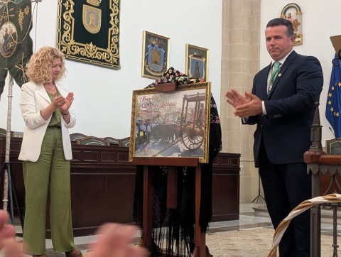 El hermano mayor de la hermandad, Cayetano Salas, y la delegada de Fiestas, Esther García, fueron los encargados de descubrir la fotografía de Miguel Ángel Benítez elegida para esta ocasión, en la que se refleja el paso del santo patrón en su carreta camino de los pinares el día de la romería del año pasado, justo en el punto en el que se colocó el azulejo con motivo del 75 aniversario de la hermandad, en la avenida Príncipes de España. Una imagen que se ha elegido en honor al pregonero y a su presentador de este año en la LXV edición, ya que ellos fueron los que en su día tuvieron la idea de hacer una parada en el camino de la peregrinación desde la iglesia de la O a los pinares y compartir una copa de vino de la Cooperativa Católica Agrícola Vinícola de Chipiona.