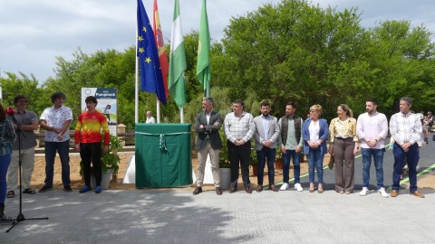 El alcalde de Rota, Javier Ruiz, junto a Julio López, otro de los proponentes, han sido los encargados de descubrir el monolito con el que oficialmente quedan inauguradas las pistas de Pump Track.