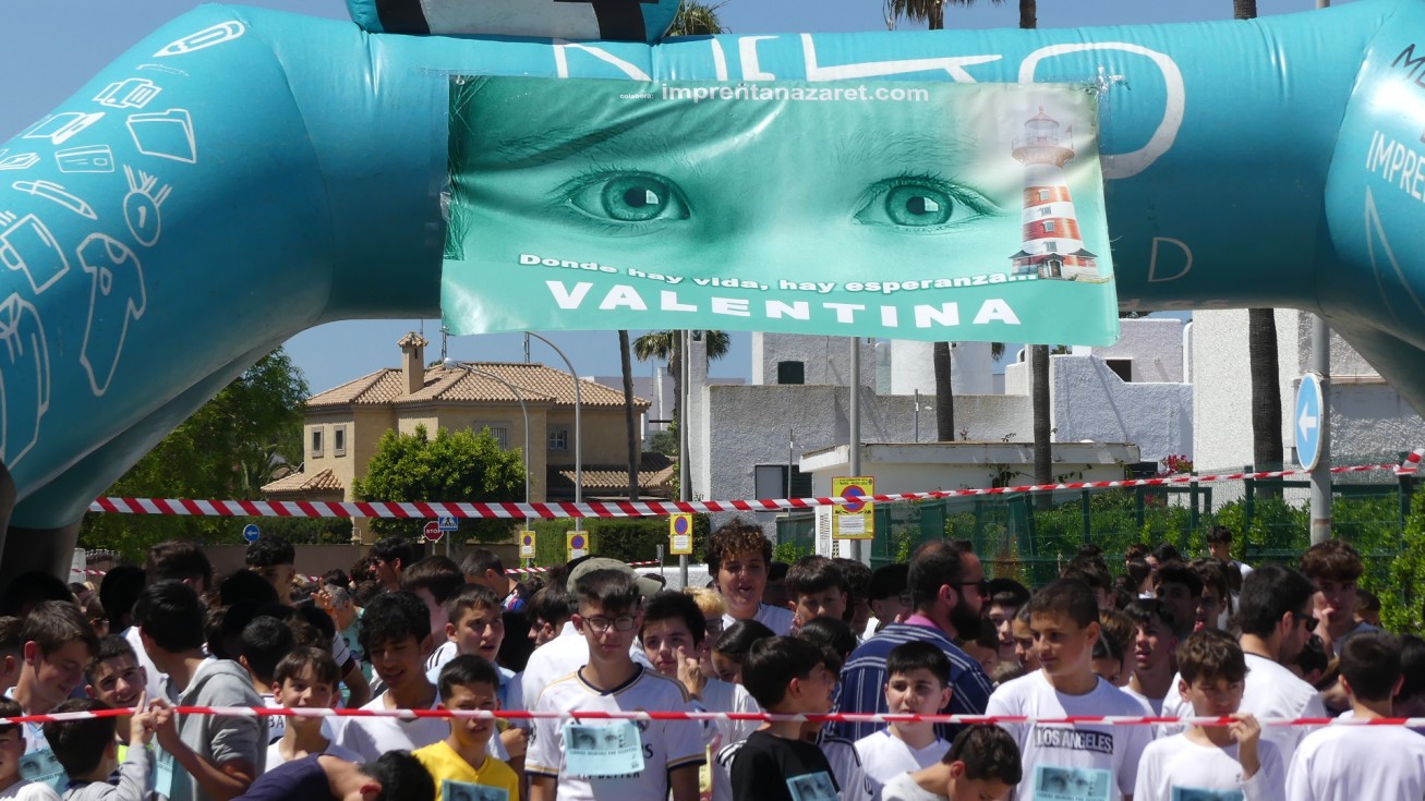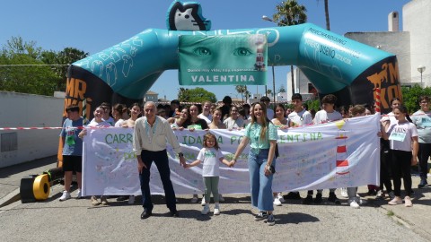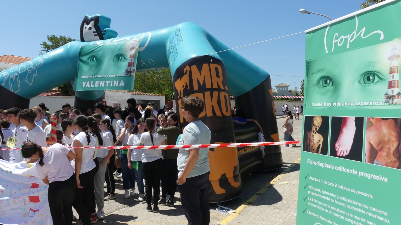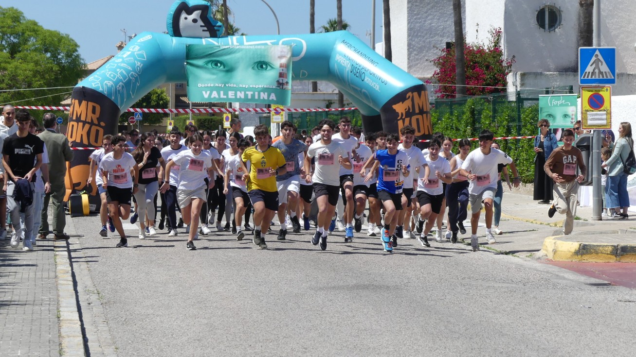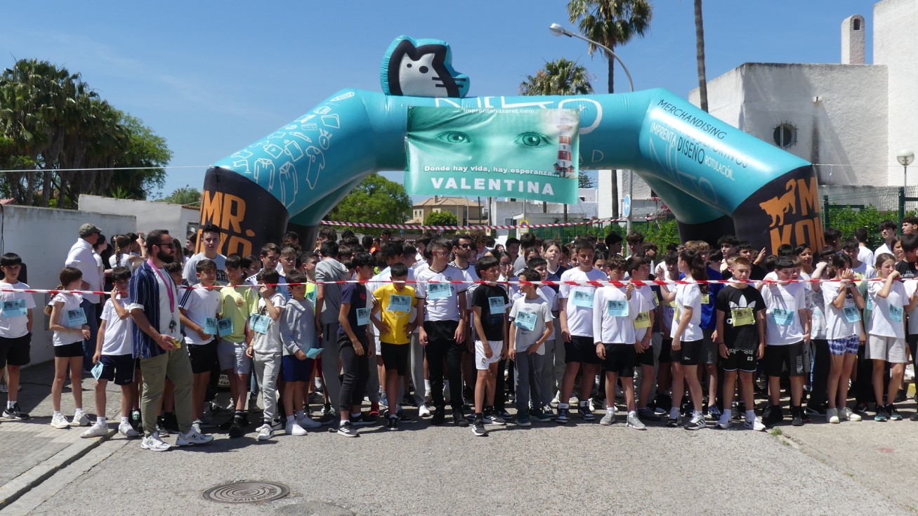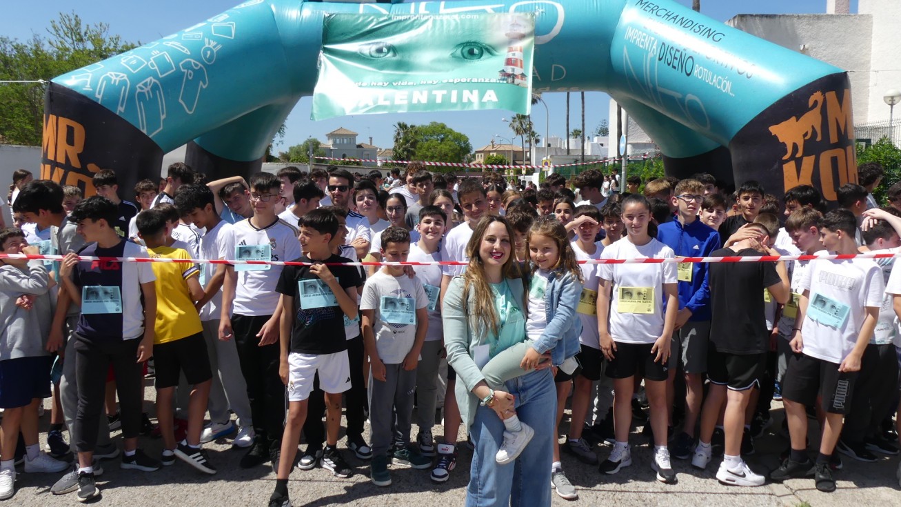 Lo importante hoy, como suele ser habitual en carreras escolares, no era llegar el primero a la meta sino contribuir a dar visibilidad a la enfermedad de Valentina, una pequeña que ha demostrado estar llena de vida pero que su enfermedad la limita en sus movimientos. La FOP es una enfermedad genética que causa formación anormal de hueso en tejidos blandos, de modo que quien la padece, ve cómo progresivamente sus músculos esqueléticos, fascias, tendones y ligamentos se van osificando. El cuerpo reacciona creando un segundo esqueleto, lo que impide especialmente, la movilidad. En España hay 40 casos y en la provincia de Cádiz dos, concretamente, en Jerez.