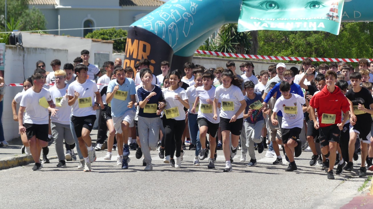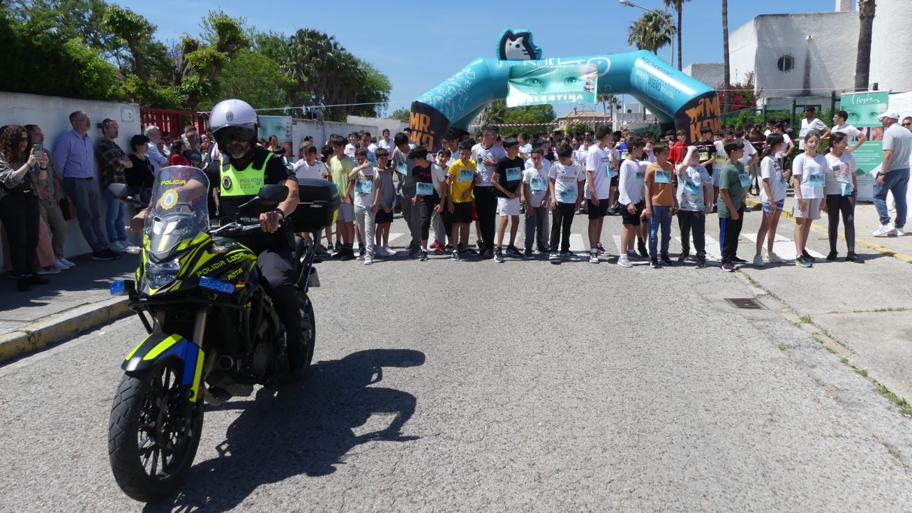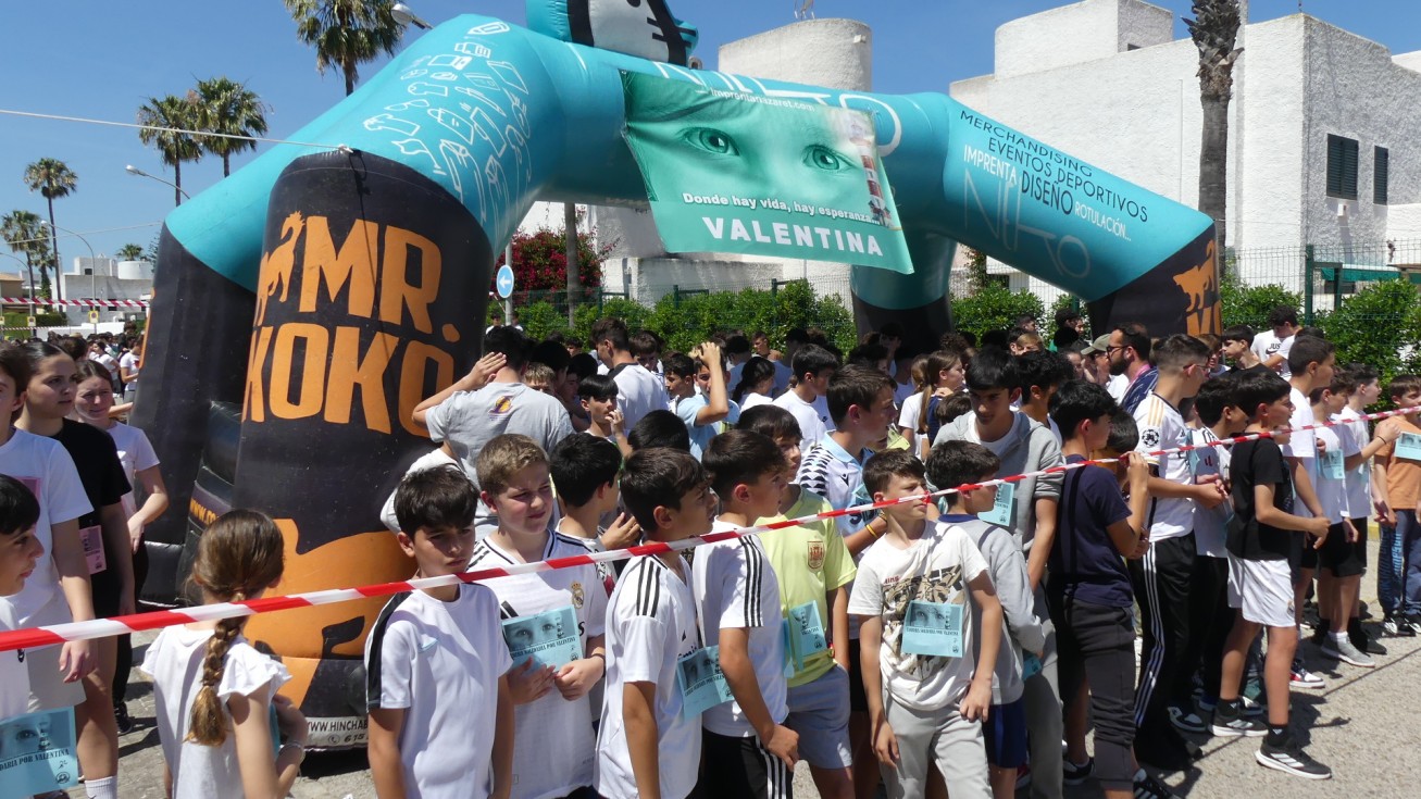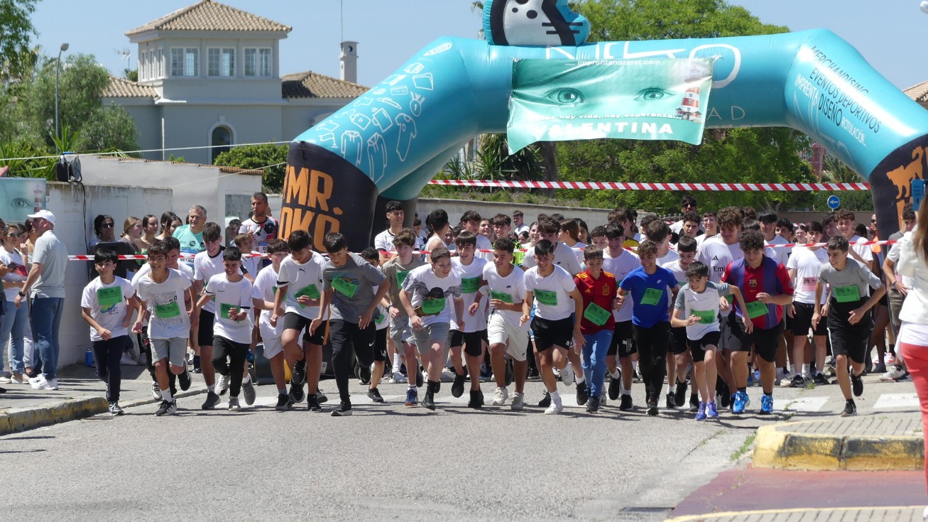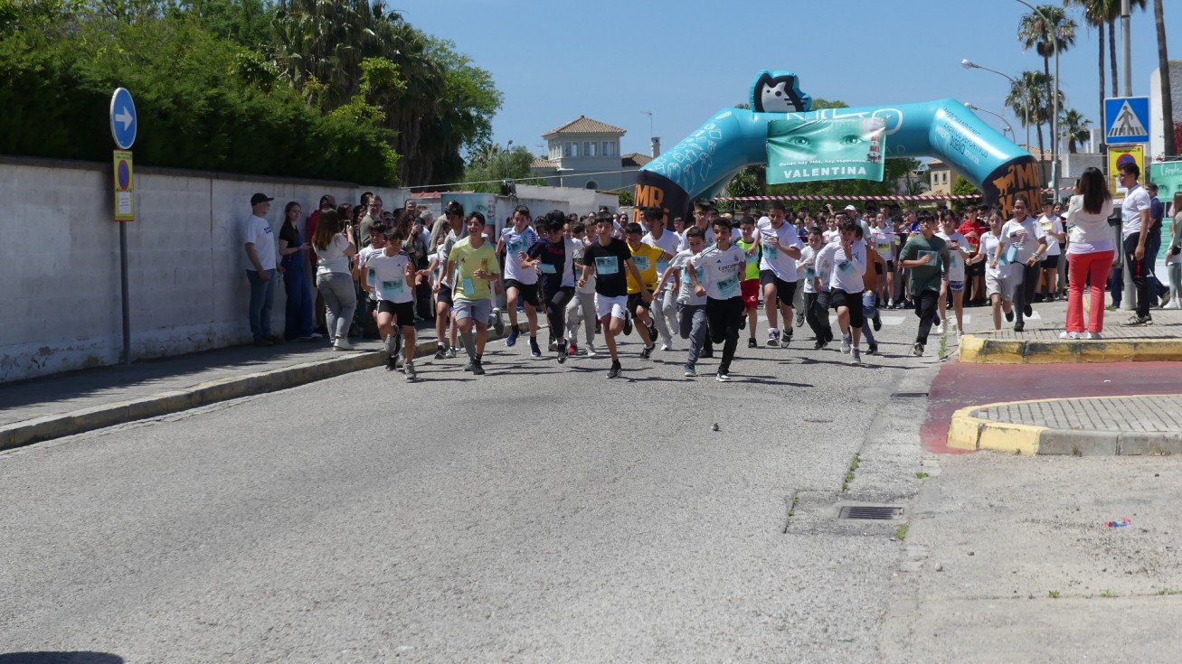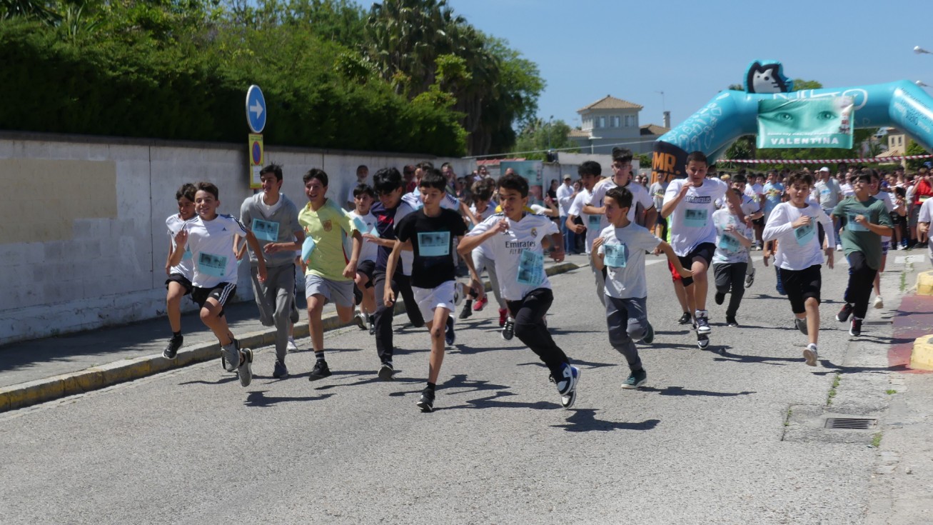 Lo importante hoy, como suele ser habitual en carreras escolares, no era llegar el primero a la meta sino contribuir a dar visibilidad a la enfermedad de Valentina, una pequeña que ha demostrado estar llena de vida pero que su enfermedad la limita en sus movimientos. La FOP es una enfermedad genética que causa formación anormal de hueso en tejidos blandos, de modo que quien la padece, ve cómo progresivamente sus músculos esqueléticos, fascias, tendones y ligamentos se van osificando. El cuerpo reacciona creando un segundo esqueleto, lo que impide especialmente, la movilidad. En España hay 40 casos y en la provincia de Cádiz dos, concretamente, en Jerez.