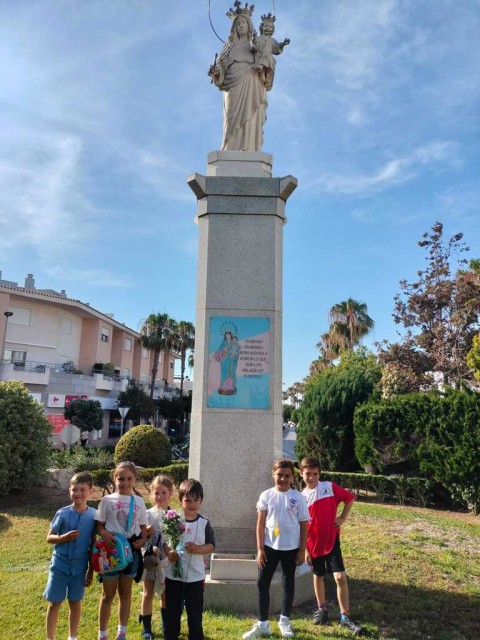 Como cada año, una parada obligatoria se hace en la rotonda dedicada a María Mazzarello, cerca del colegio de las Salesianas, donde dejan una ofrenda, y de esta forma hacen llegar el mensaje de fe en la virgen desde una punta a otra de Rota.