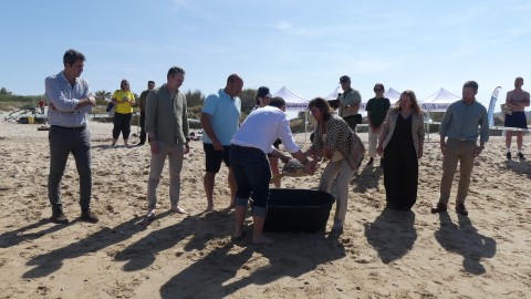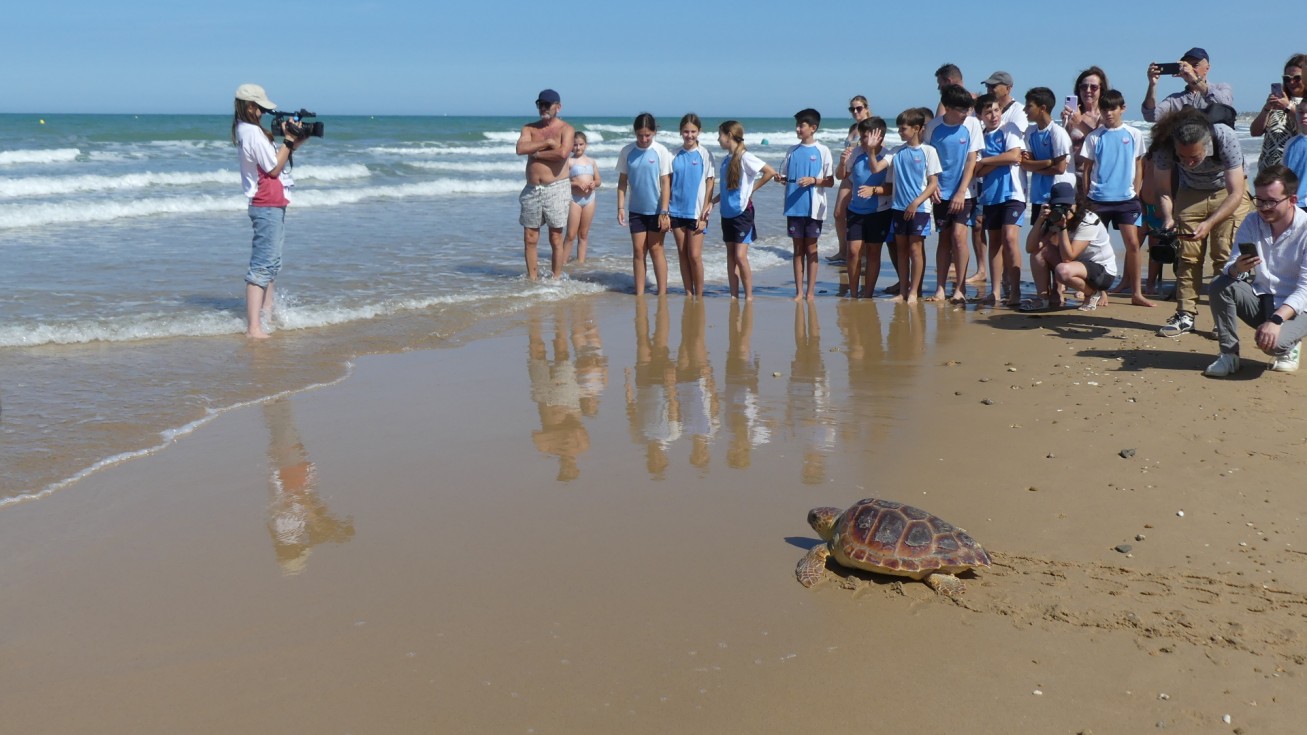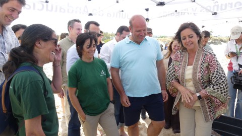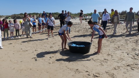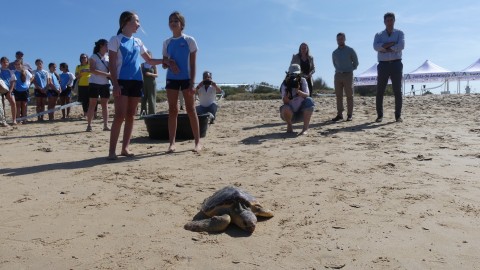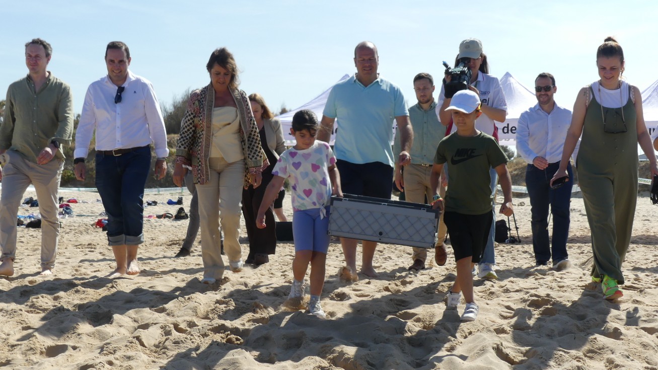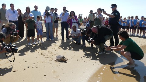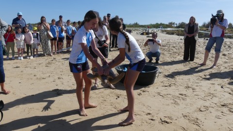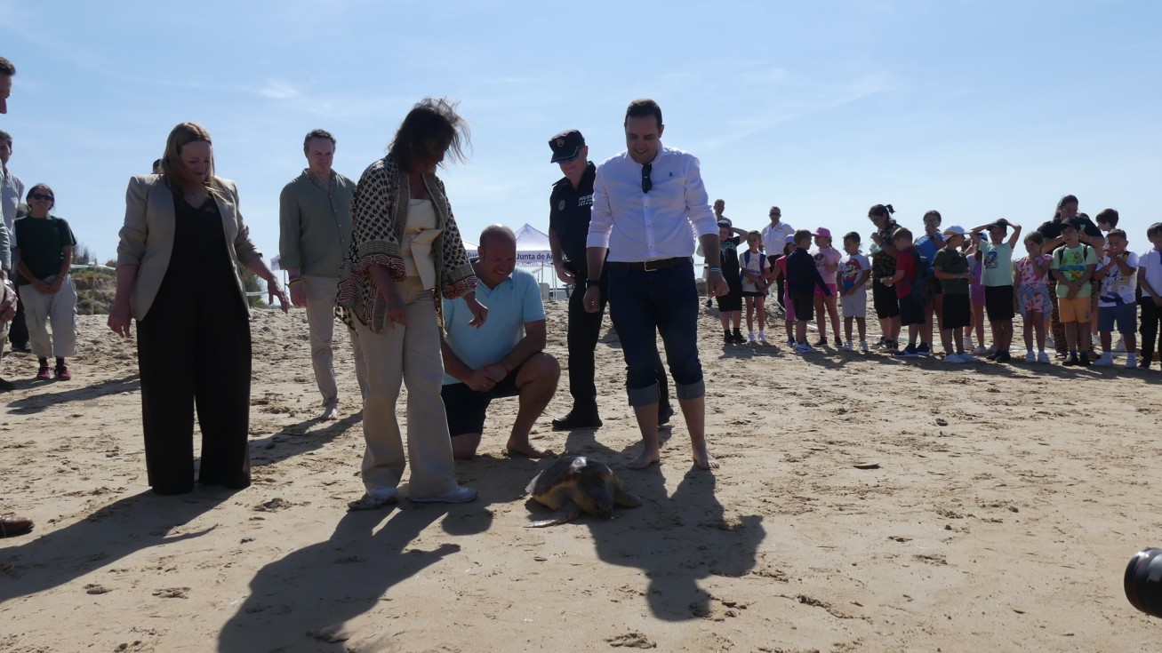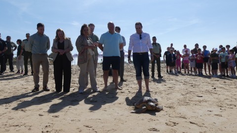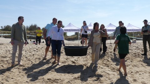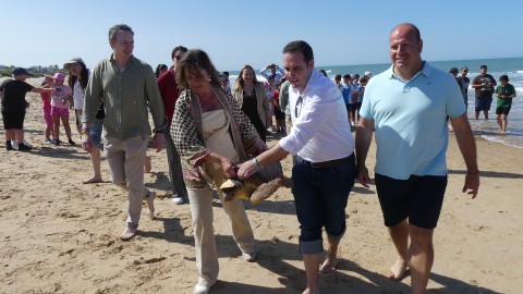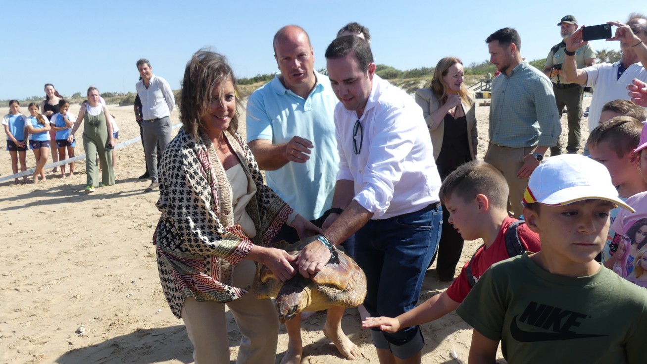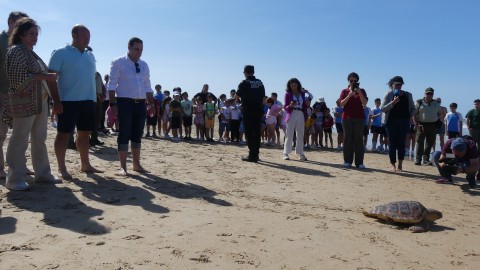 La consejera de Medio Ambiente y alumnos participan en la suelta de tres tortugas en la Ballena