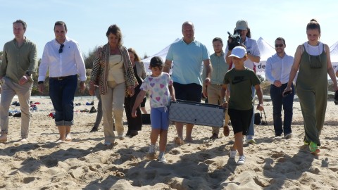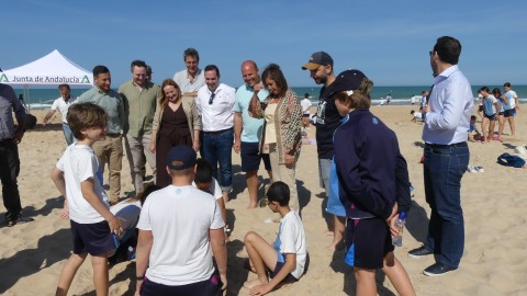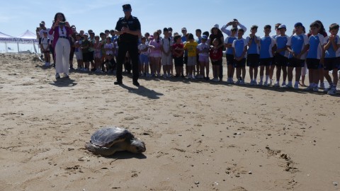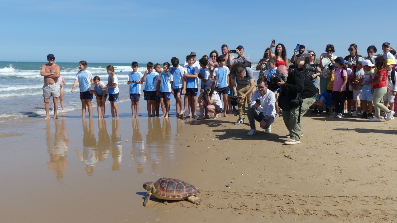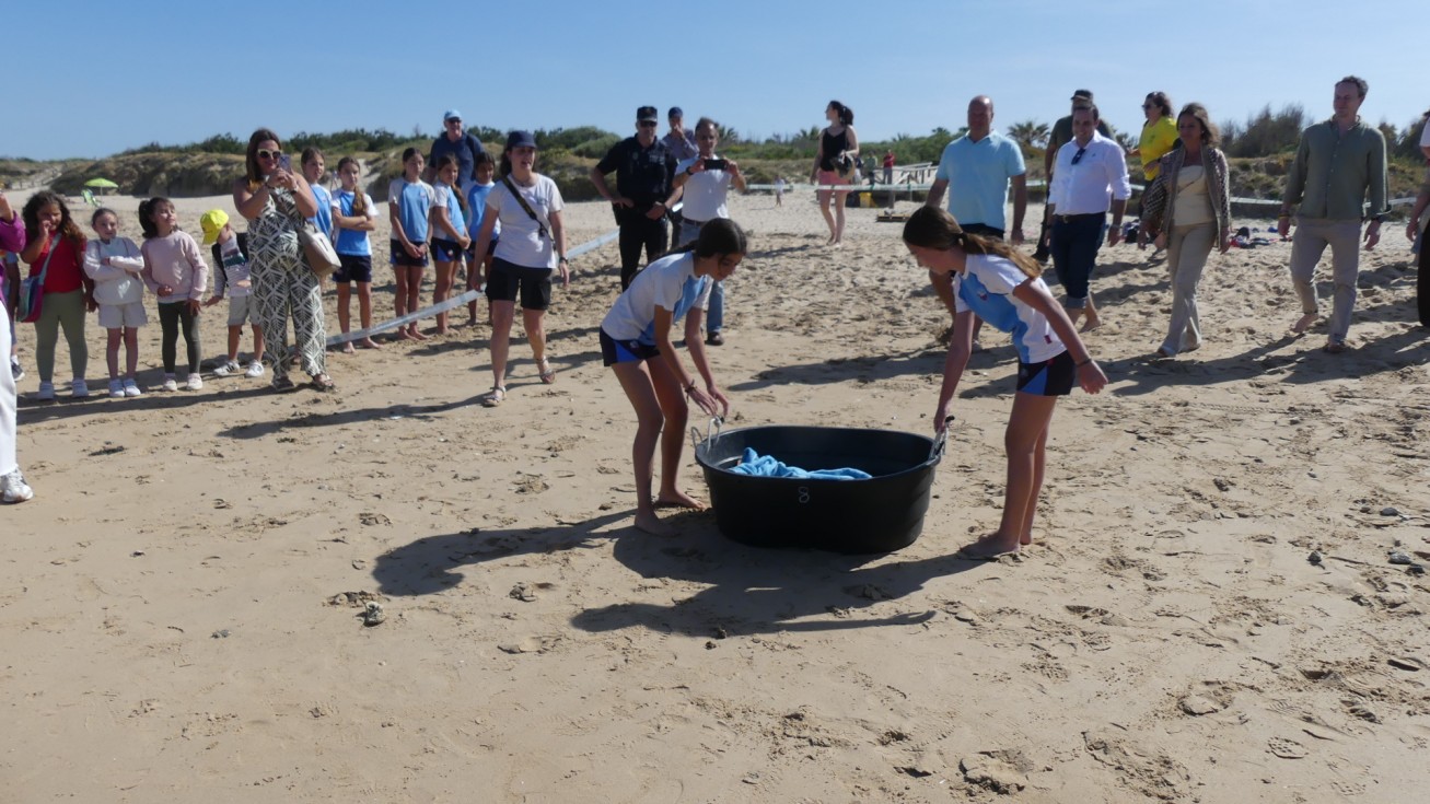 De hecho, a petición de la propia consejera de Medio Ambiente, cuatro alumnos, dos de cada centro, han ayudado a la suelta de estos dos ejemplares que por un pasillo formado por los escolares, representantes políticos, medios de comunicación, agentes medioambientales y representantes de pescadores, han tomado camino hacia el mar en la playa de la Ballena.
