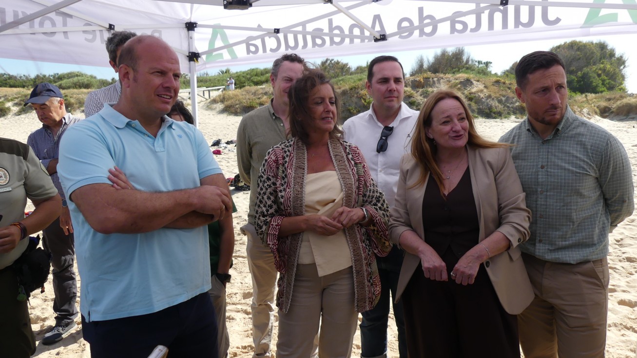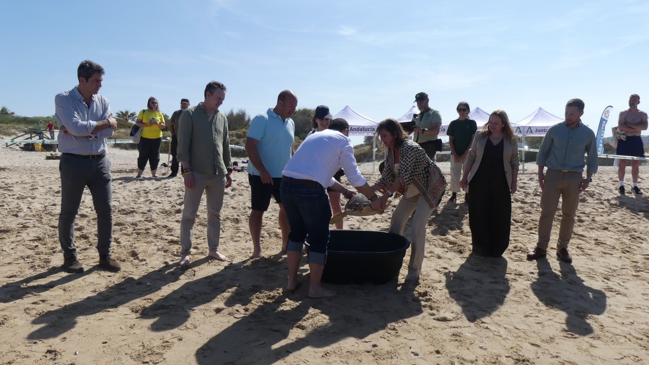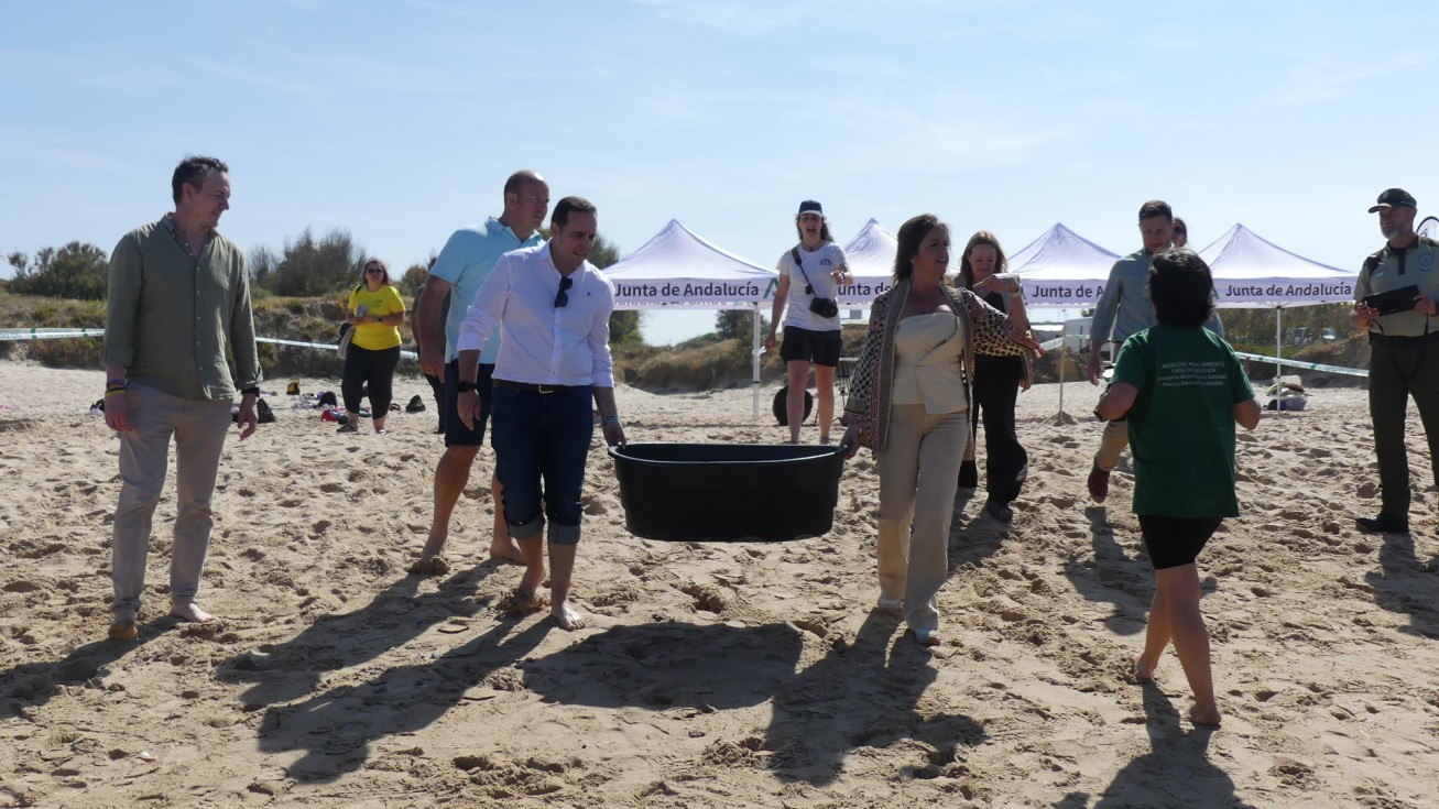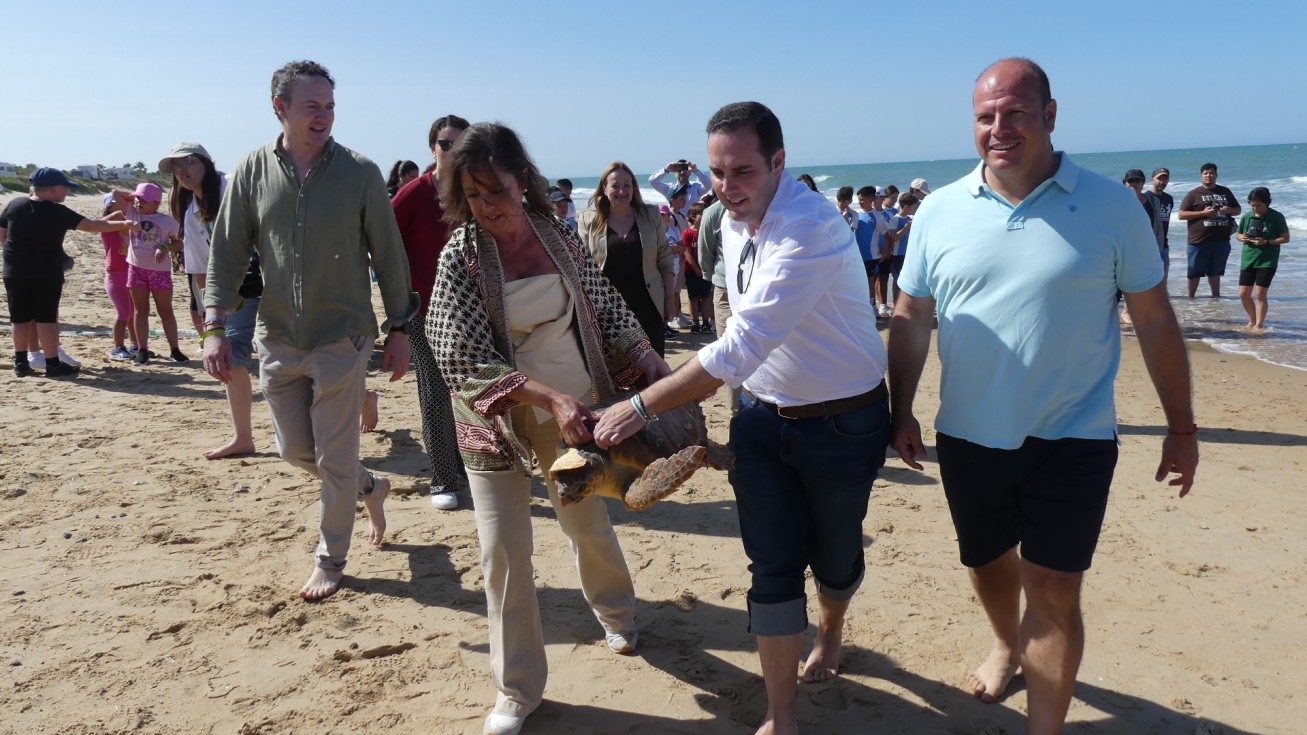 La consejera de Medio Ambiente y Sostenibilidad, Catalina García, junto al delegado territorial del ramo, Óscar Curtido, la teniente de alcalde del Ayuntamiento de Rota, Encarna Niño, el delegado de Playas de Rota, José Antonio Medina, representantes de la cofradía de pescadores de Sanlúcar, técnicos y agentes de medio ambiente, han visto hoy cómo Carlitos, Mariela y Feria, de 3, 7 y 13 kilos, han vuelto al mar tras estar desde el mes de febrero en el Centro de Gestión del Medio Marino Andaluz (CEGMA) del Estrecho, en concreto en Algeciras, donde fueron trasladadas cuando pescadores y armadores de la Cofradía de Pescadores de Sanlúcar de Barrameda las encontraron mientras faenaban.