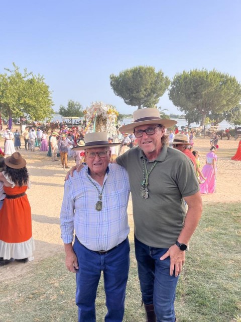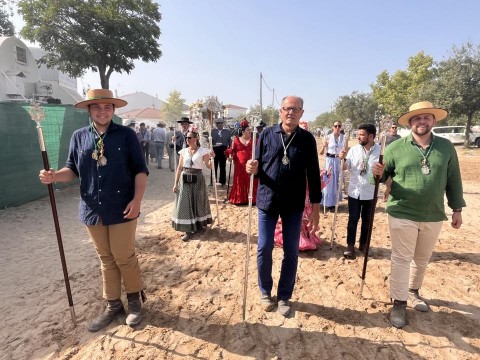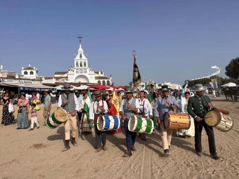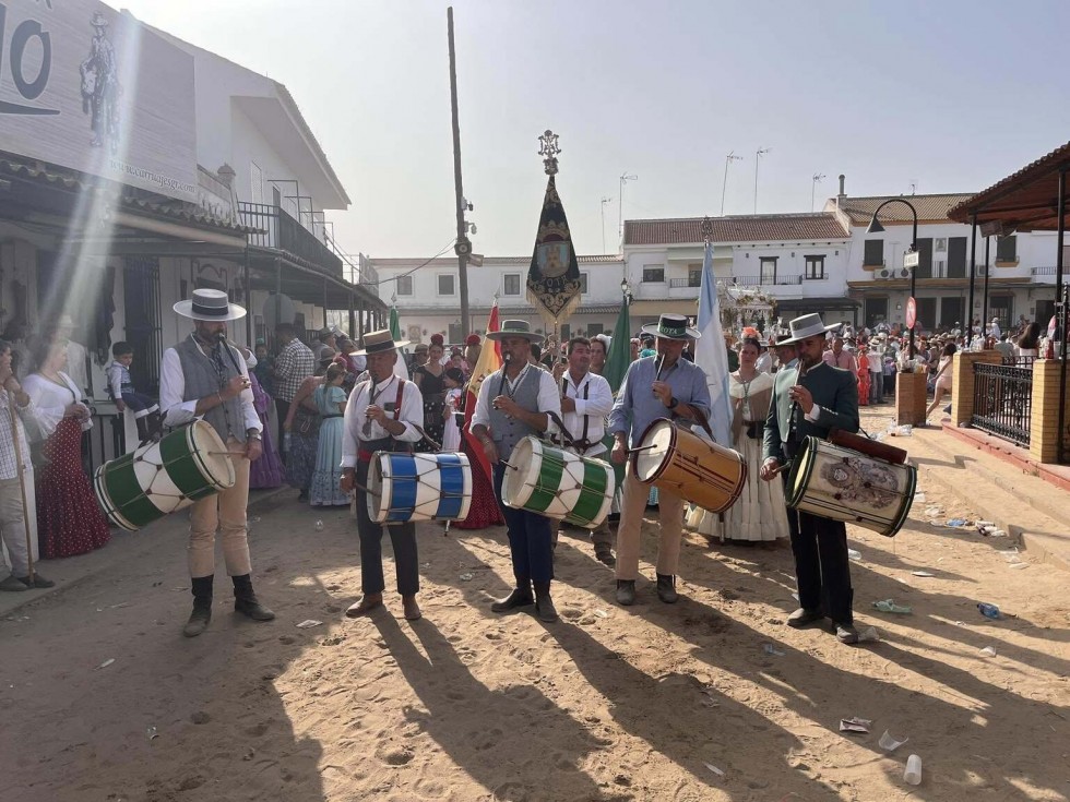 La Hermandad del Rocío de Rota, en su casa de la aldea, cuya fachada replica la Torre de la Merced, quiso ayer tener un detalle con el pitero Juan Carlos Gómez, al que homenajeó por sus 30 años acompañando con su pito de caña a la hermandad.