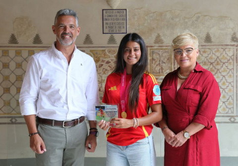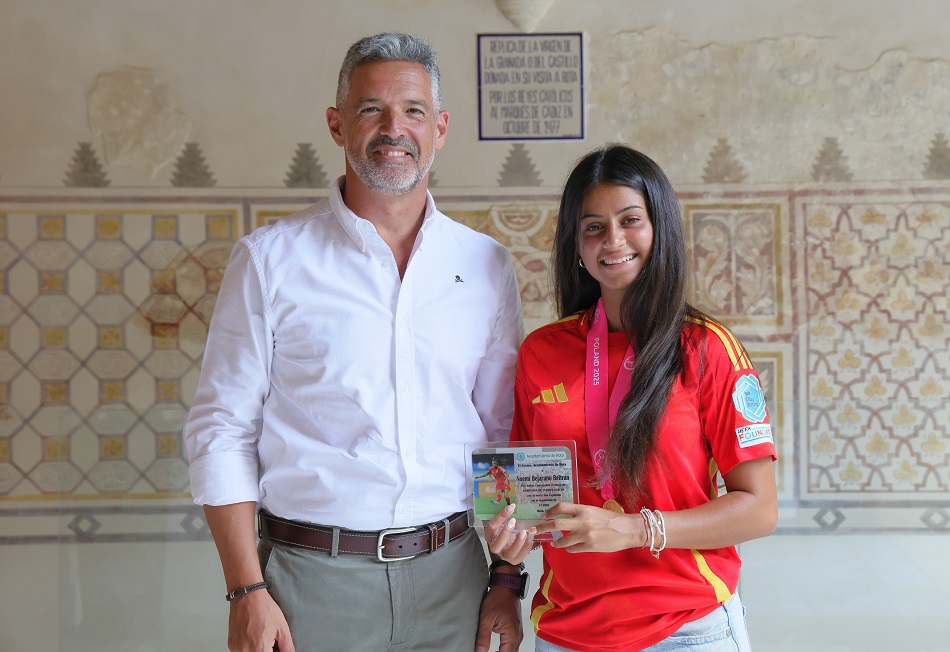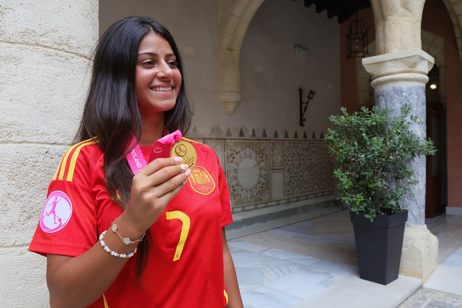 Este jueves, el alcalde de Rota, Javier Ruiz Arana, ha recibido en el Palacio Municipal Castillo de Luna a la jugadora roteña, Noemí Bejarano, que hace tan solo unos días se proclamó campeona de la Eurocopa con la selección española Sub 19.