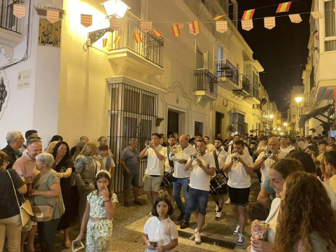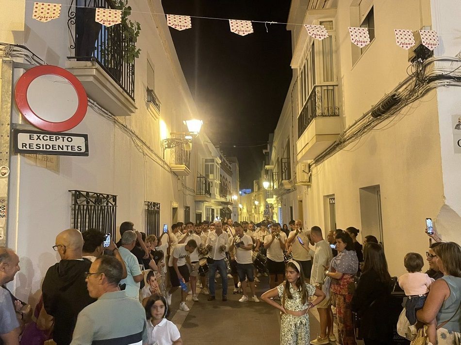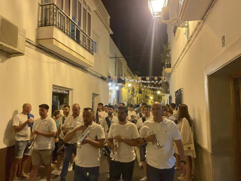 La banda de música de la Hermandad del Nazareno fue la protagonista de esta velada en la que se pudieron escuchar varias marchas procesionales no solo en este punto, a las puertas de la casa de hermandad, sino que hubo momentos en los que se trasladaron a calles adyacentes del centro para llevar la música más allá y con ello, contribuir al ambiente.