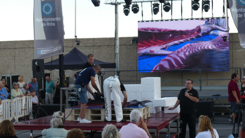 La explanada del muelle deportivo de Rota acogió en la tarde de ayer un nuevo ronqueo de un atún. Un espectáculo culinario que pudieron disfrutar muchos roteños y visitantes que se acercaron para ver en directo cómo se despieza un atún rojo de almadraba al estilo tradicional.