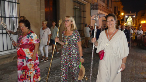 Coincidiendo con el festivo de la Asunción, los roteños y visitantes que profesan su fe a la virgen del Rocío tuvieron la oportunidad un año más de acompañarla por un recorrido que comenzó pasadas las 21.00 horas desde la parroquia de Nuestra Señora del Carmen.