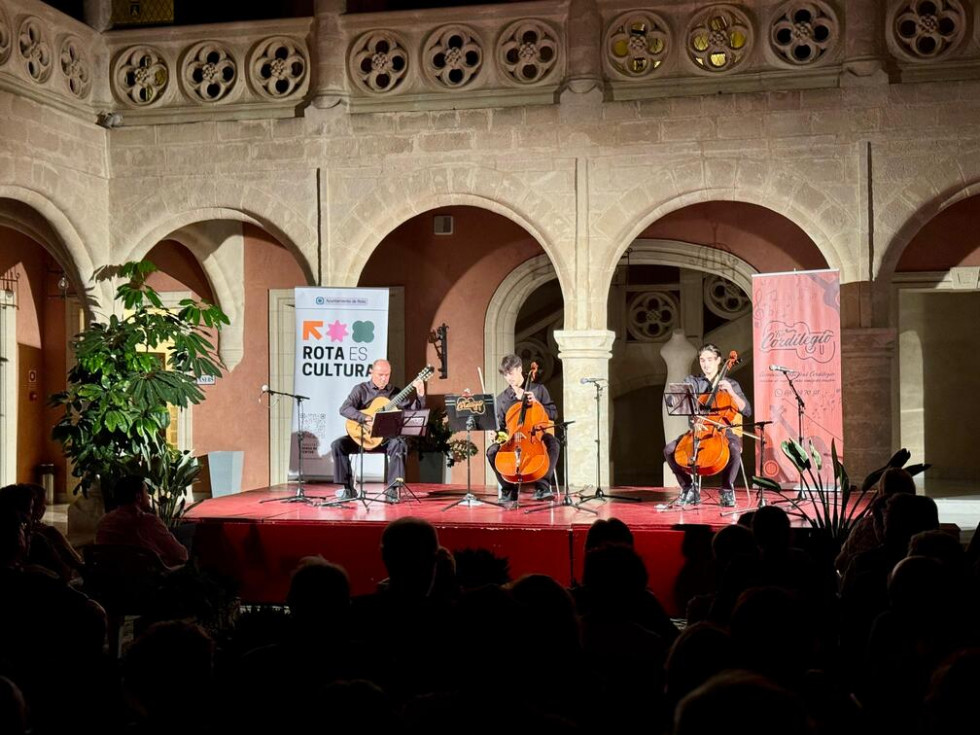 El “Trío Cordilegio”, que se ha hecho un merecido hueco en las programaciones del Verano Cultural de Rota, está compuesto por Pablo y Francisco Linares Rodríguez, dos hermanos estudiantes de violonchelo con una gran trayectoria en los estudios del grado Superior de Música, y su padre, Francisco José Linares, profesor de Guitarra Clásica.