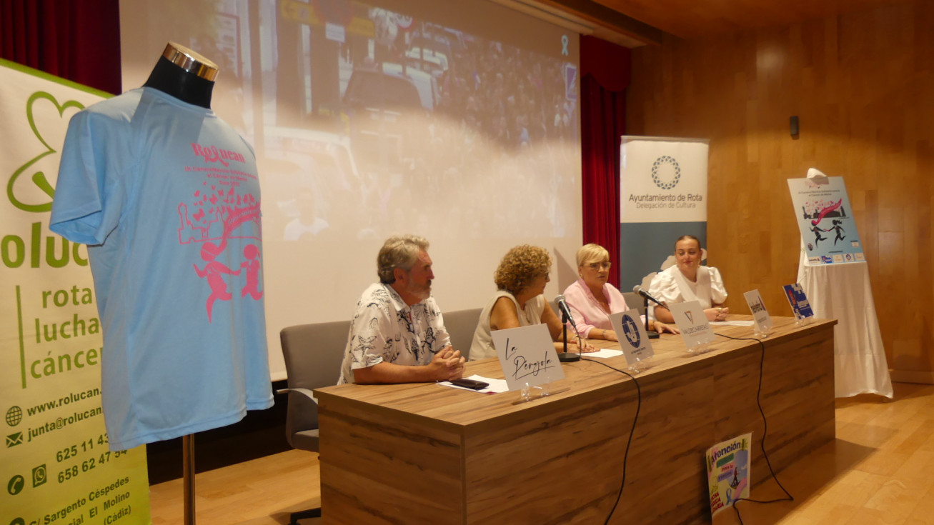 La presidenta de Rolucan, Patro Peña, la delegada de Deportes, Luisa Fernández, el técnico de Deportes, Manuel Ruiz-Mateos, y la autora del cartel y diseño de la imagen de esta carrera y marcha, Miriam Cordero Bernal, han formado la mesa desde la que se ha invitado una vez más a participar en una cita que apoya la lucha contra el cáncer de mama y a quienes pasan por un proceso oncológico.