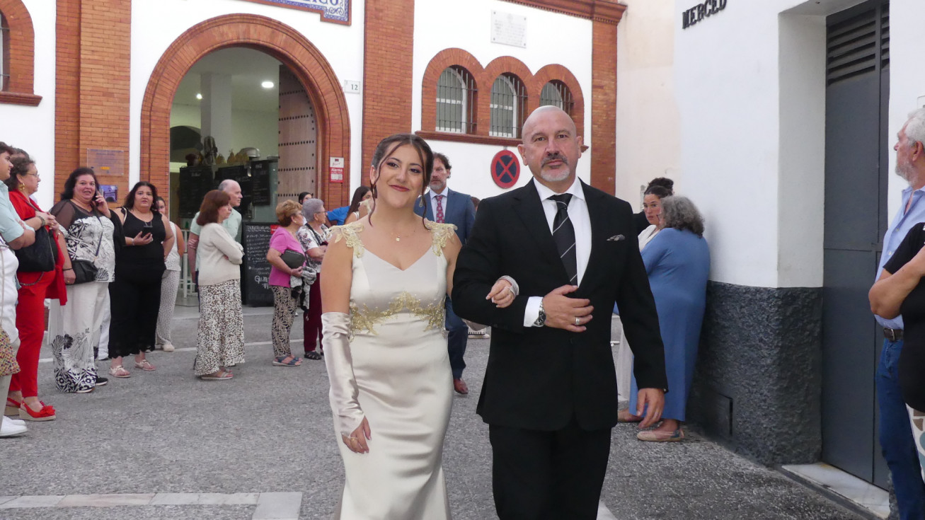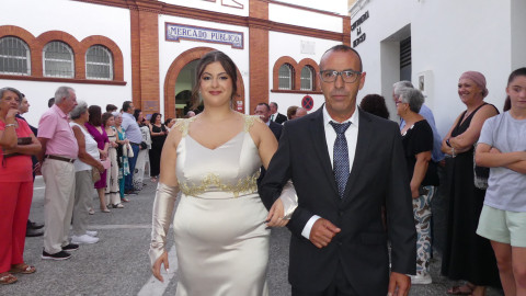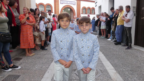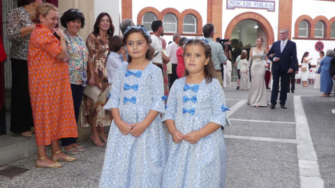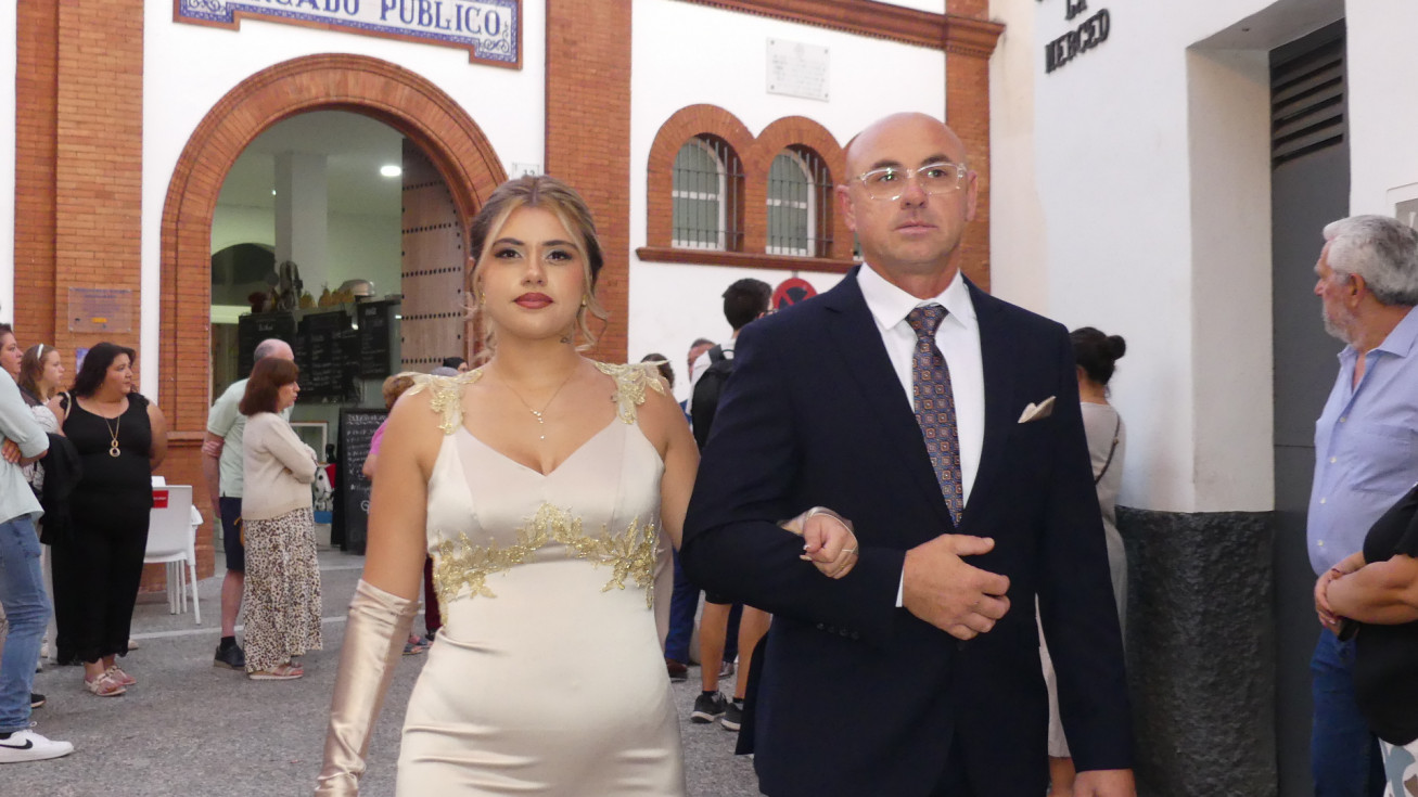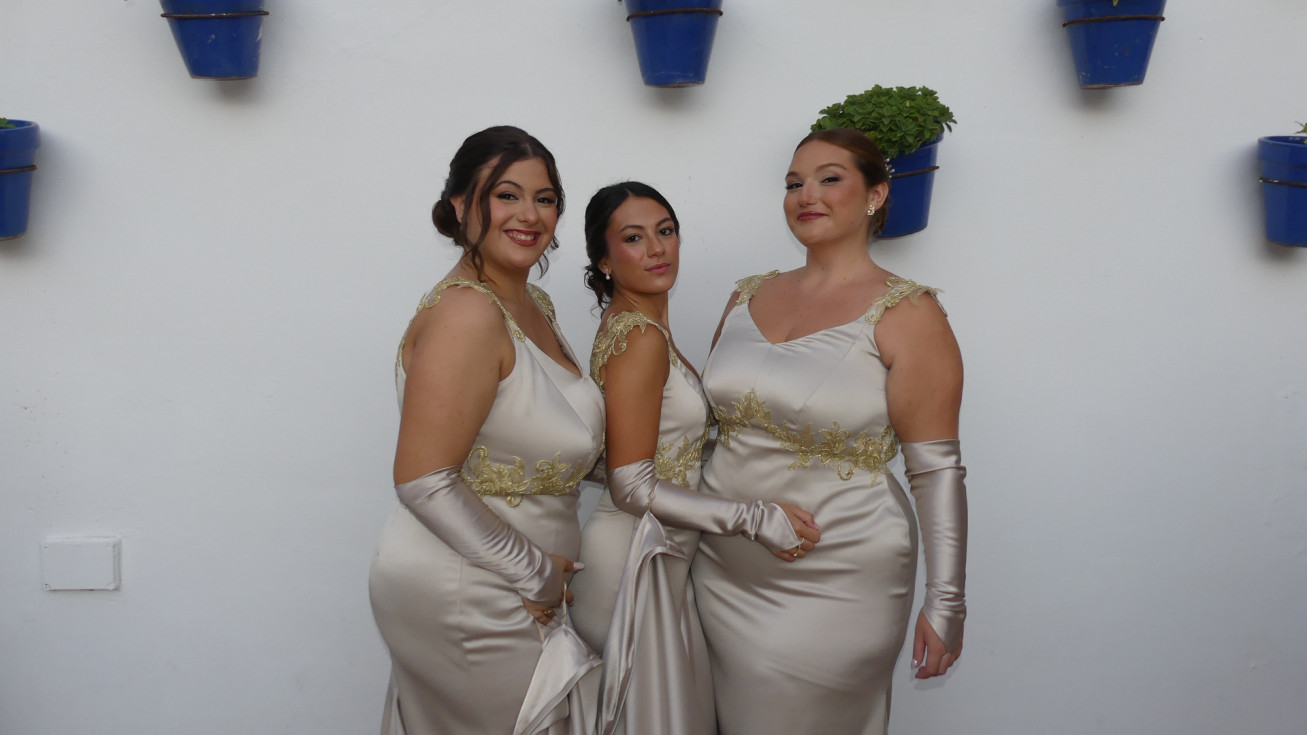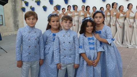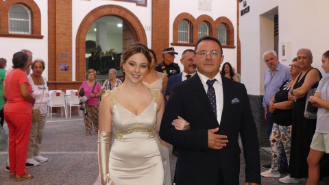 Desde minutos antes de las 8 de la tarde, en la plaza de la Merced, ya se podía vivir esa mezcla de curiosidad de unos y nerviosismo y alegría de otros. Las damas del Rosario y los seis pajes que dan el toque infantil, iban llegando y con ello, desvelando uno de los secretos del día, el diseño del traje que lucen, que en esta ocasión, ha cambiado el color blanco por el champagne, apostando su diseñadora Mercedes Moreno por un vestido con algo de cola, escote de pico por delante y por detrás y detalles de pasamanería para la tiranta y espalda. Los pajes, de color celeste.