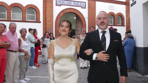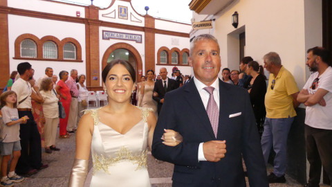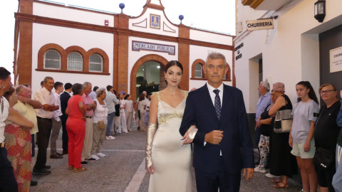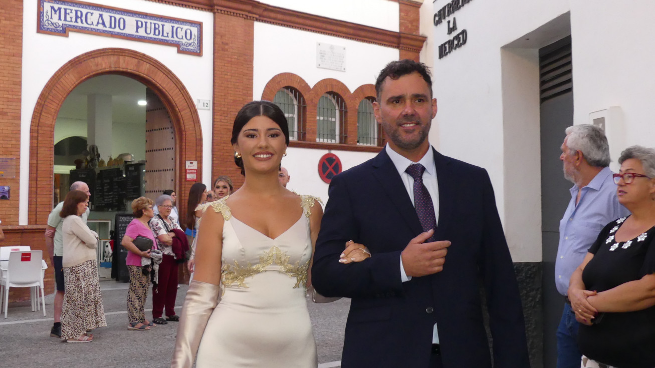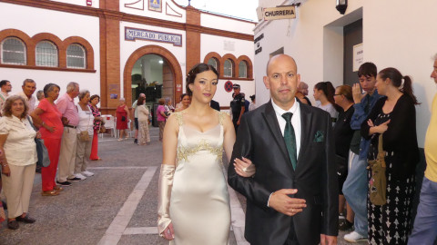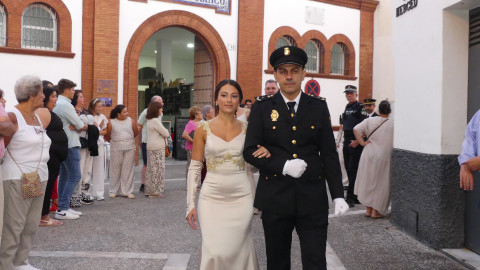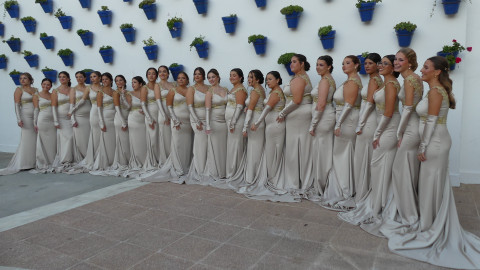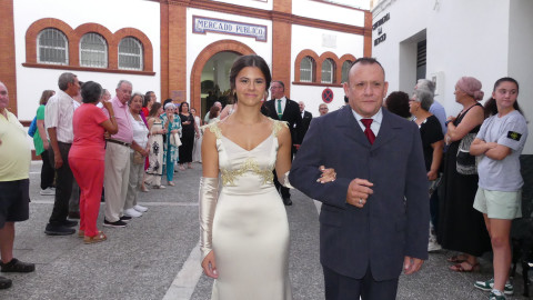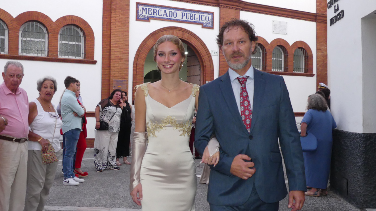 Desde minutos antes de las 8 de la tarde, en la plaza de la Merced, ya se podía vivir esa mezcla de curiosidad de unos y nerviosismo y alegría de otros. Las damas del Rosario y los seis pajes que dan el toque infantil, iban llegando y con ello, desvelando uno de los secretos del día, el diseño del traje que lucen, que en esta ocasión, ha cambiado el color blanco por el champagne, apostando su diseñadora Mercedes Moreno por un vestido con algo de cola, escote de pico por delante y por detrás y detalles de pasamanería para la tiranta y espalda. Los pajes, de color celeste.