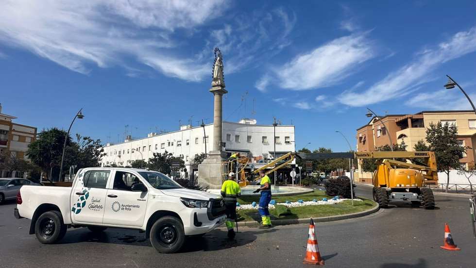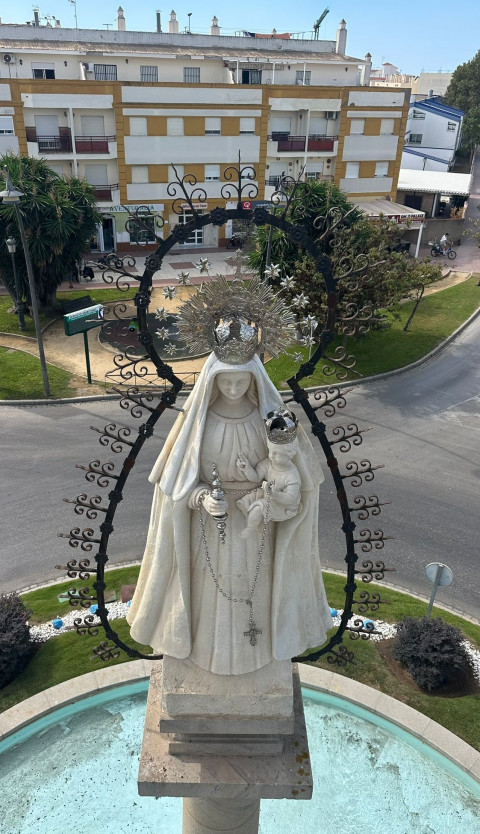 En estos días en los que Rota celebra las fiestas en honor a su patrona, esta imagen de la virgen que da la bienvenida a todo el que entra en la localidad por la A-2075 luce esplendorosa tras los trabajos que permiten que haya mejorado algunas piezas que por el paso del tiempo presentaban algunas deficiencias propias de estar a la intemperie.