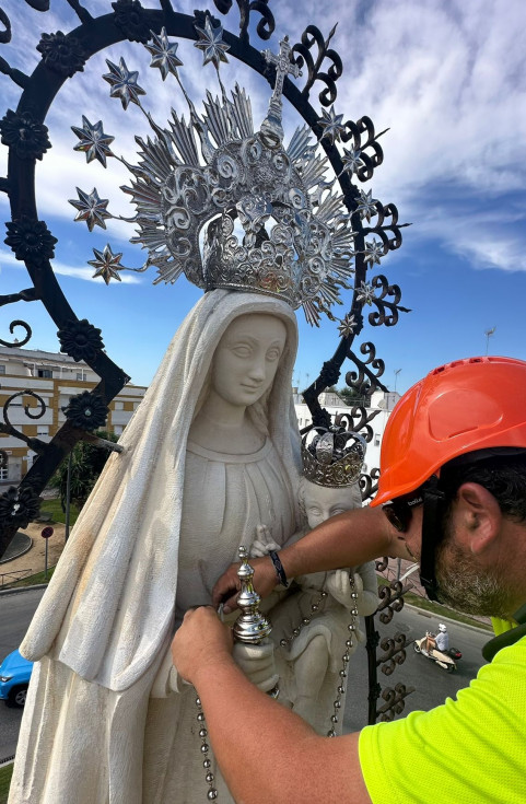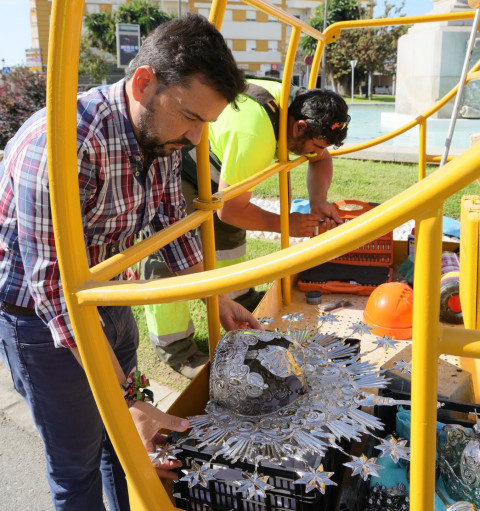 Esta mañana, personal de la delegación de Parques y Jardines se ha encargado de colocar estos ornamentos a la virgen estando presente el delegado responsable, Jesús López, que tenía especial interés en que el día de la patrona, esta imagen de Nuestra Señora del Rosario luciera completa.
