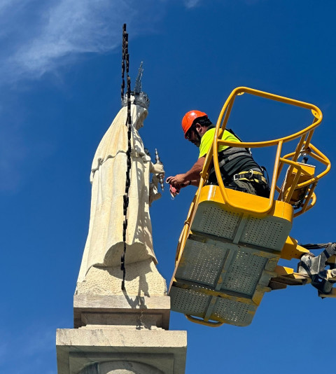 La imagen de Nuestra Señora del Rosario que corona la gran rotonda y fuente de la plaza del Triunfo vuelve a lucir desde esta mañana completa una vez que desde la delegación de Parques y Jardines se ha procedido a colocar la corona de la virgen y del niño Jesús que se retiraron para someterla a un proceso de restauración.