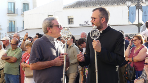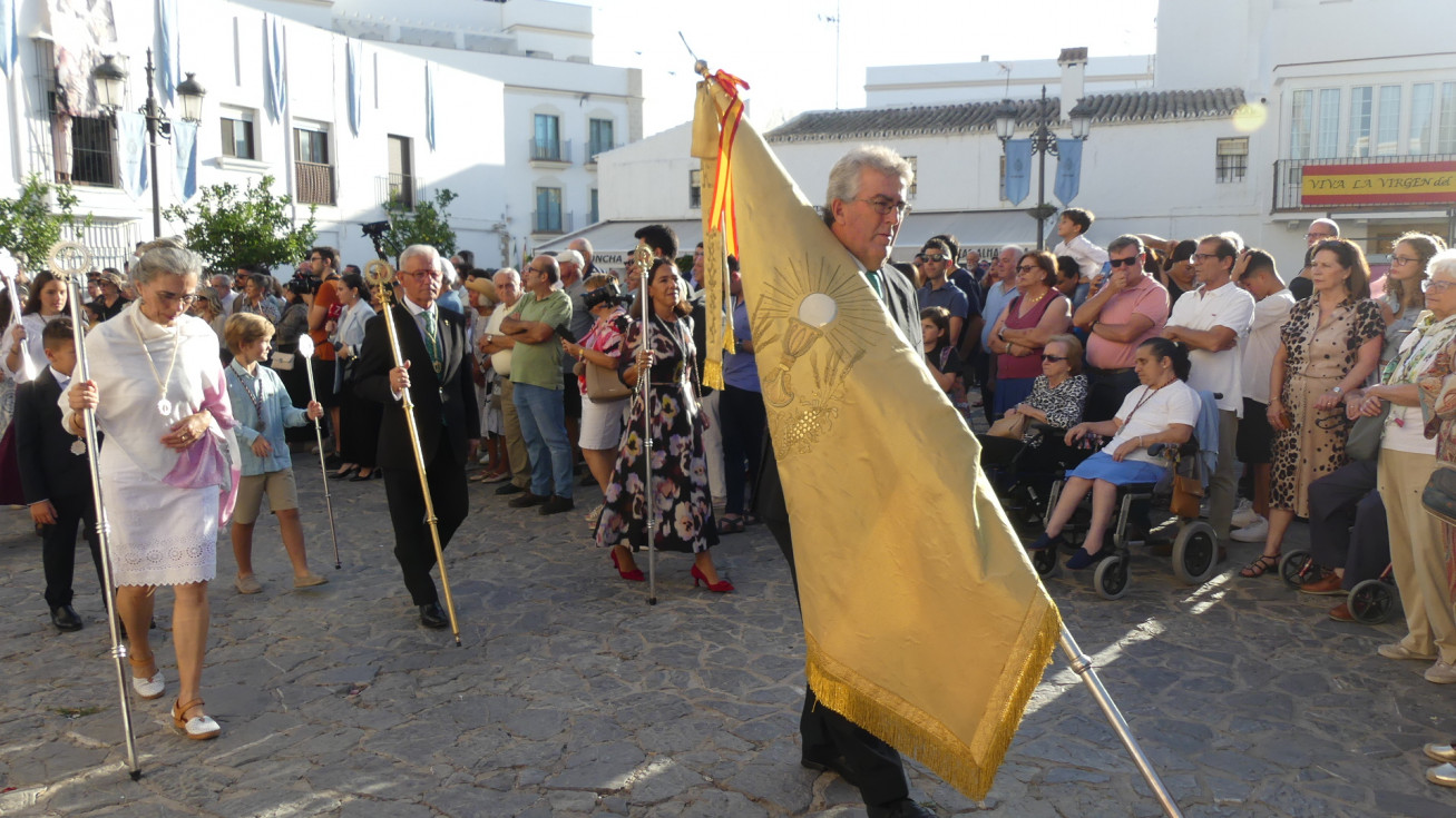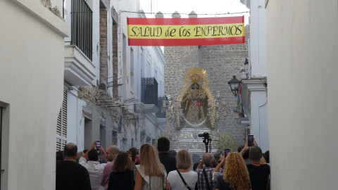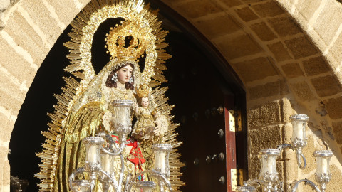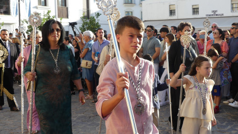 El repique de campanas a las seis y media de la tarde desde la parroquia de Nuestra Señora de la O anunciaba la salida procesional de la patrona y con ella, una tarde en la que el casco histórico ha dejado una estampa muy concurrida con devotos a pie de calle para verla en su día. Lo han hecho también roteños en general y visitantes que han querido sumarse a disfrutar del paso de esta imagen del siglo XVI, de autor desconocido, que en 1951 recibió el título de Alcaldesa Honoraria Perpetua, siendo coronada canónicamente en 2003. Precisamente, Nuestra Señora del Rosario lucía hoy la corona de oro de su coronación canónica y estrenaba la restauración de la ráfaga en forma de “ocho”, tal y como fue labrada por el orfebre Seco Velasco en 1960.