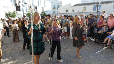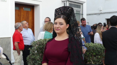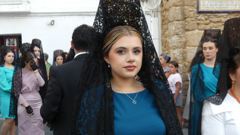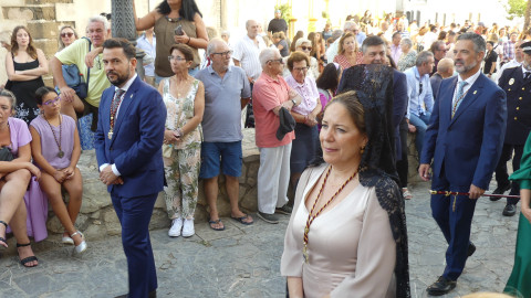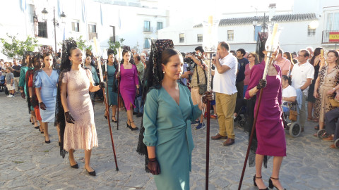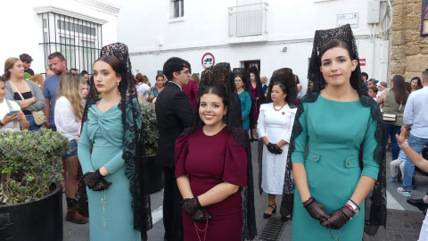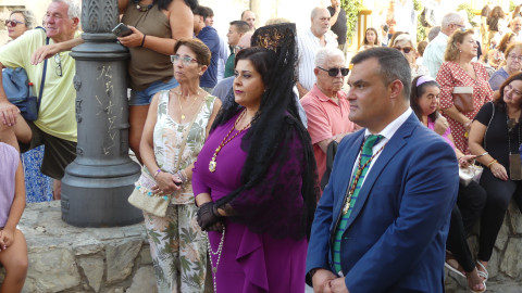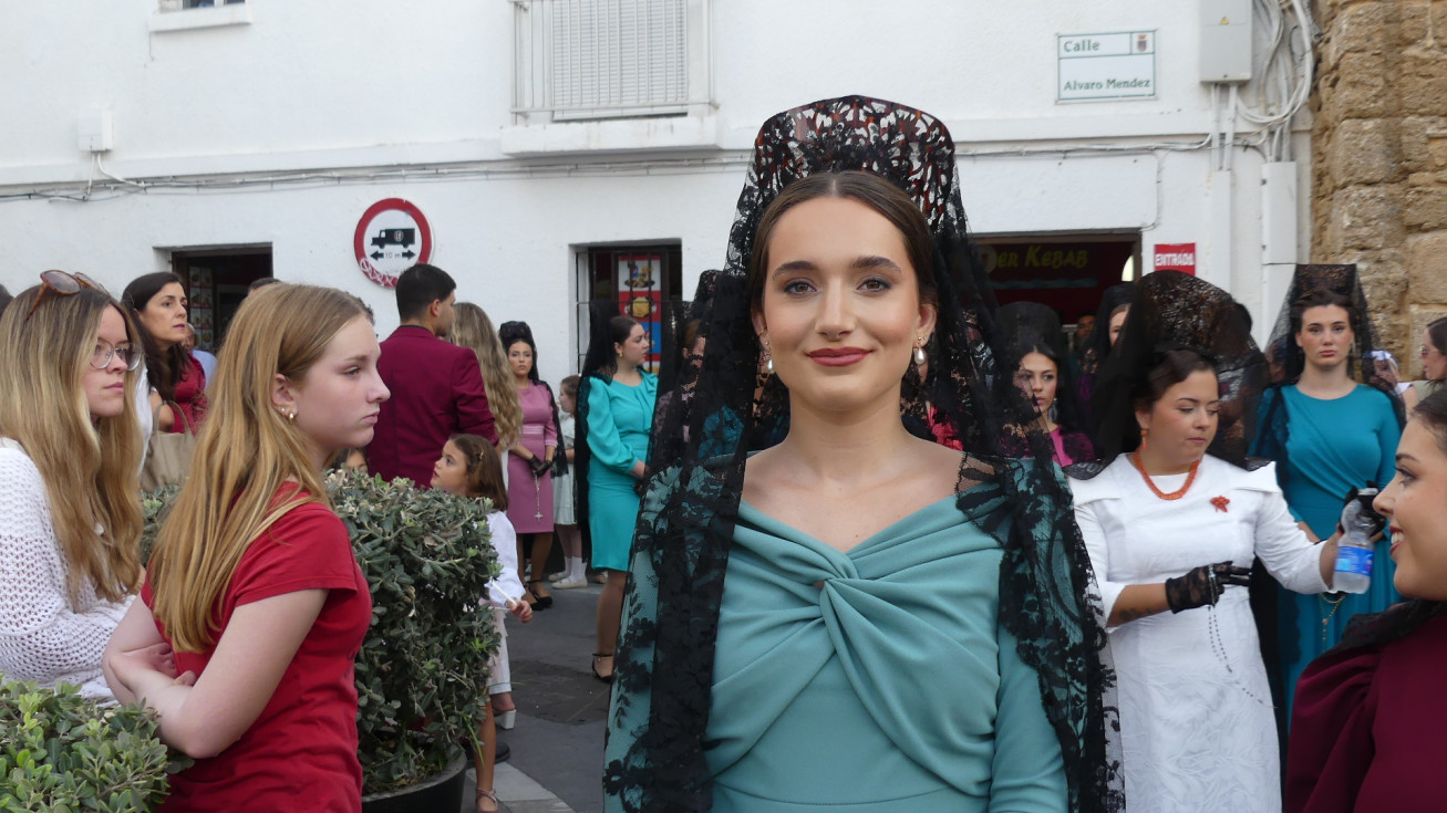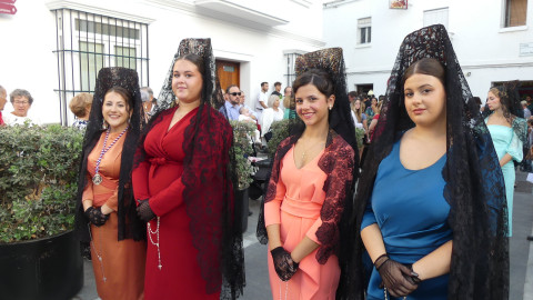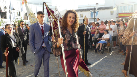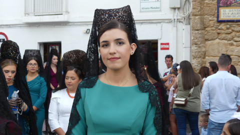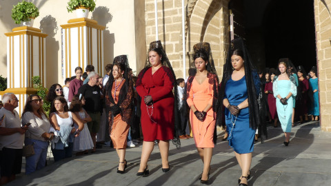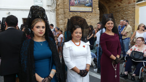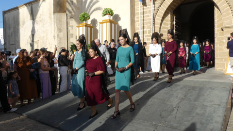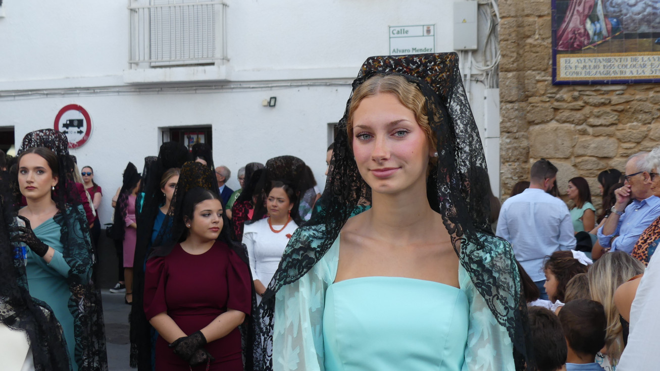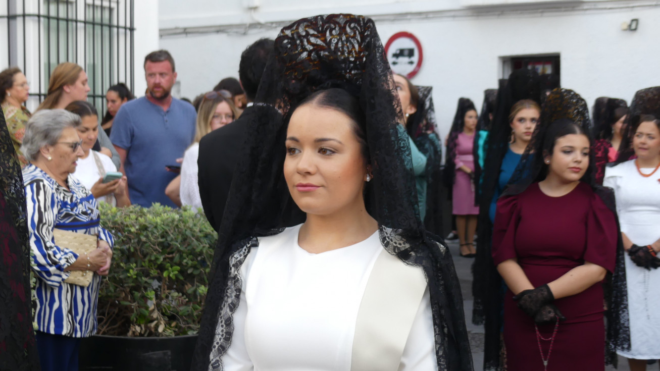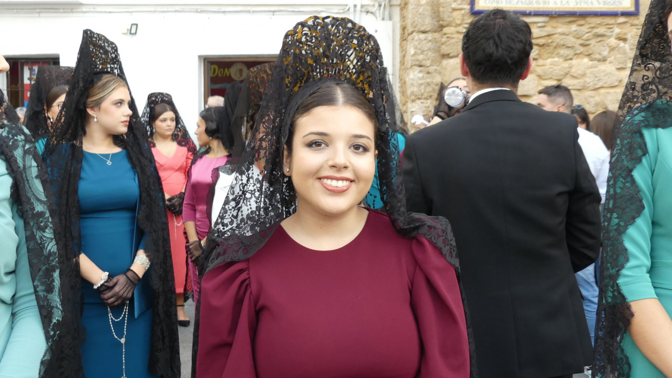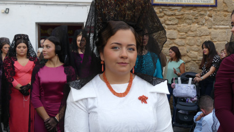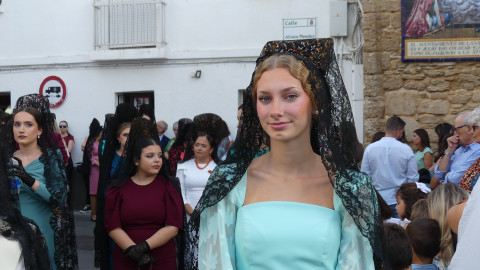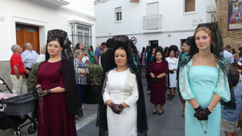 En su cortejo, como es habitual, la arropaban las 28 damas del Rosario, con la dama mayor Paola Álvarez Caballero a las que este año se sumaba un grupo de damas del año pasado sumándose a una celebración que ya vivieron con intensidad y que han querido repetir junto a su patrona.