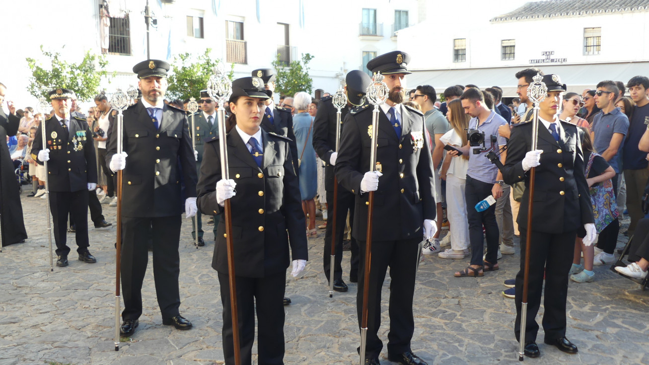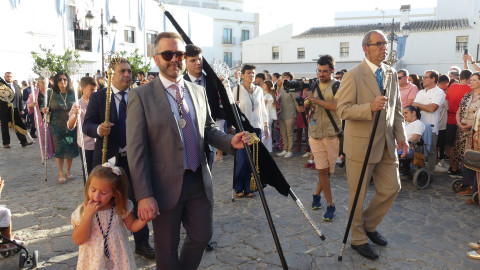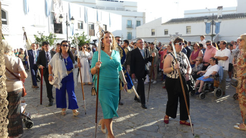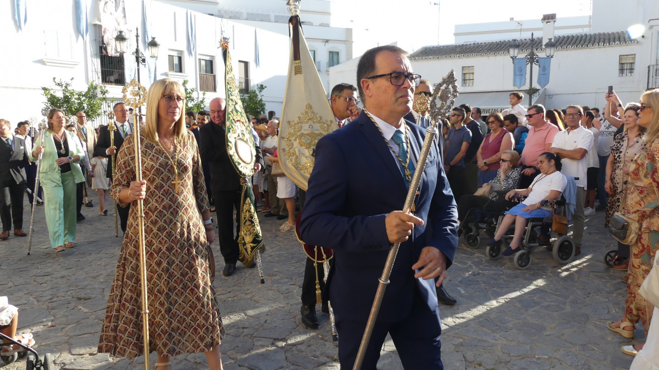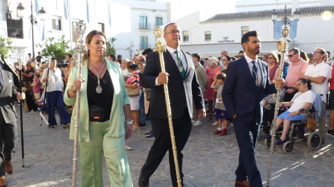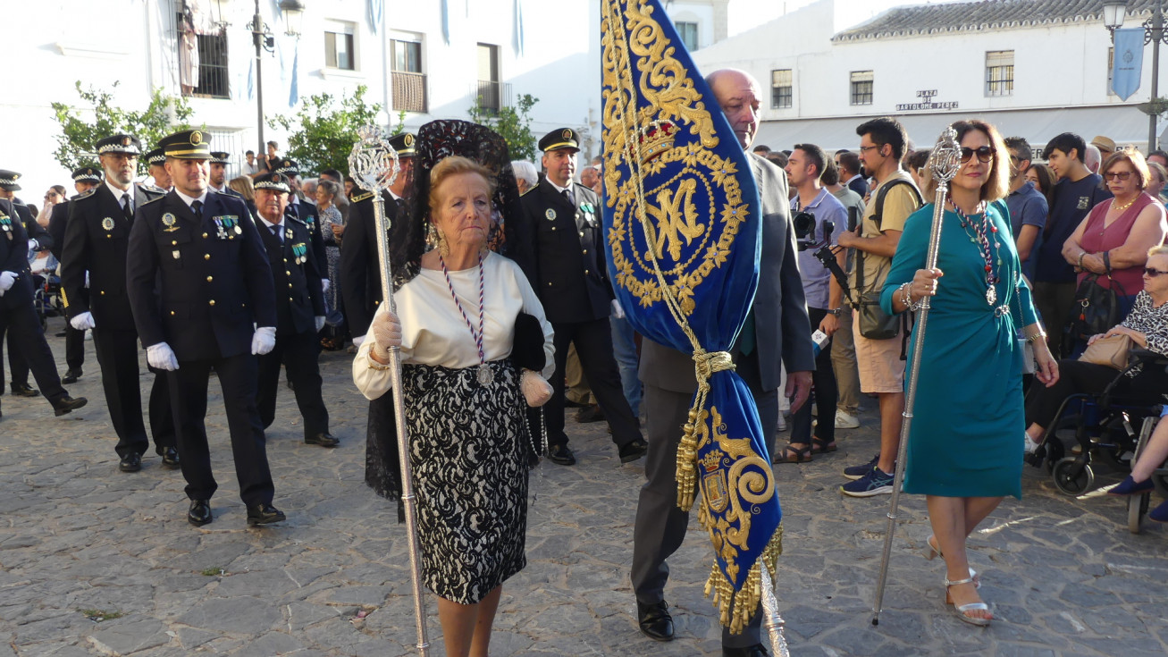 Tras ella, que mostraba el bastón de mando como alcaldesa honoraria de la villa a sus pies, procesionaba bajo maza la Corporación municipal de Rota con el alcalde de Rota, Javier Ruiz.