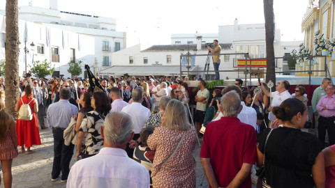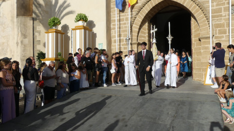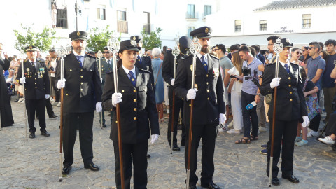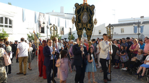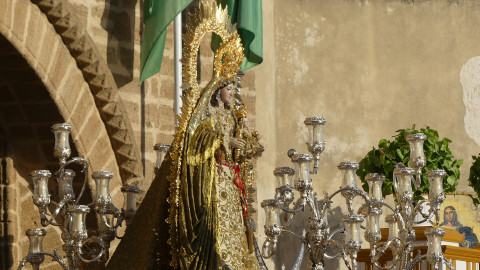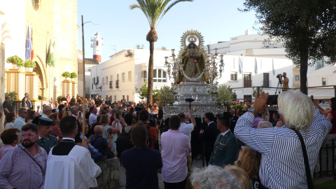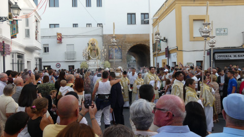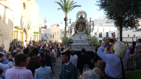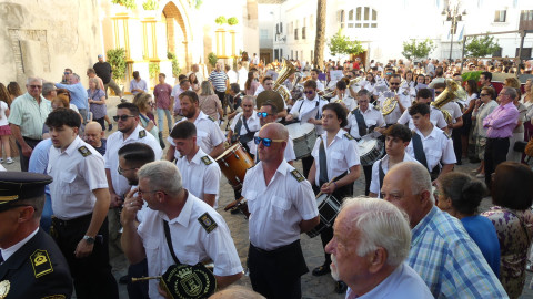 El paso, que procesionaba escoltado por una pareja de agentes de la Benemérita, avanzaba a los acordes de la banda municipal de música "Maestro Enrique Galán" que se ha encargado de poner los acordes a esta procesión como viene haciéndolo al menos, desde 1883, año en el que se tiene constancia de que esta formación musical ya acompañaba a la patrona de Rota.
