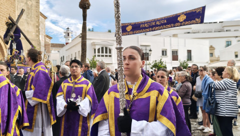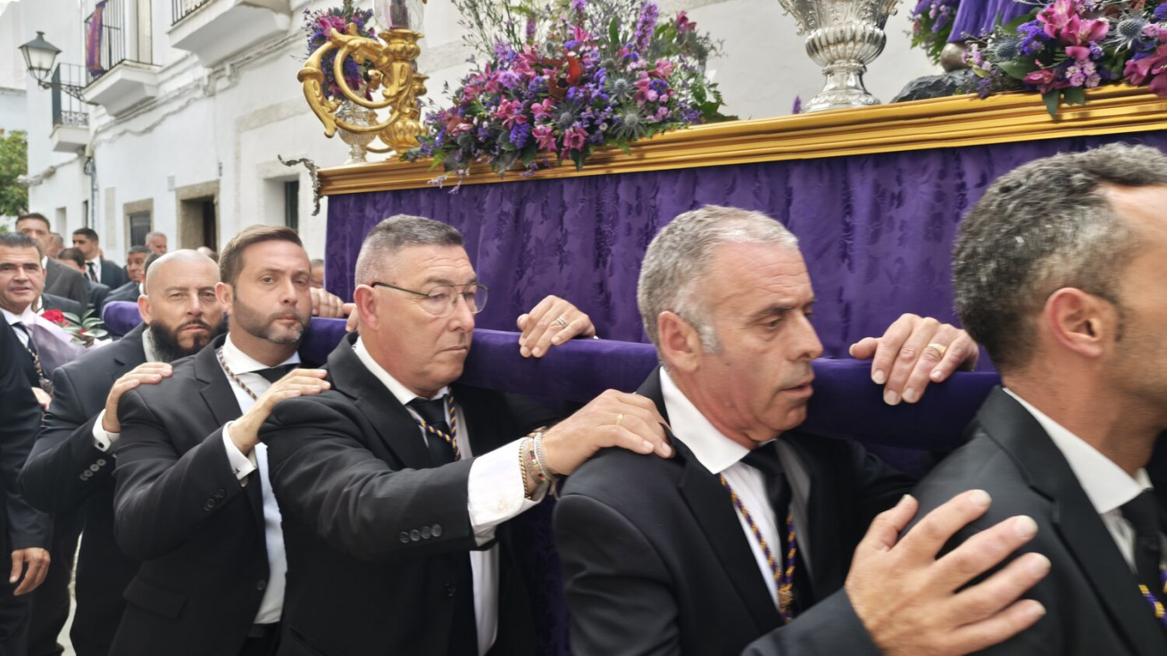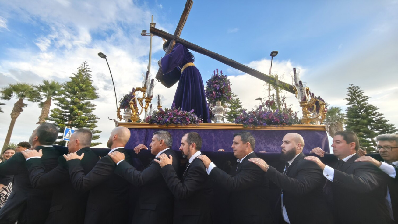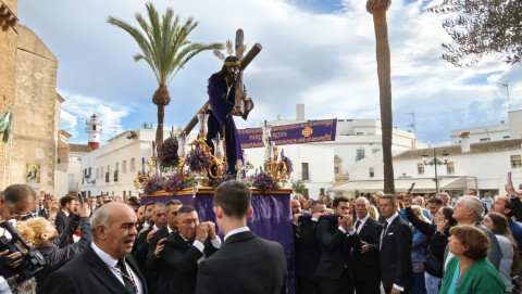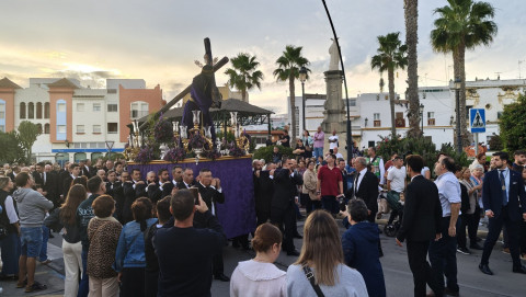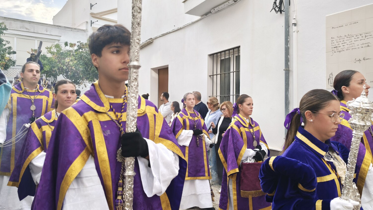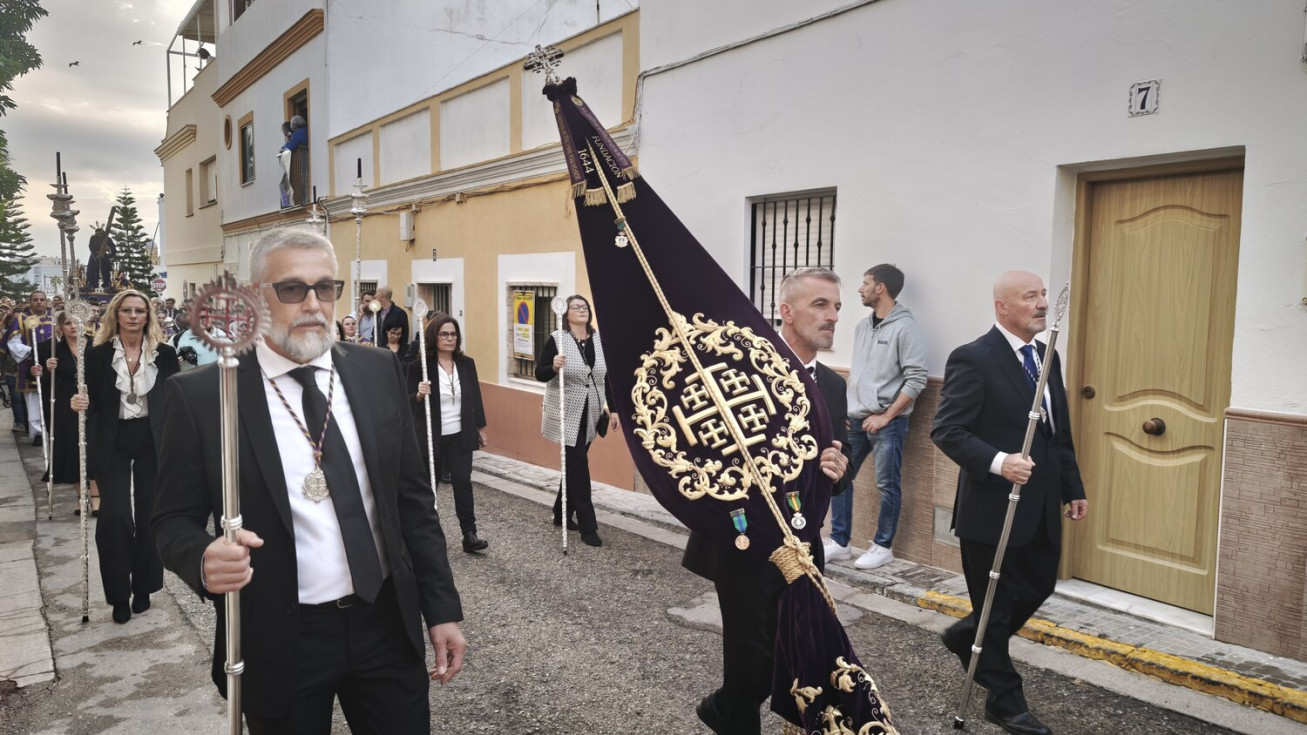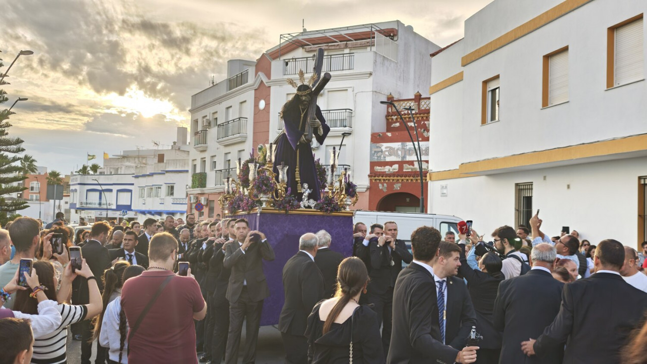 Cargado por su cuadrilla de costaleros en parihuela, luciendo la túnica antigua de cola de los años 60 en color morado y estrenando la cruz arbórea bendecida ayer y donada por una familia de Rota, el Señor ha caminado a paso ligero con la intención de poder completar el recorrido previsto desde el principio y no dejar a los vecinos de este barrio con las ganas de verlo pasar por sus casas. La tarde se desarrollaba con normalidad, con mucho público en las aceras pero también una buena representación tras la imagen, pero a medida que fue oscureciendo, el cielo fue tornando y cuando entraba por la calle Luis Ponce de León, especialmente engalanada para la ocasión, comenzaban a caer las primeras gotas.