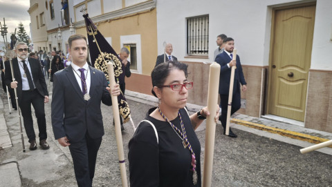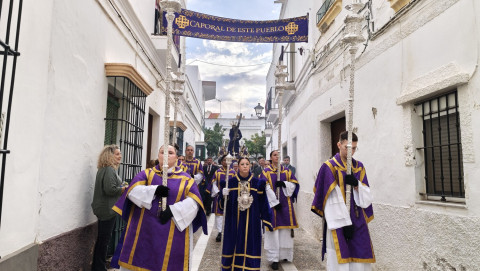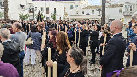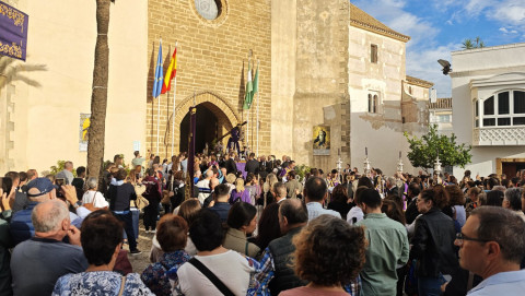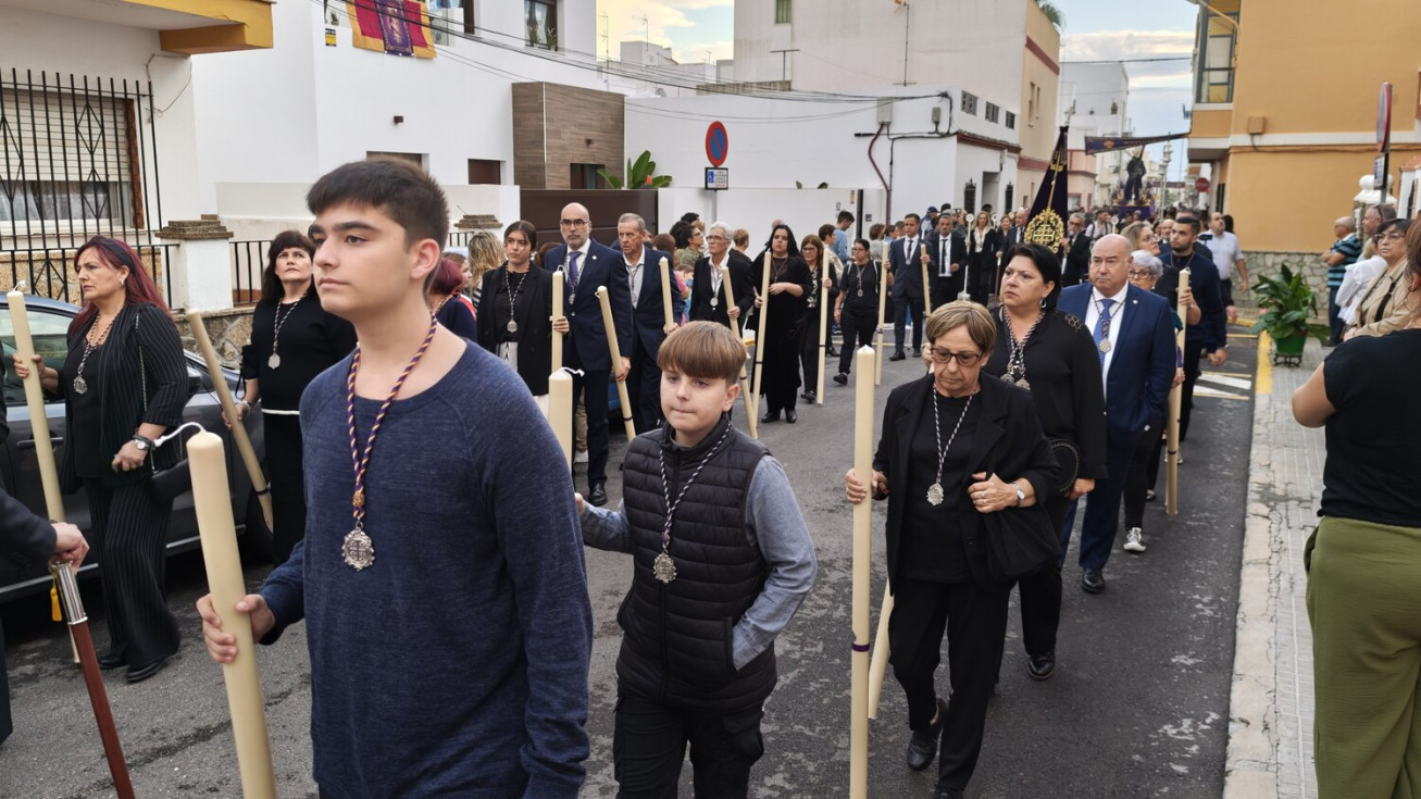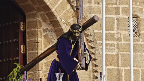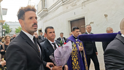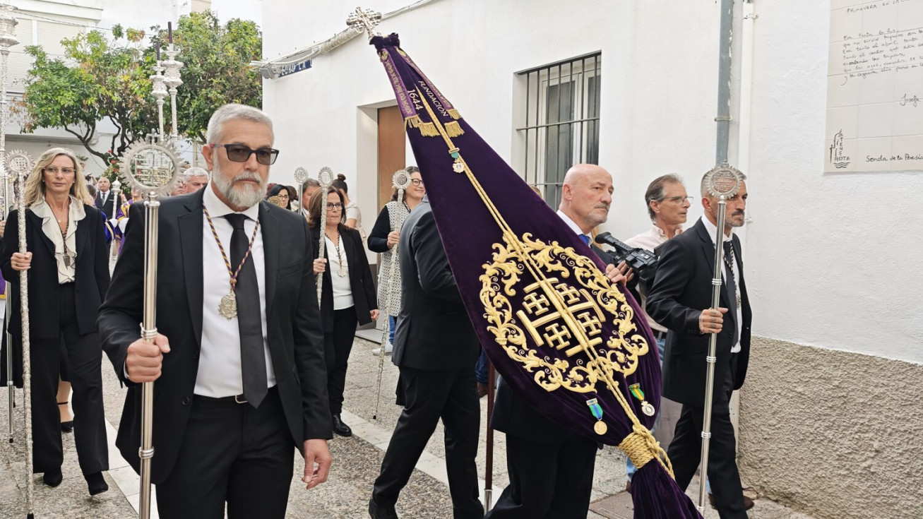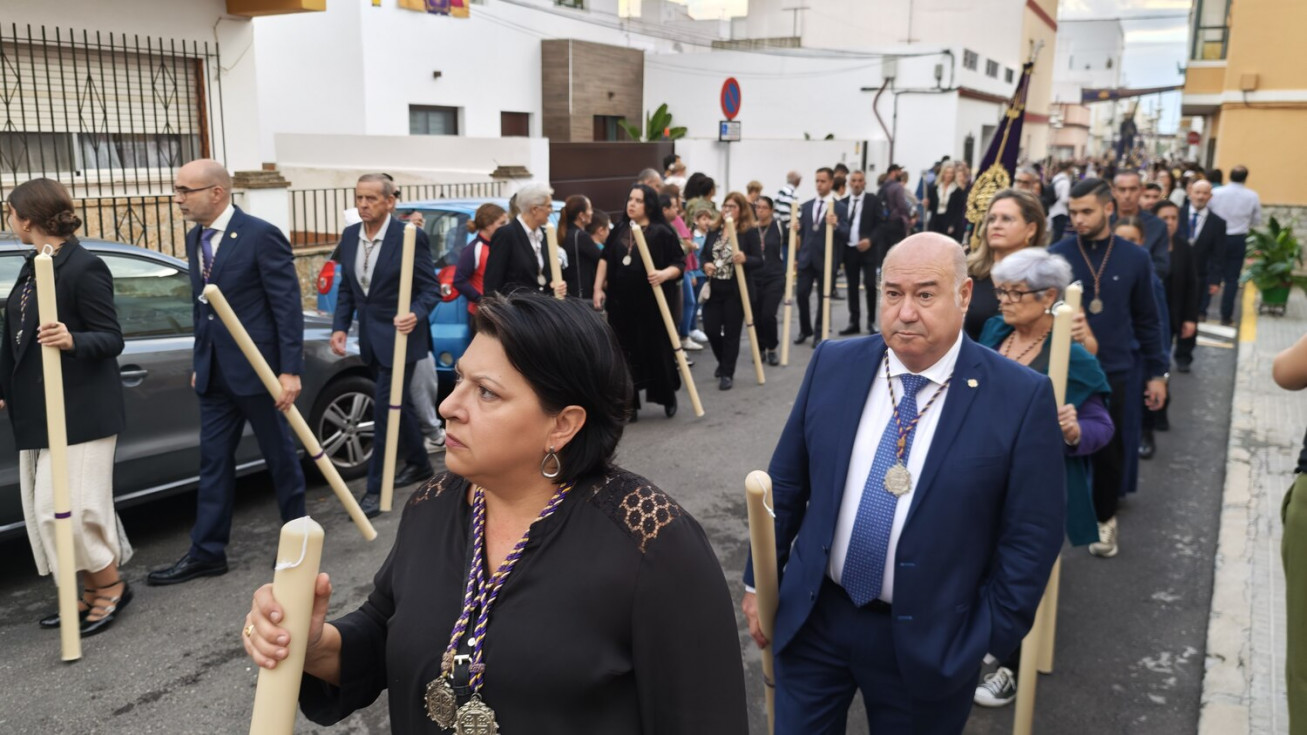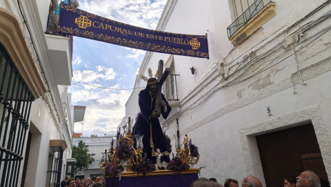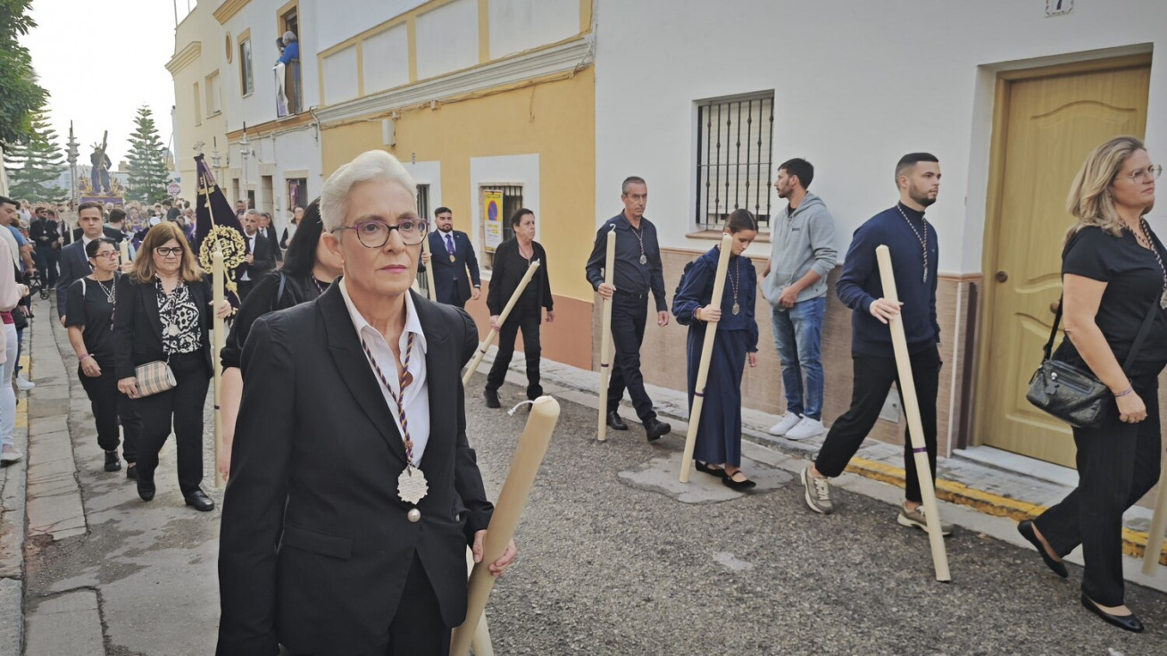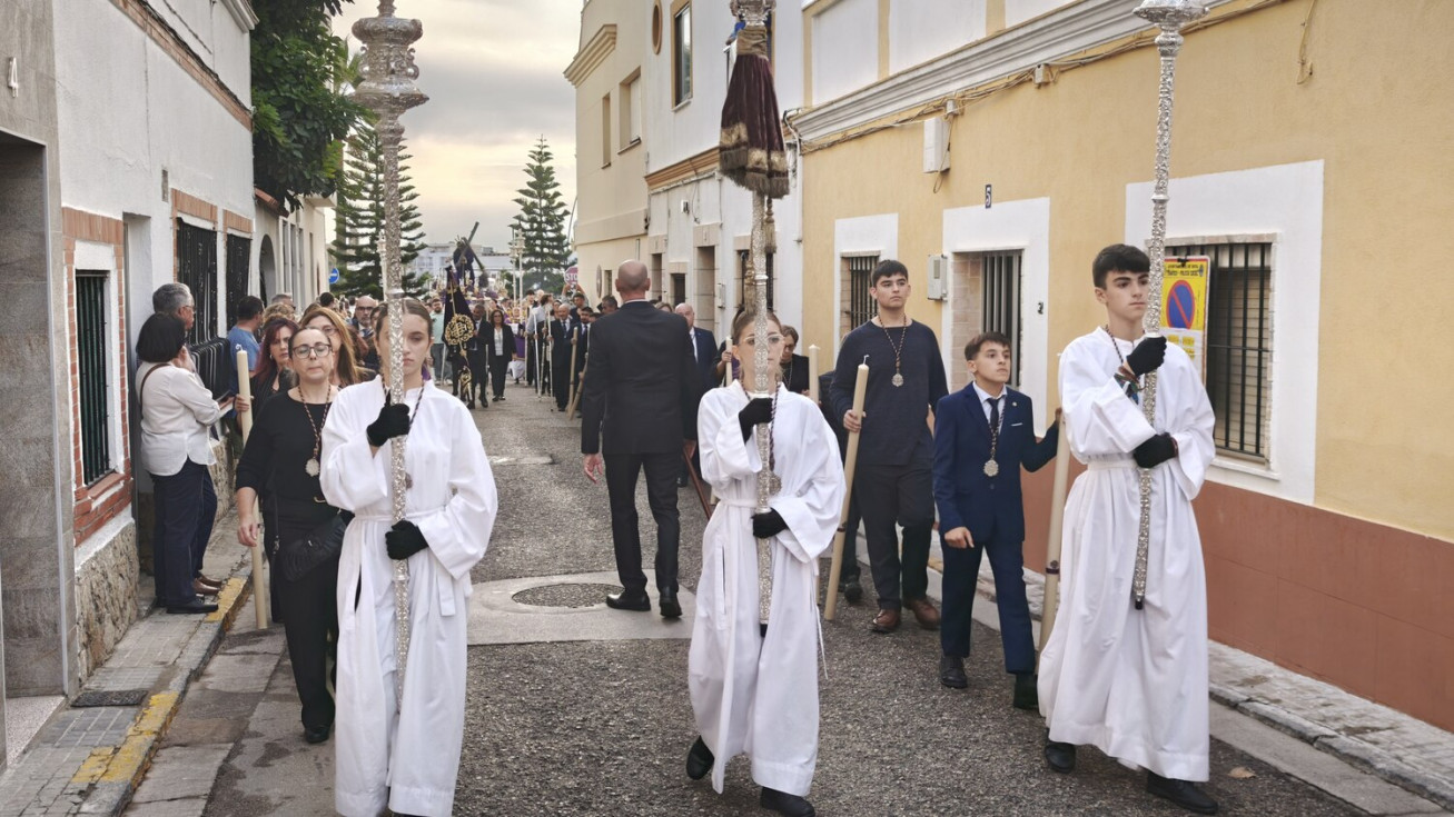 Cargado por su cuadrilla de costaleros en parihuela, luciendo la túnica antigua de cola de los años 60 en color morado y estrenando la cruz arbórea bendecida ayer y donada por una familia de Rota, el Señor ha caminado a paso ligero con la intención de poder completar el recorrido previsto desde el principio y no dejar a los vecinos de este barrio con las ganas de verlo pasar por sus casas. La tarde se desarrollaba con normalidad, con mucho público en las aceras pero también una buena representación tras la imagen, pero a medida que fue oscureciendo, el cielo fue tornando y cuando entraba por la calle Luis Ponce de León, especialmente engalanada para la ocasión, comenzaban a caer las primeras gotas.