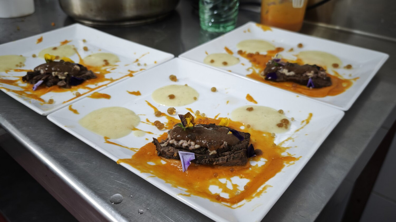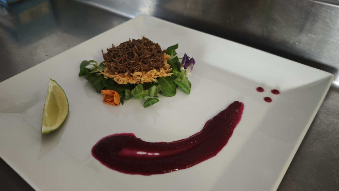 En esta ocasión, Mercedes Ruiz, que el año pasado fue la representante del IES Arroyo Hondo, ha elaborado un plato de birria sobre tosta de yuca con mayonesa de chipotle; en el caso de Pablo Ruiz, su plato era sangre y ámbar al oloroso; e Iker Rodríguez, competía con un ravioli de jarrete estofado.