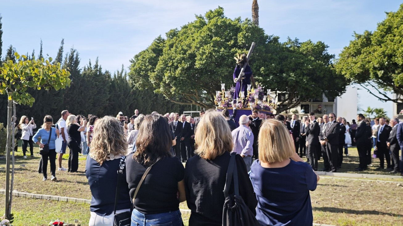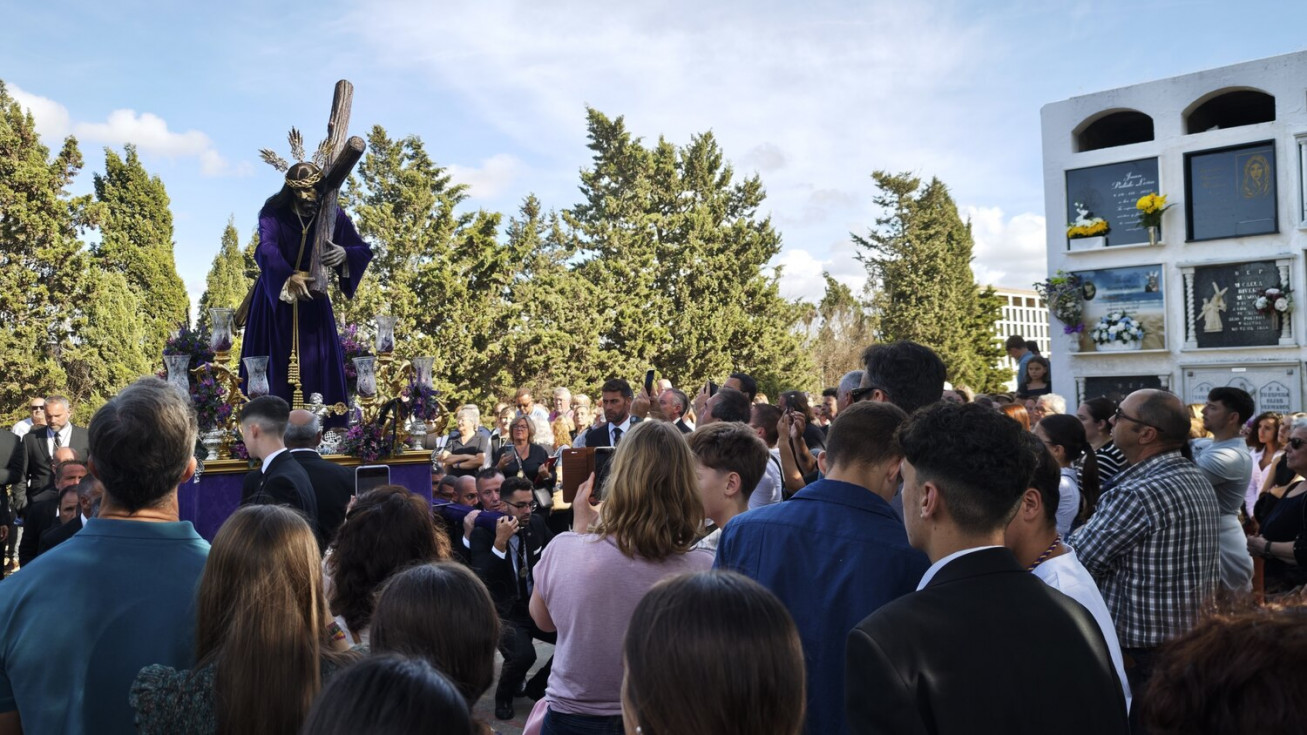 Durante todas las paradas realizadas, los ciudadanos que han permanecido en el cementerio han vivido momentos especiales, cada uno de una forma distinta, agradecidos por la oportunidad de ver al Señor de Rota en un espacio que siempre apena visitar porque recuerda la ausencia pero que hoy tenía un punto de alegría. La hermandad no ha dejado ningún rincón por recorrer, pasando por delante del 'Bosque de cenizas', con pequeños altares donde están las personas incineradas, y la zona de tumbas y panteones. La intención era repartir consuelo en esta misión evangelizadora y se ha cumplido.