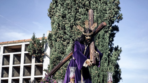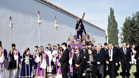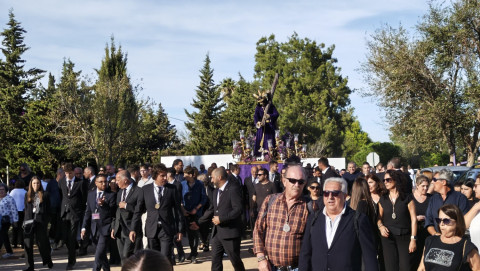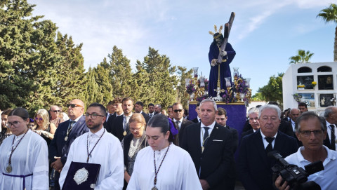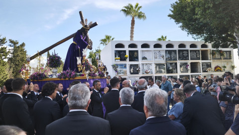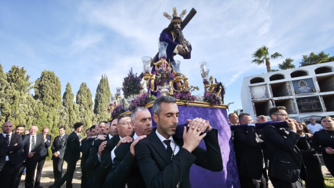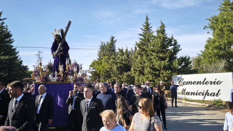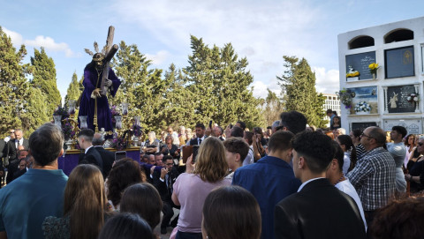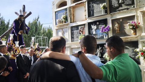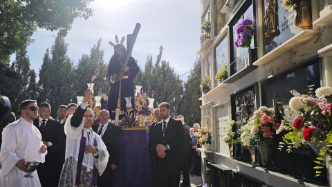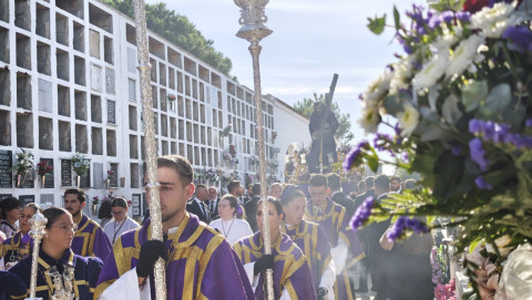 Pasadas las 14.30 horas, con los ciriales abriendo paso, el cuerpo de acólitos y una representación de hermanos nazarenos y junta de gobierno por delante de la parihuela, de nuevo cargada por los costaleros de Jesús, comenzaba la esperada procesión. Jesús Nazareno ha recorrido todo el perímetro del cementerio sin adentrarse en las calles del interior, pero ha parado en el extremo de cada una de ellas para rezar salmos, responsos y preces, y terminar con el final del 'Dies irae', secuencia principal de la misa de réquiem. Ha sido un momento de oración y recogimiento, pero sobre todo, de fe.