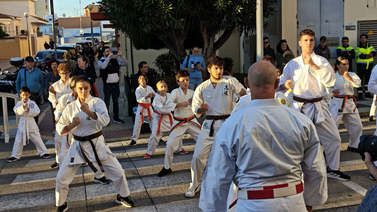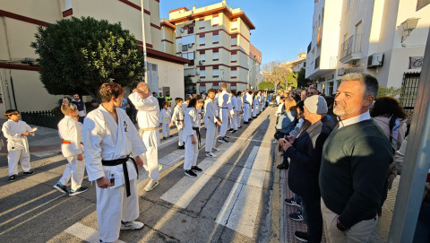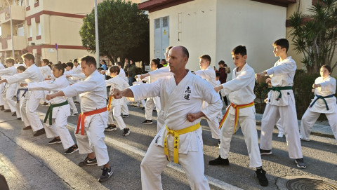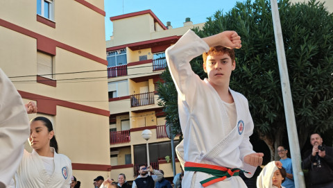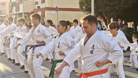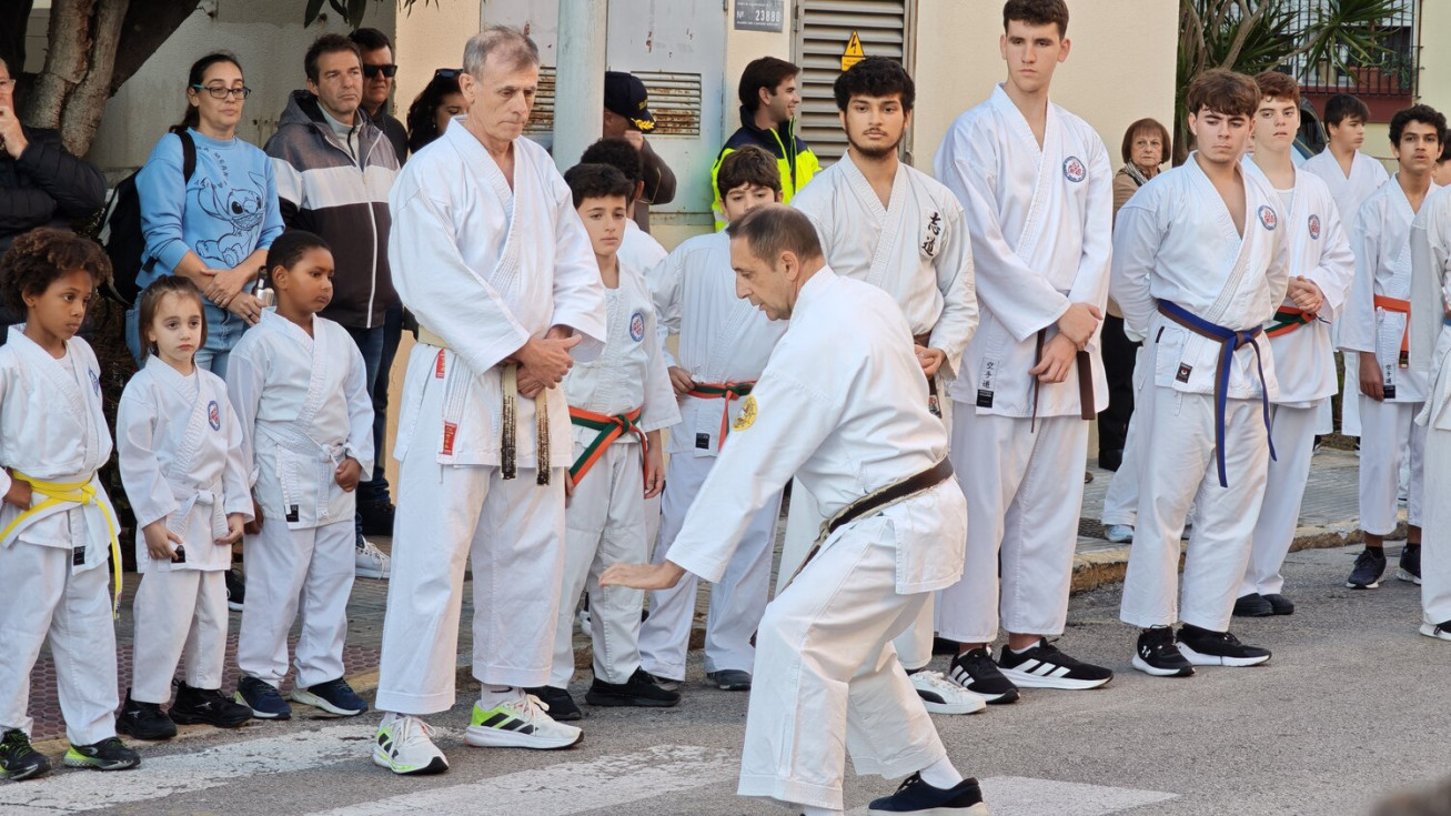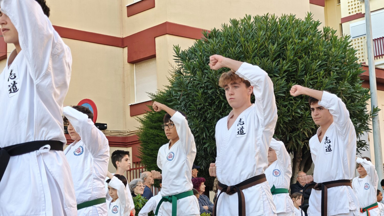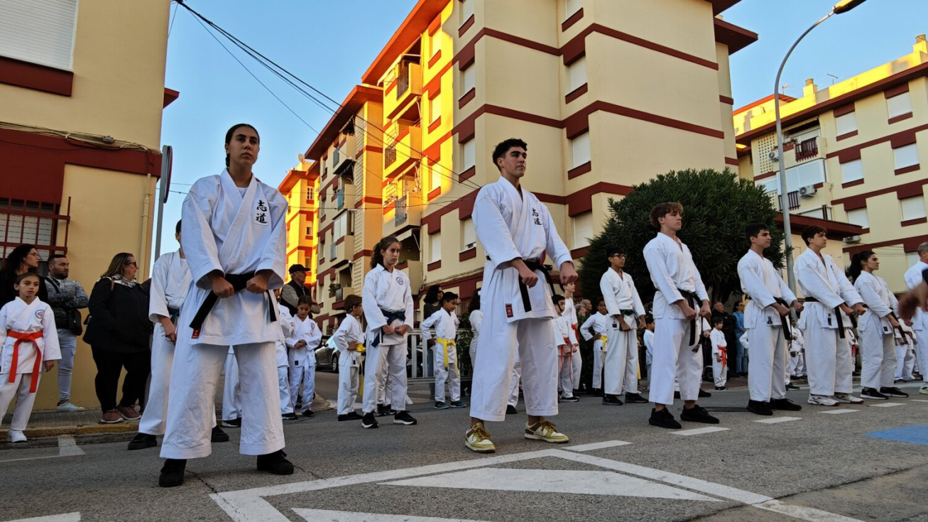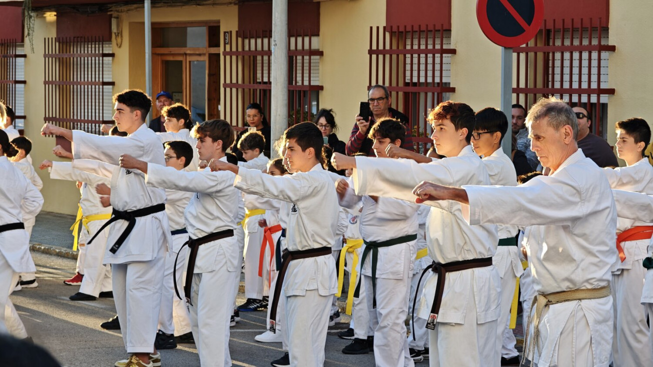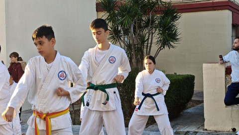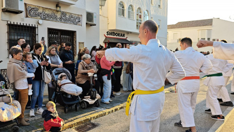 La calle Marconi fue ayer escenario de una exhibición de artes marciales protagonizada por los alumnos de la escuela de kárate de la asociación Okinawa Shorin Ryu Shidokan Shirasagi Escuela Chibana de Rota que ahora ha dado un paso más con la apertura del nuevo Dojo Tamashi. Ayer se inauguraba este nuevo espacio en la localidad, que pretende ser un referente de estas disciplinas y que se inauguró contando con lo más valioso que tiene, exhibir el aprendizaje de su alumnado.