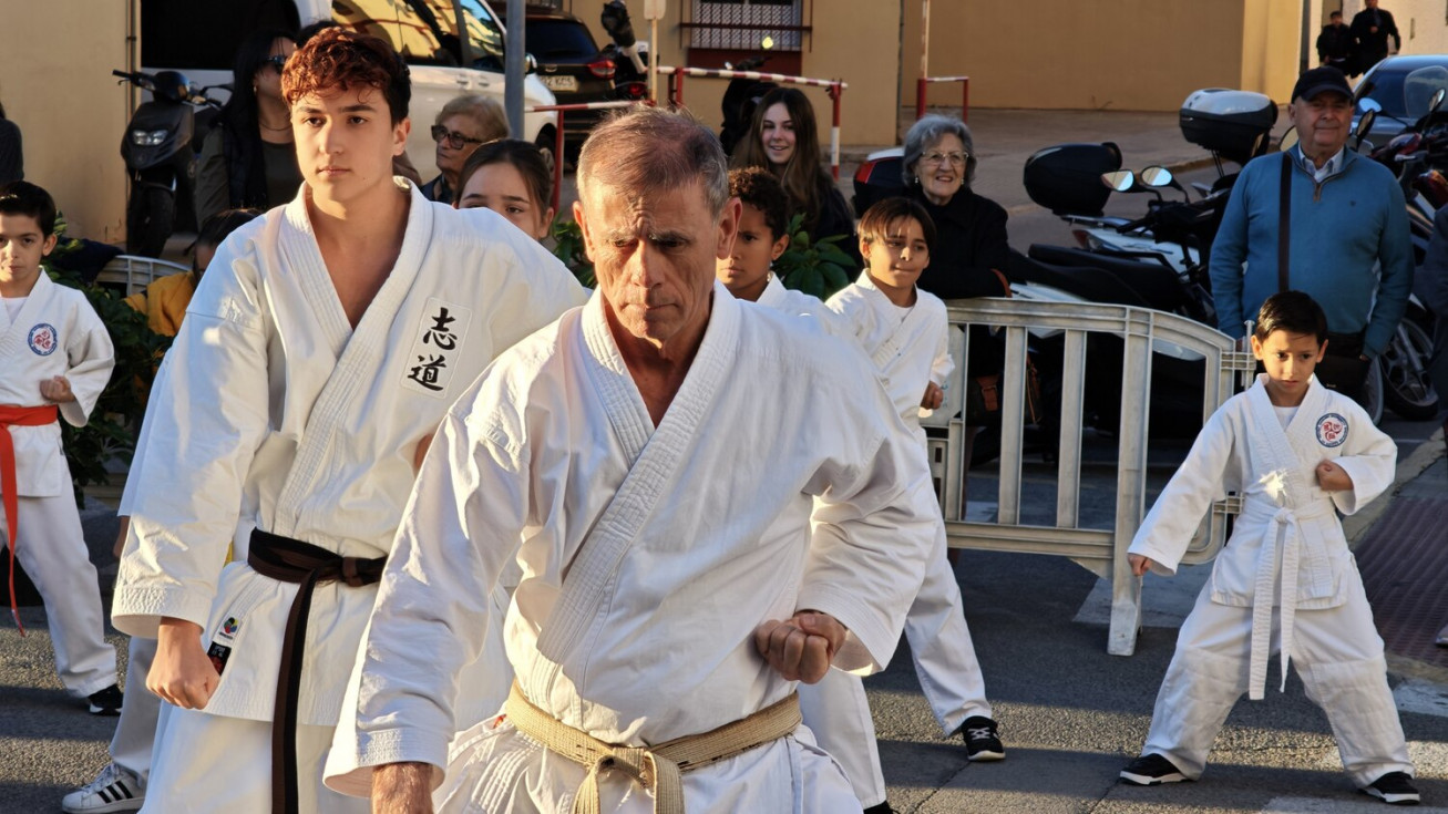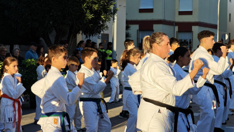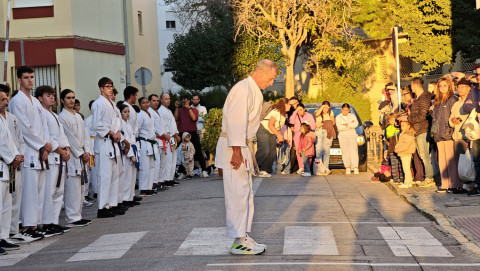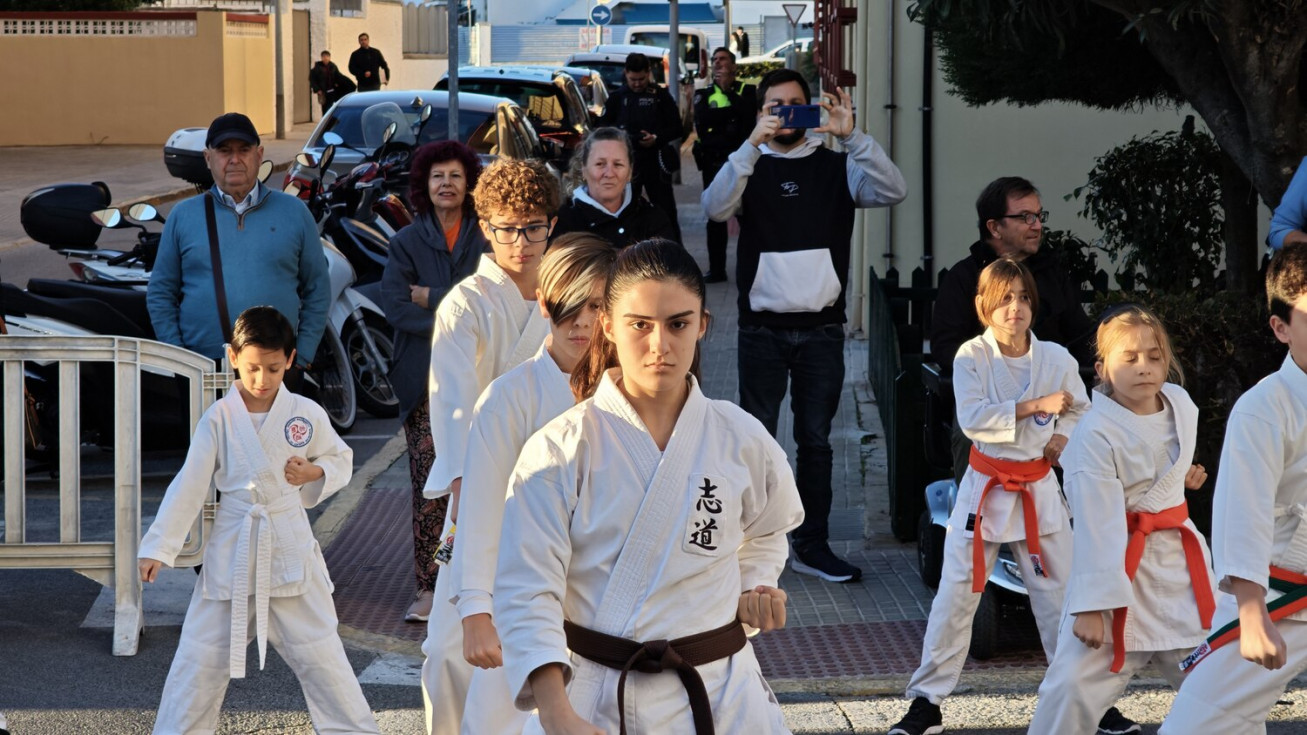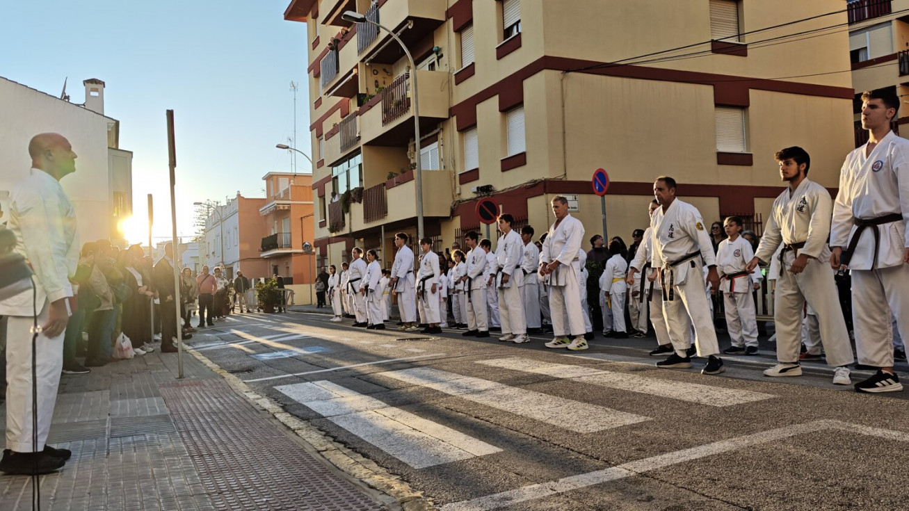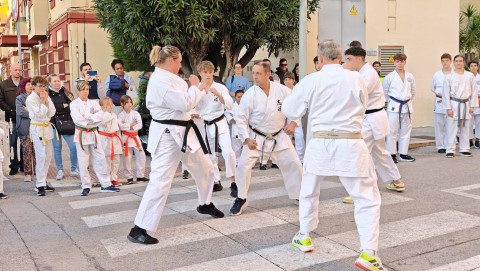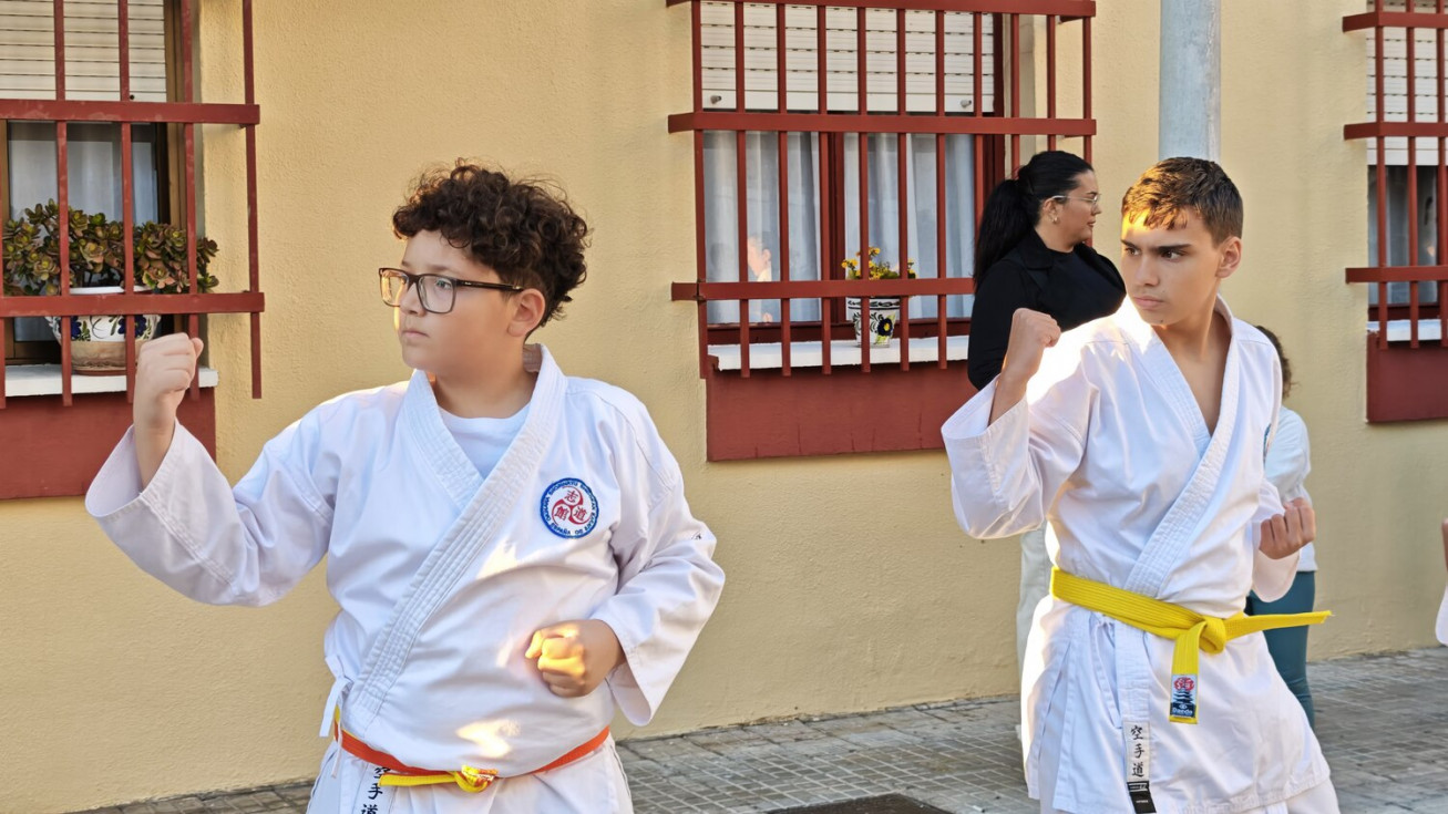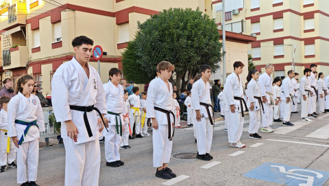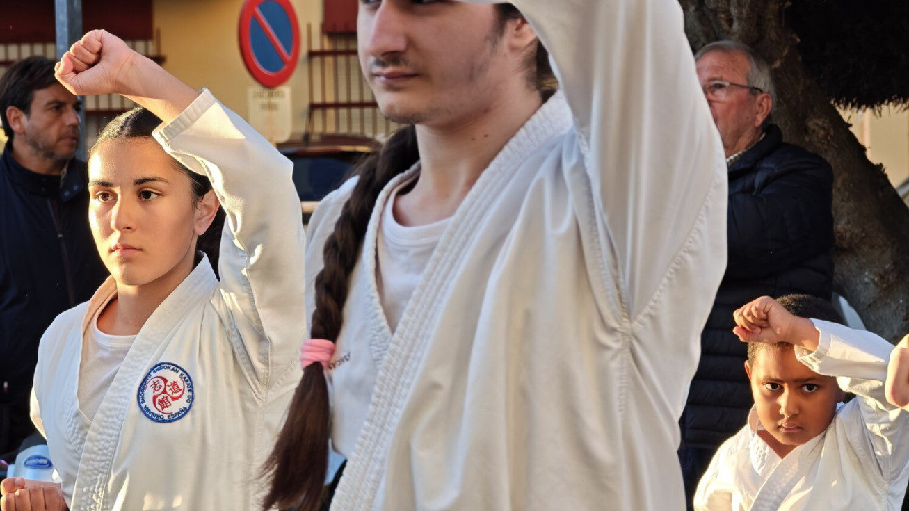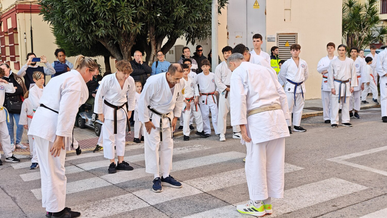 La calle Marconi fue ayer escenario de una exhibición de artes marciales protagonizada por los alumnos de la escuela de kárate de la asociación Okinawa Shorin Ryu Shidokan Shirasagi Escuela Chibana de Rota que ahora ha dado un paso más con la apertura del nuevo Dojo Tamashi. Ayer se inauguraba este nuevo espacio en la localidad, que pretende ser un referente de estas disciplinas y que se inauguró contando con lo más valioso que tiene, exhibir el aprendizaje de su alumnado.
