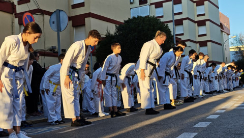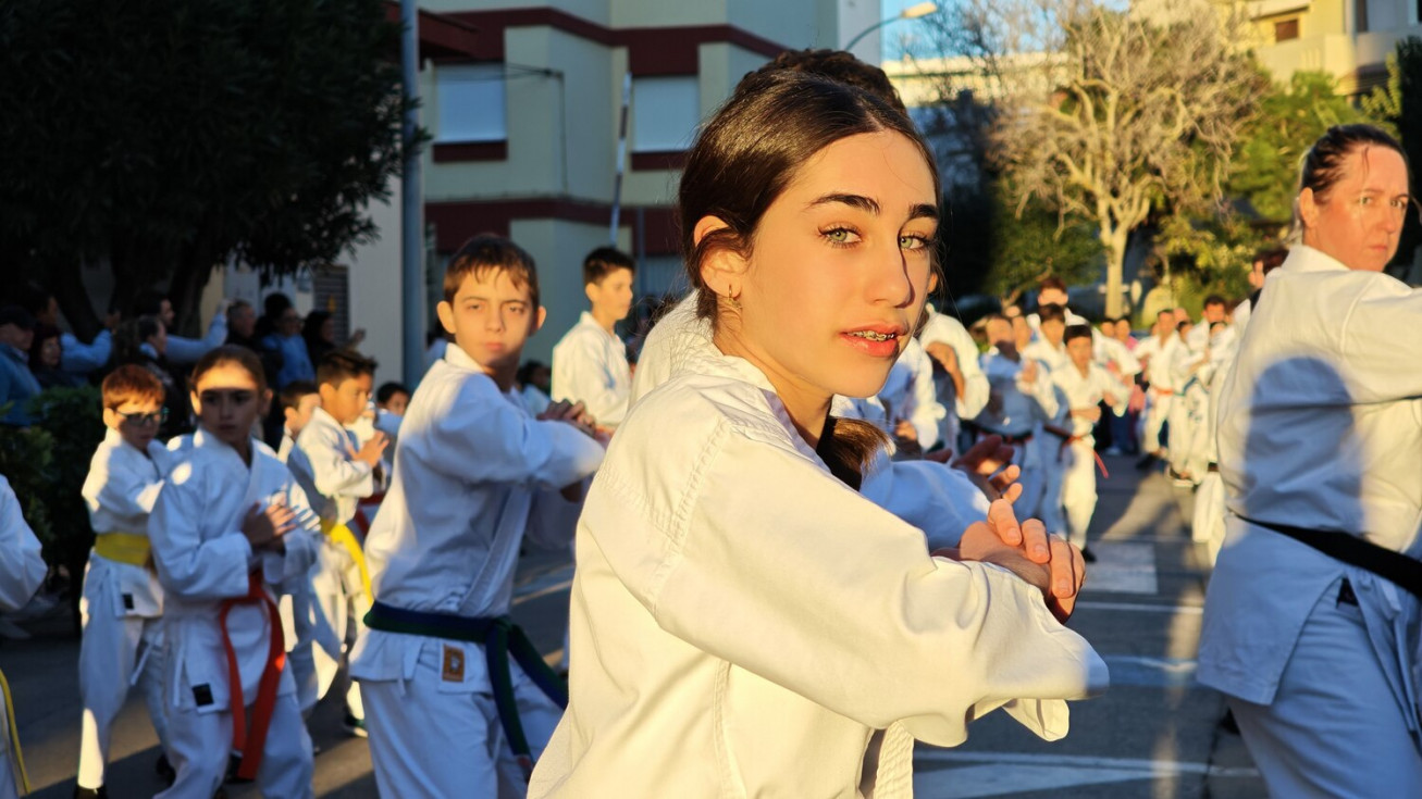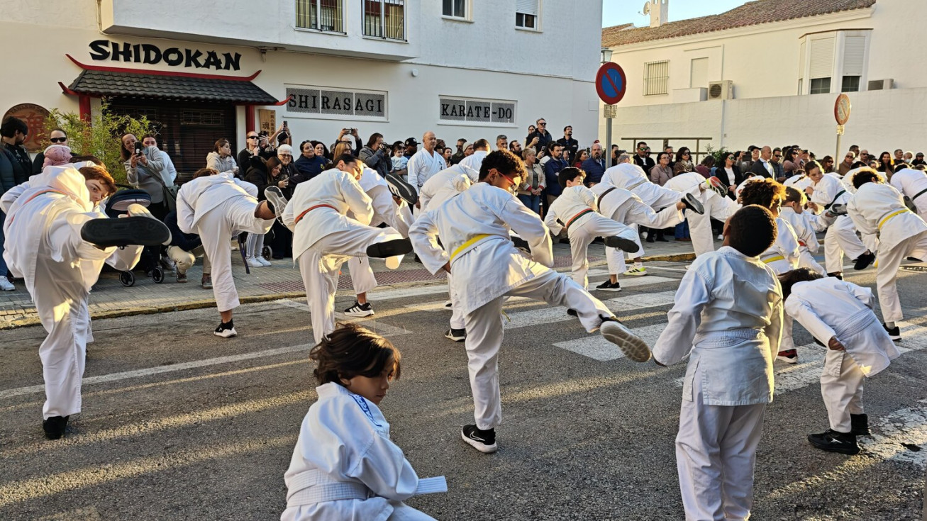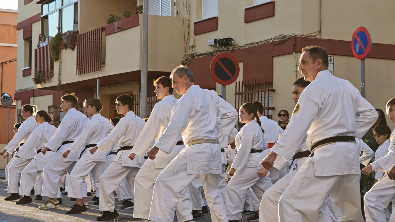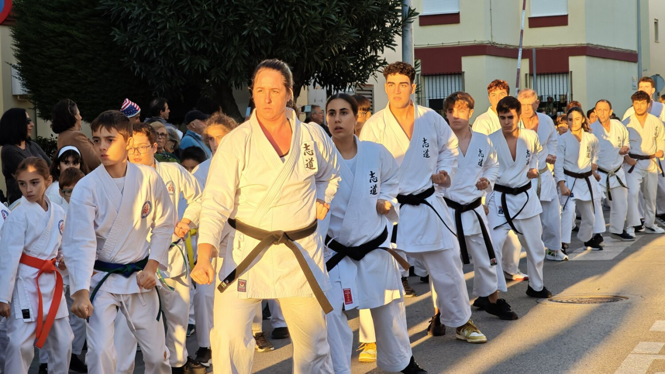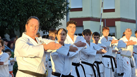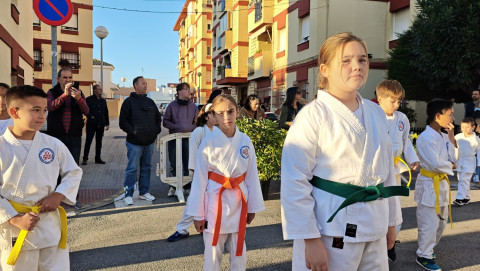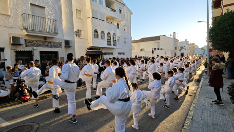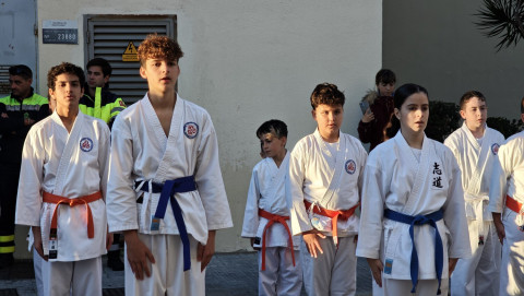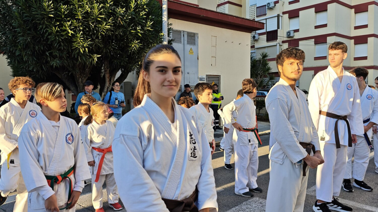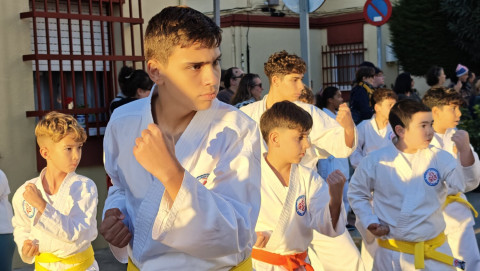 La calle Marconi fue ayer escenario de una exhibición de artes marciales protagonizada por los alumnos de la escuela de kárate de la asociación Okinawa Shorin Ryu Shidokan Shirasagi Escuela Chibana de Rota que ahora ha dado un paso más con la apertura del nuevo Dojo Tamashi. Ayer se inauguraba este nuevo espacio en la localidad, que pretende ser un referente de estas disciplinas y que se inauguró contando con lo más valioso que tiene, exhibir el aprendizaje de su alumnado.