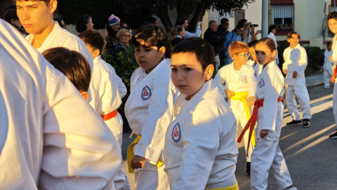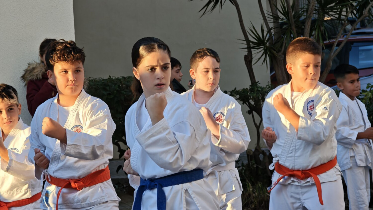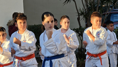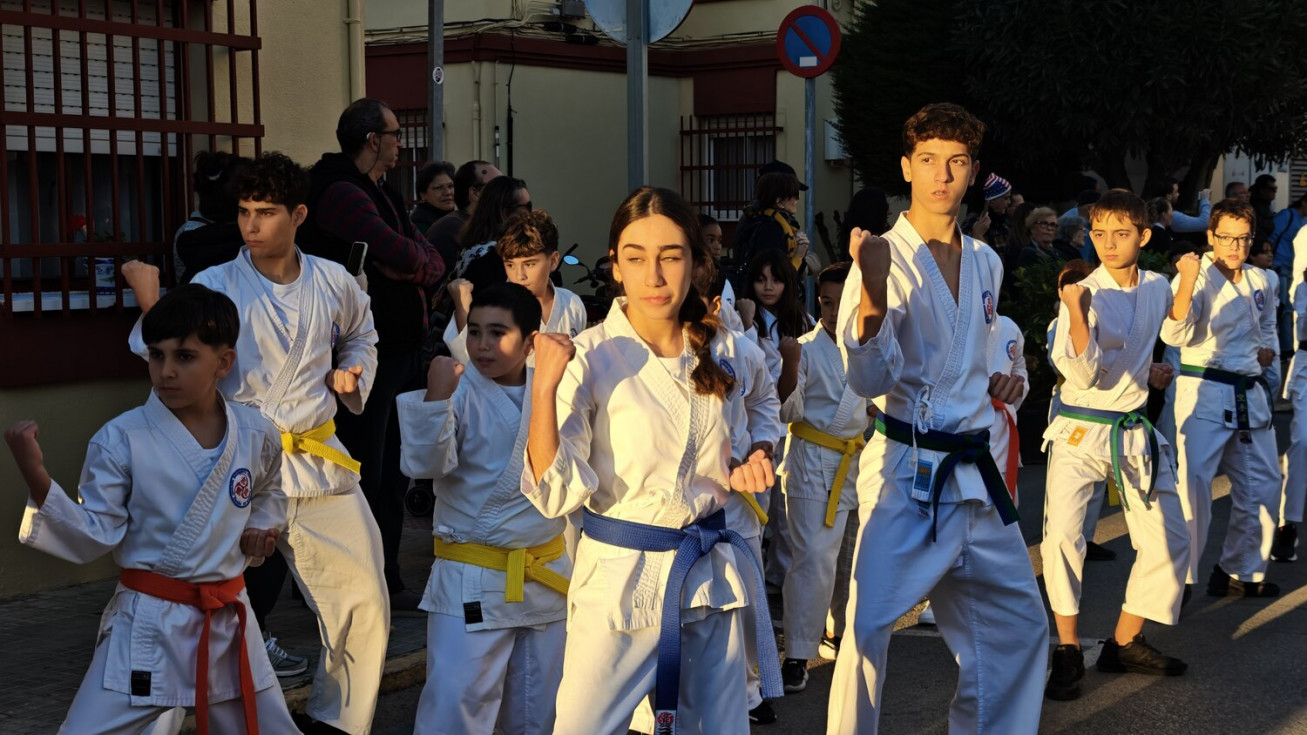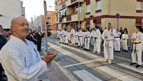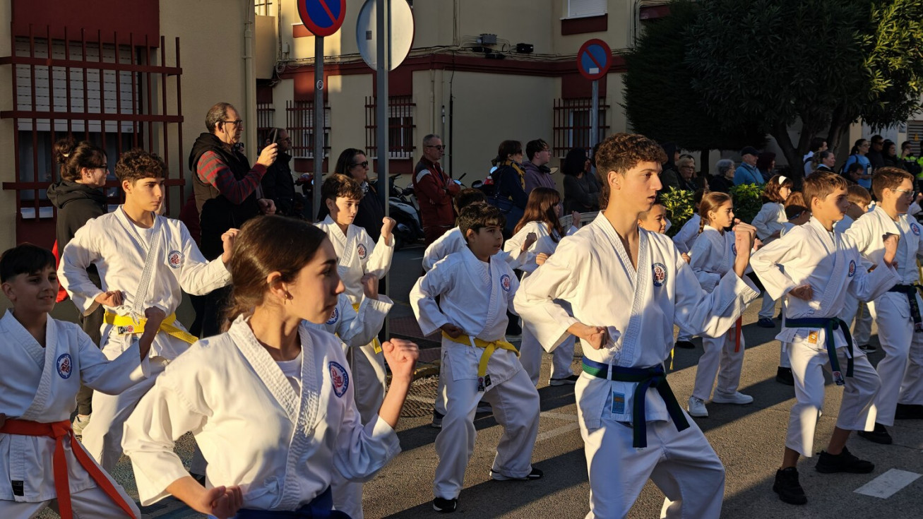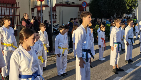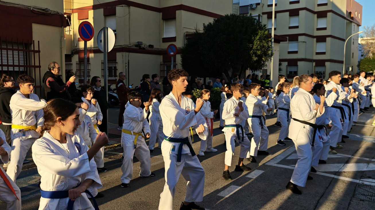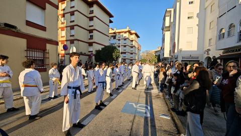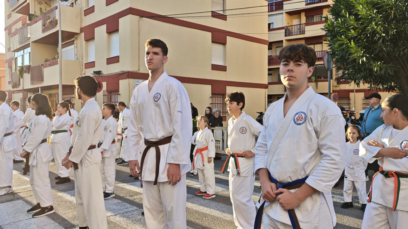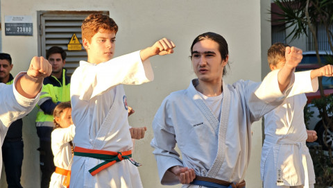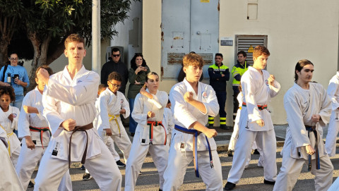 La calle Marconi fue ayer escenario de una exhibición de artes marciales protagonizada por los alumnos de la escuela de kárate de la asociación Okinawa Shorin Ryu Shidokan Shirasagi Escuela Chibana de Rota que ahora ha dado un paso más con la apertura del nuevo Dojo Tamashi. Ayer se inauguraba este nuevo espacio en la localidad, que pretende ser un referente de estas disciplinas y que se inauguró contando con lo más valioso que tiene, exhibir el aprendizaje de su alumnado.