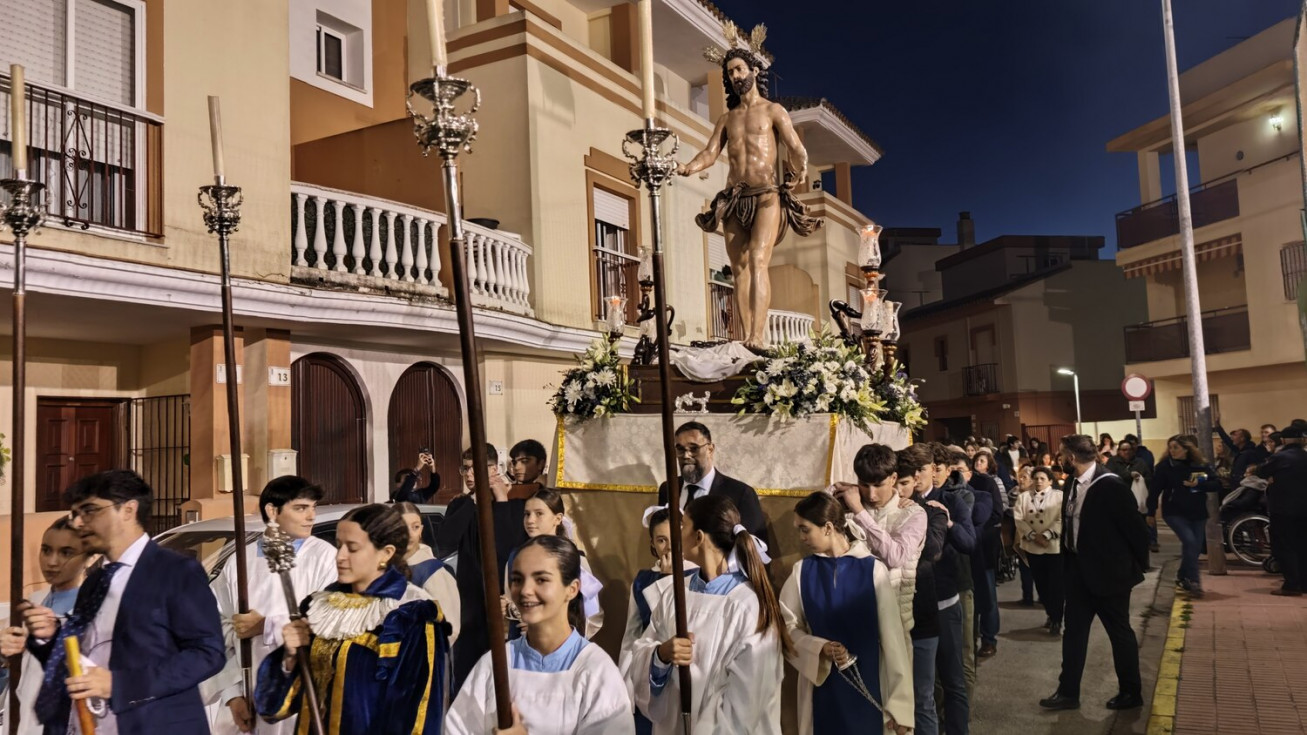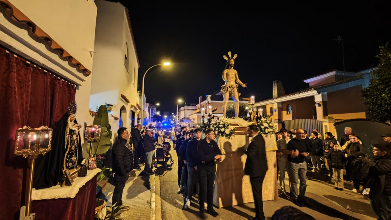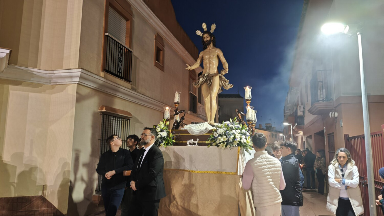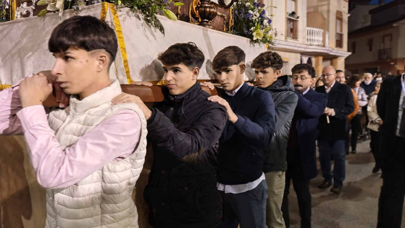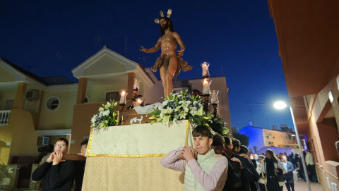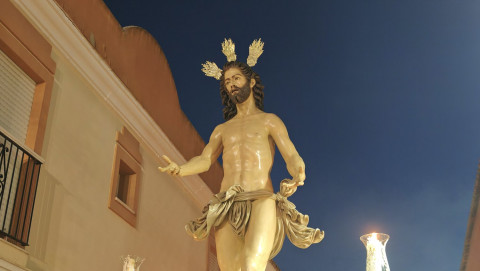 Jesús Resucitado ha sido portado por jóvenes costaleros, guiados por el equipo de capataces que lidera Manuel Jesús Pizones, pasando por calles y pequeñas plazas por las que nunca antes ha pasado, algunas muy oscuras, lo que ha dado solemnidad al paso.