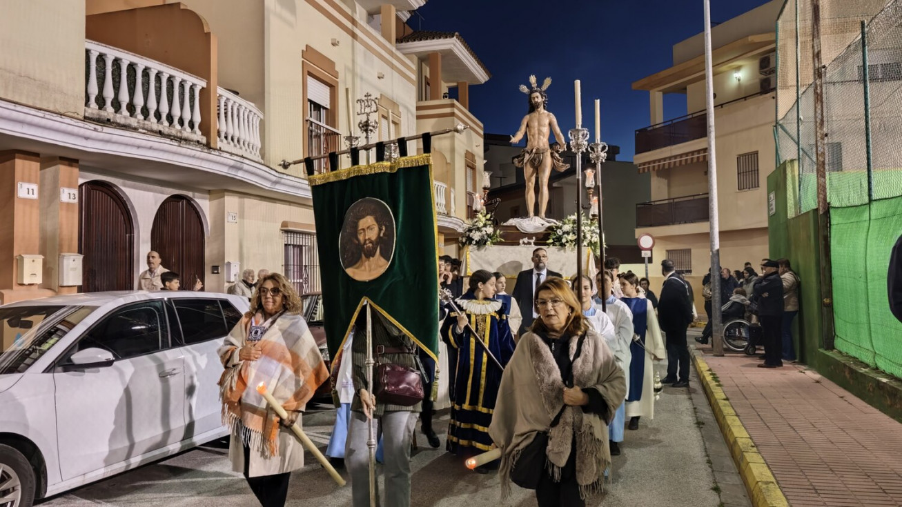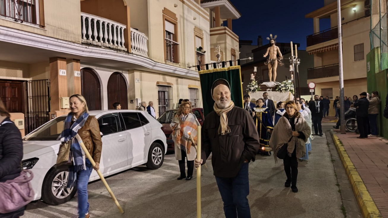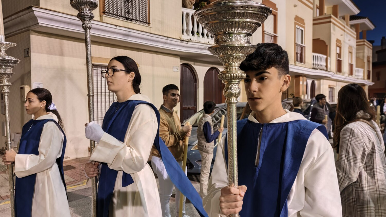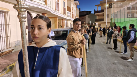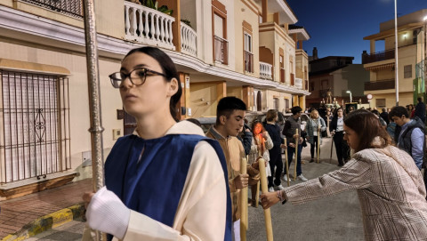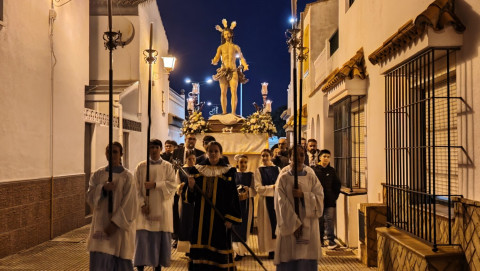 Jesús Resucitado ha sido portado por jóvenes costaleros, guiados por el equipo de capataces que lidera Manuel Jesús Pizones, pasando por calles y pequeñas plazas por las que nunca antes ha pasado, algunas muy oscuras, lo que ha dado solemnidad al paso.