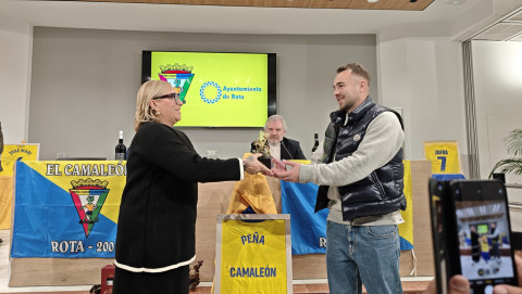 Le hizo entrega una socia de la entidad que cumple 25 años y 23 entregando este reconocimiento. Una trayectoria que destacó el presidente de la federación de peñas situando a la de Rota como una de las señeras que no solo apoya al Cádiz en lo futbolístico, sino que participa de actividades culturales en la localidad, organizando citas como la quema de la noche de San Juan o la Erizá durante el Carnaval. Para Juan Antonio García era un orgullo contar con "El Camaleón" en la federación y como miembro de ella, y con motivo del 20' aniversario que cumplen, se le entregó al presidente de la peña roteña un detalle con el logo nuevo editado por la efeméride.