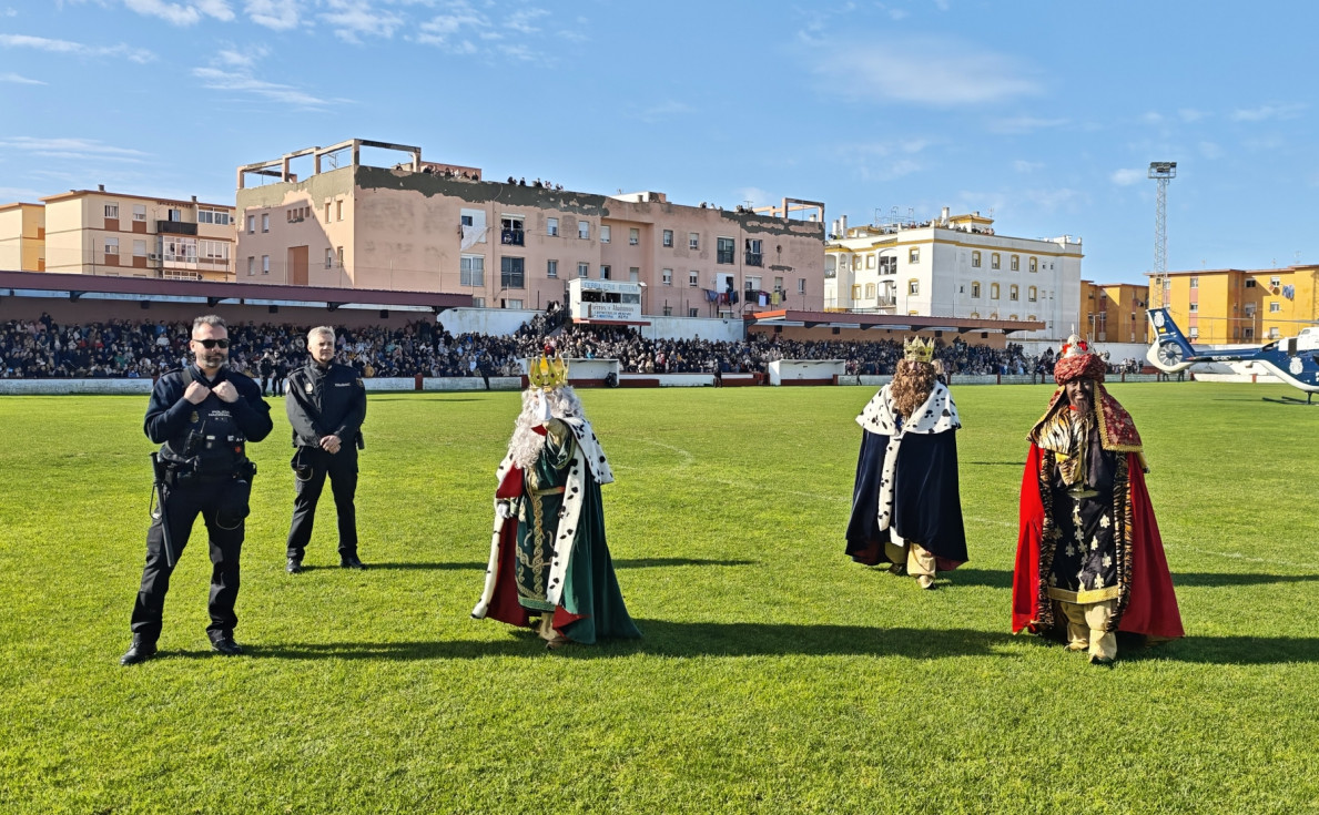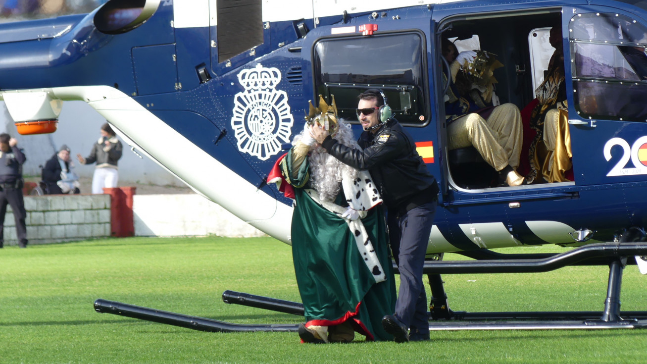 Los Reyes Magos ya están en Rota y han sido recibidos, como no podía ser de otra manera, con una calurosa bienvenida de aplausos y saludos por parte de los roteños que los han esperado impacientes desde las gradas y alrededores del estadio "Manuel Bernal Sánchez-Romero". Y es que este año, a diferencia de los últimos 20, Melchor, Gaspar y Baltasar no han aparecido por el espigón del muelle pesquero en barco, sino que lo han hecho por aire, en un helicóptero de la Policía Nacional que les ha ayudado a realizar el último trayecto para llegar cuanto antes a Rota.
