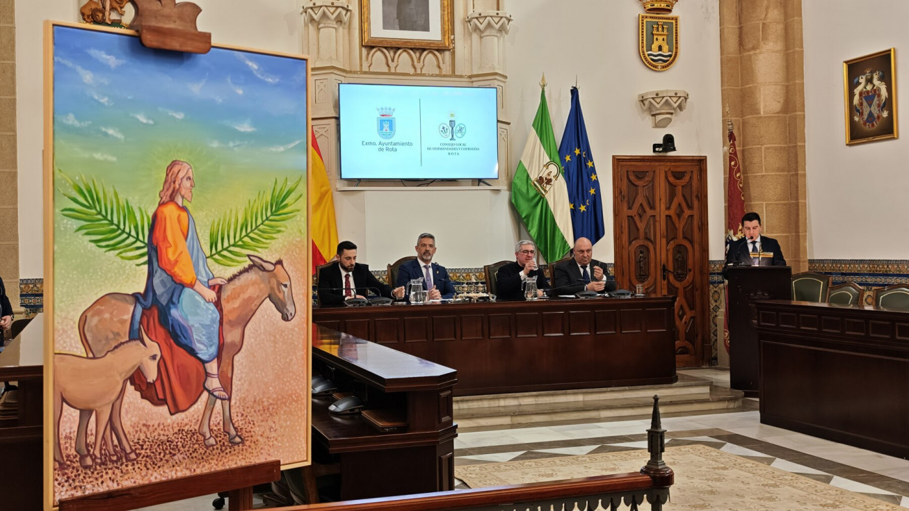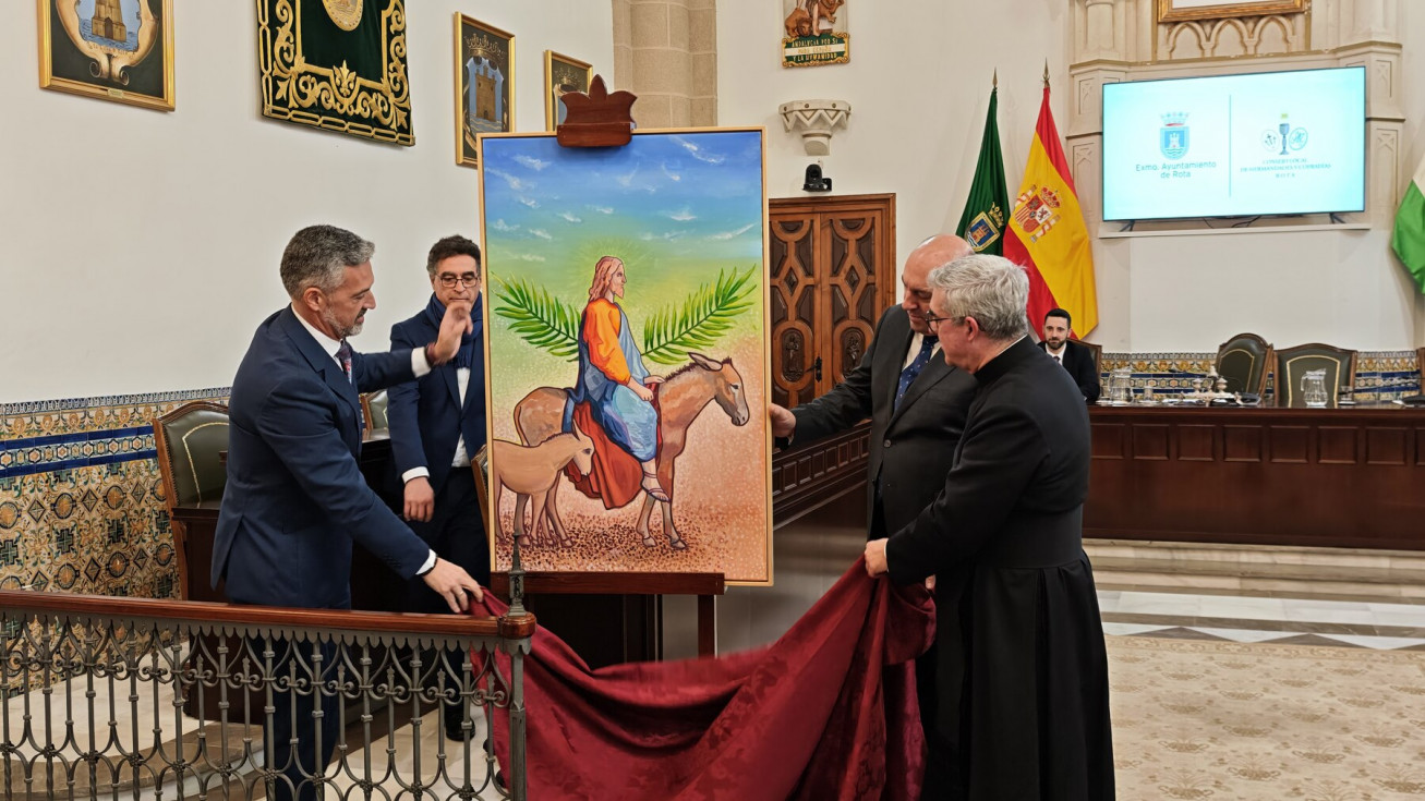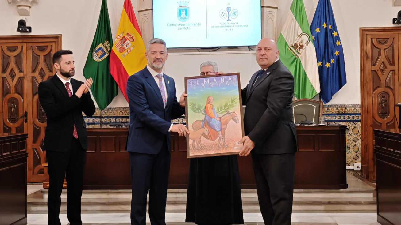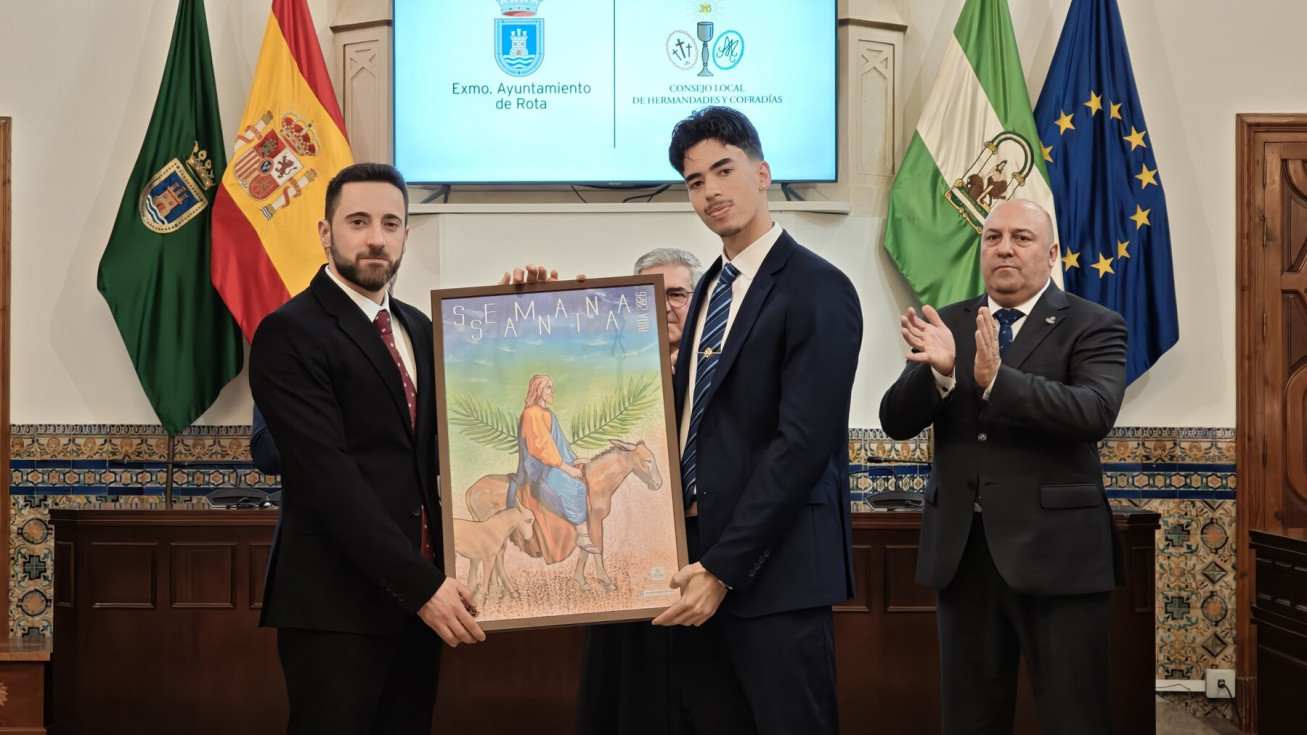 La Semana Santa de Rota 2026 ya tiene cartel anunciador. Se ha presentado en esta mañana de domingo, en el salón capitular del Palacio Municipal Castillo de Luna, en un acto que le ha tomando la delantera al Carnaval que todavía no se ha anunciado, y que ha estado presidido por el alcalde de Rota, Javier Ruiz Arana, además, del delegado de Cultura, Pablo Gómez, el director espiritual Santiago Gassín, y el presidente del Consejo Local de Hermandades y Cofradías.