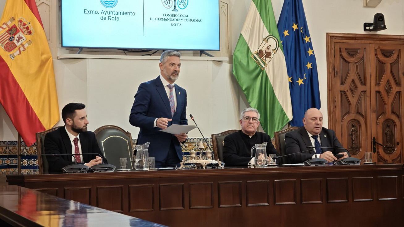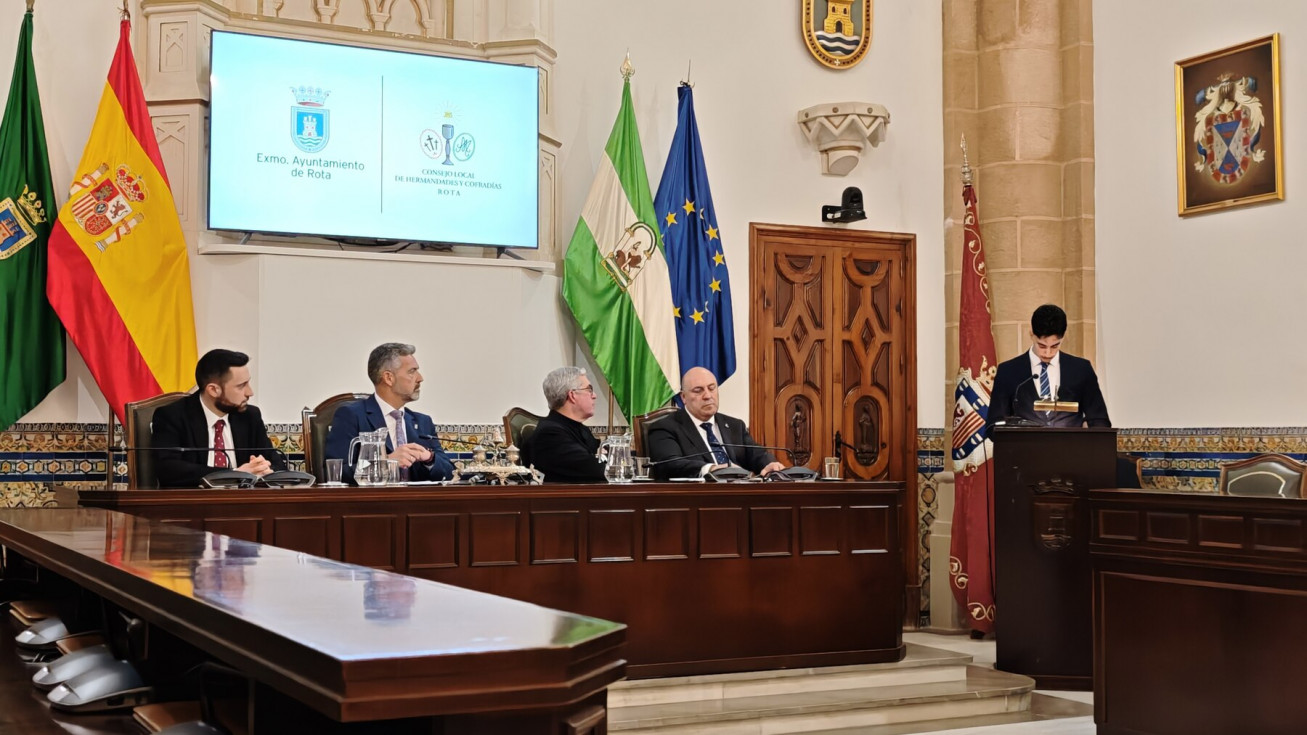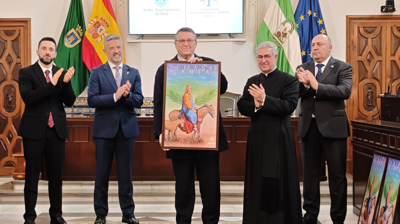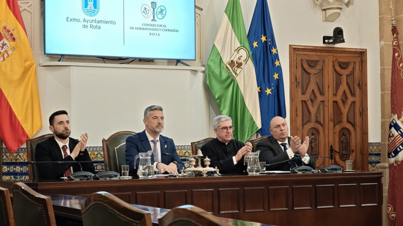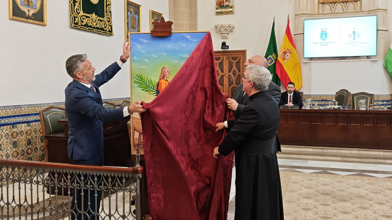 La Semana Santa de Rota 2026 ya tiene cartel anunciador. Se ha presentado en esta mañana de domingo, en el salón capitular del Palacio Municipal Castillo de Luna, en un acto que le ha tomando la delantera al Carnaval que todavía no se ha anunciado, y que ha estado presidido por el alcalde de Rota, Javier Ruiz Arana, además, del delegado de Cultura, Pablo Gómez, el director espiritual Santiago Gassín, y el presidente del Consejo Local de Hermandades y Cofradías.