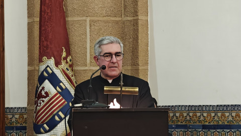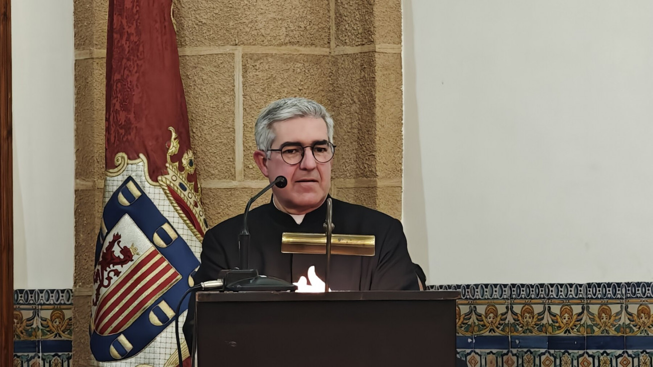 Santiago Gassín, párroco de la iglesia mayor, que aprovechó para dar las gracias por ese recordatorio necesario para que se vendan todas las entradas, se centró en la obra que reunía esta mañana a los cofrades. Para él, toda obra tiene un doble mensaje, el del artista y el que el espectador recibe. En su caso, este cartel de Lokati le transmite vivacidad por su colorido, como signo del mensaje de vida que esconde porque después de la muerte de Jesús vuelve la vida con la resurrección. Es además, la alegría del Domingo de Ramos y es un guiño a la Hermandad de la Veracruz que está de aniversario. Para Santiago Gassín también son importantes los colores, el rojo de la sangre que simboliza la entrega de Dios al hombre, y el azul de la realeza, pero de una entendida desde la humildad y de estar al servicio de los demás. Las palmas, el azul del cielo llevan al párroco a interpretarlo como un buen presagio esperando que esta sea una Semana Santa de buen tiempo.