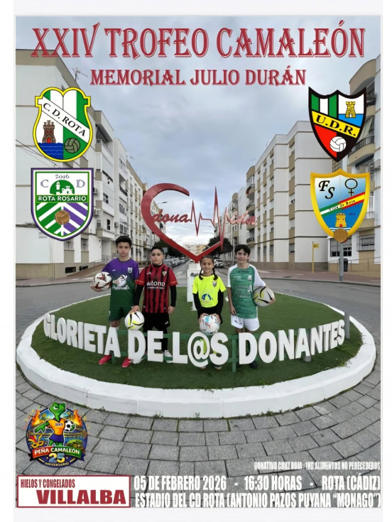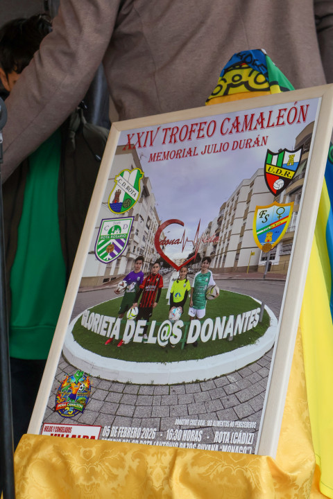 El cartel de este "Memorial Julio Durán" es obra del socio cadista Leopoldo Almisas, que siempre escoge un rincón de Rota para inmortalizar a jugadores de los distintos equipos de fútbol que disputarán la competición de fútbol base. Este año, se ha elegido la rotonda dedicada a los donantes de sangre, médula y órganos, haciendo grande el mensaje de la campaña que abandera José Ignacio Ruiz-Herrera "Hazte donante, regala vida", que ha dado las gracias a la peña "El Camaleón" por elegir esta glorieta de la que ha dicho "es la que más vida tiene de todo Rota", en alusión a los donantes que se marchan dejando sus órganos para que otros puedan seguir viviendo. En el momento han estado los niños que salen en la imagen y que han recibido un regalo por su participación.