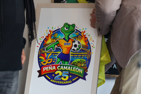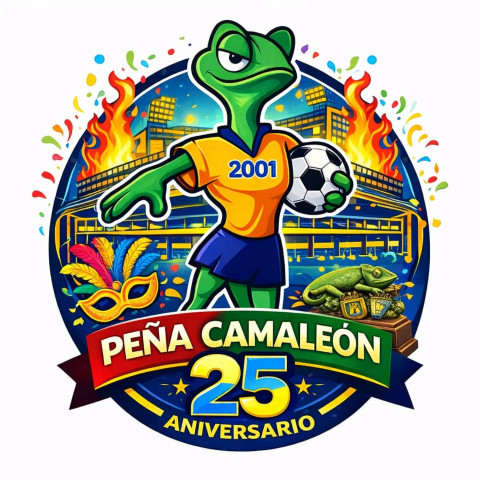 Además de los dos carteles anunciando las actividades que organizan en este febrero, esta peña está de aniversario. Cumple 25 años desde el inicio de su andadura en la localidad y por tal motivo, han querido sacar un logo conmemorativo, que es obra de Carlos Meyer, y que mantiene el camaleón como figura principal "al que se le ha quitado el cigarrillo", pero sigue siendo el camaleón de siempre, con referencias al estado Nuevo Mirandilla, para los cadista el Carranza de siempre, además de aparecer el Trofeo Camaleón que la entidad entrega al jugador más regular del Cádiz C.F., y los colores amarillo y azul, como no podía ser de otra manera.