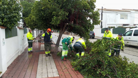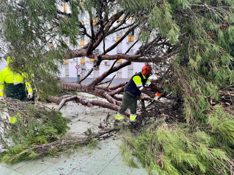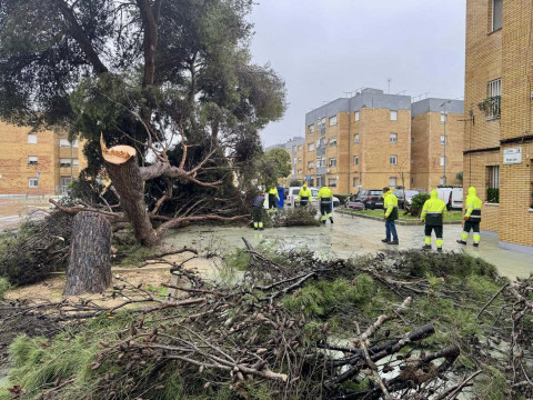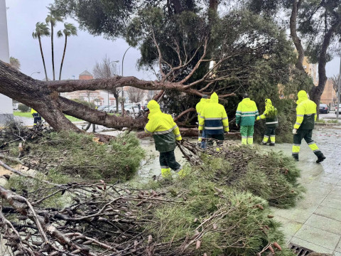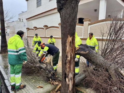 Desde las 7.30 horas, los operarios municipales de Parques y Jardines están trabajando de manera ininterrumpida para retirar árboles y ramas caídas en zonas como la avenida de la Marina y las 512 viviendas, así como otros elementos de la vía pública afectados, y asegurar además las estructuras que han resultado dañadas por las rachas de viento.