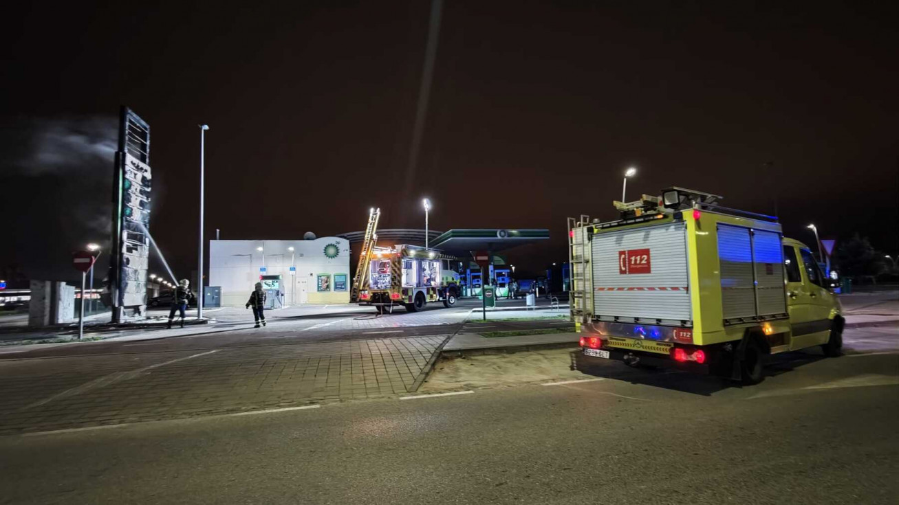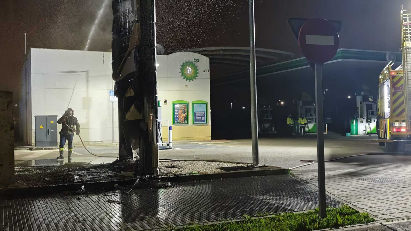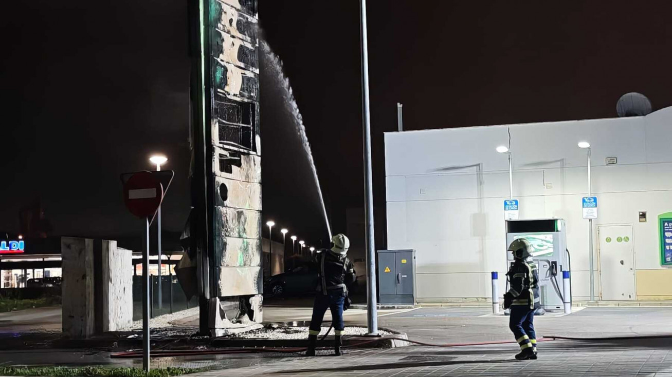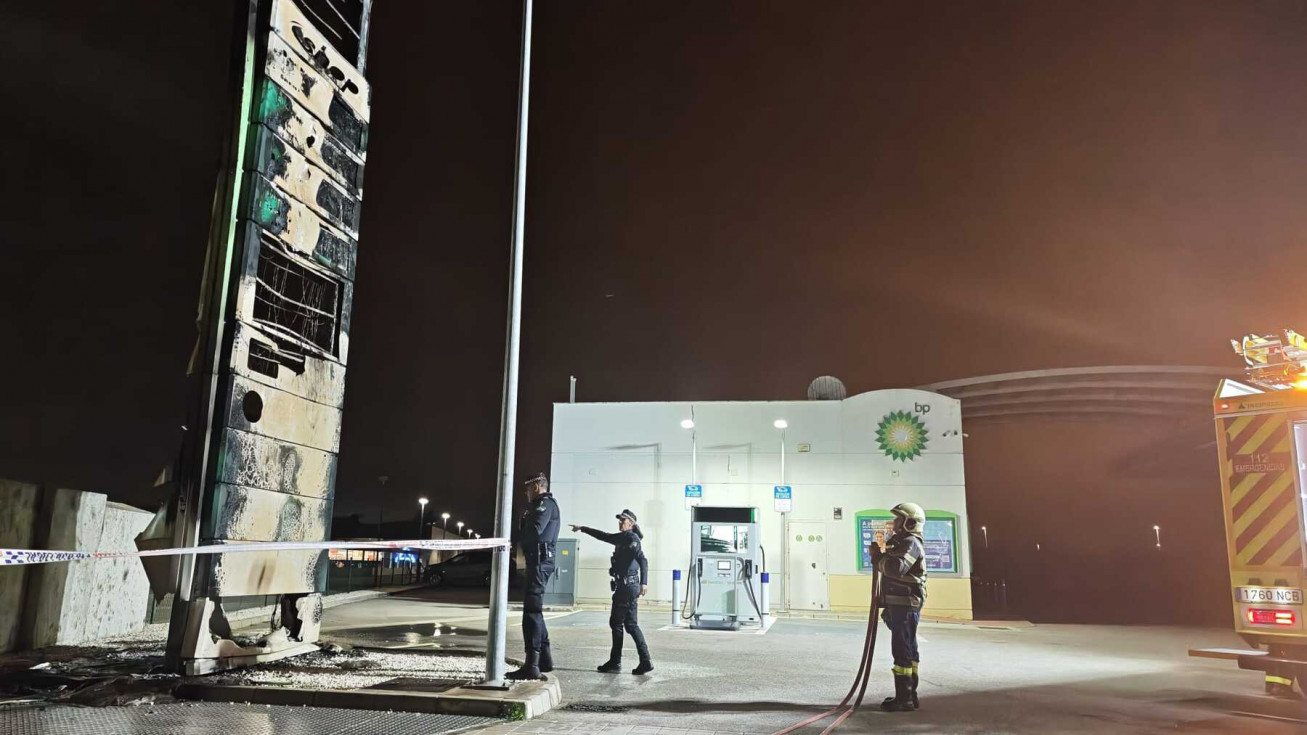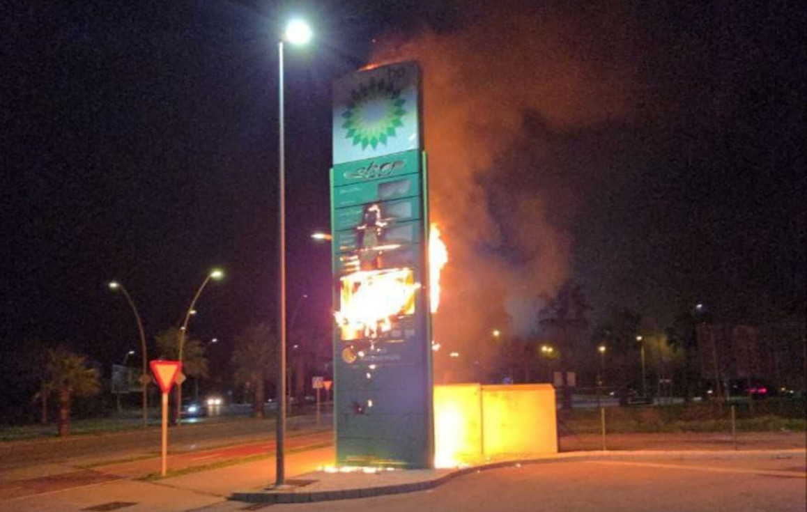 Arde el tótem luminoso de la gasolinera BP de la entrada a Rota