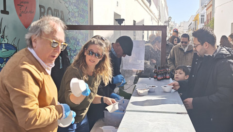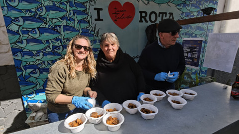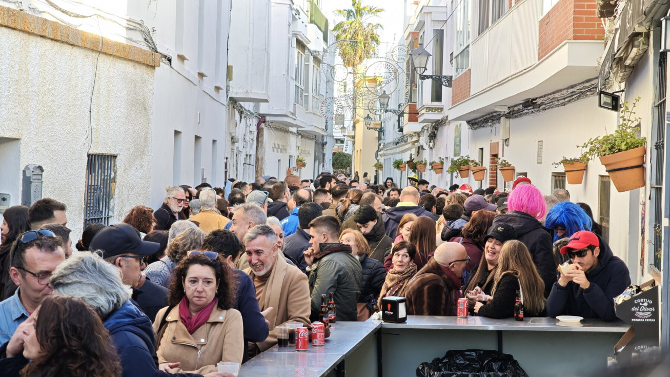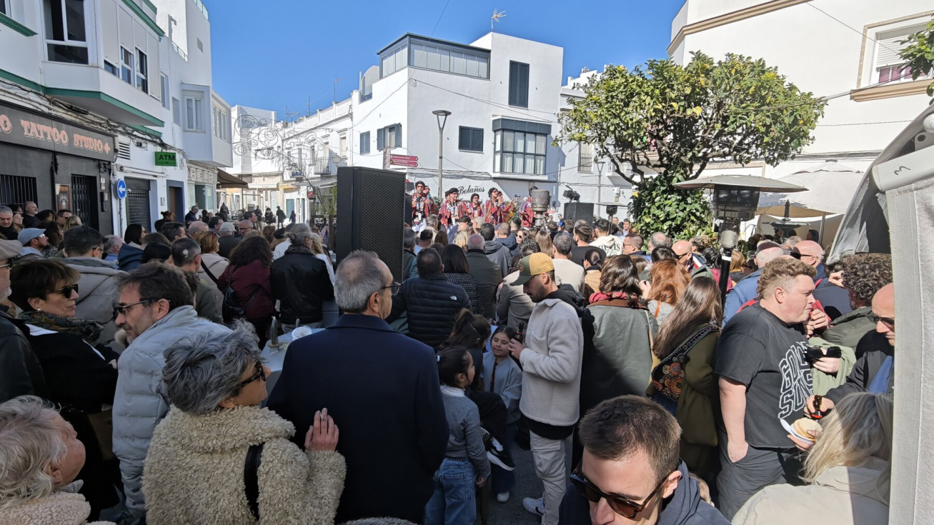 La primera parada para la gran mayoría fue la XXVII Chicharroná Popular, en la plaza Bernardo Cala, donde se repartieron varias decenas de kilos de chicharrones y hasta 40 litros de Manzanilla entre el público que disfrutó de la actuación de las primeras agrupaciones, algunas de Rota y otras de fuera que se sumaron a esta primera jornada.