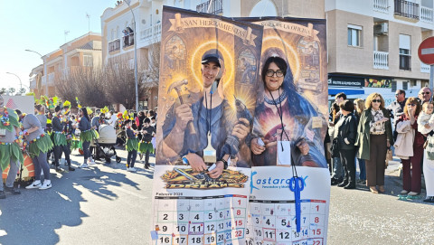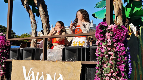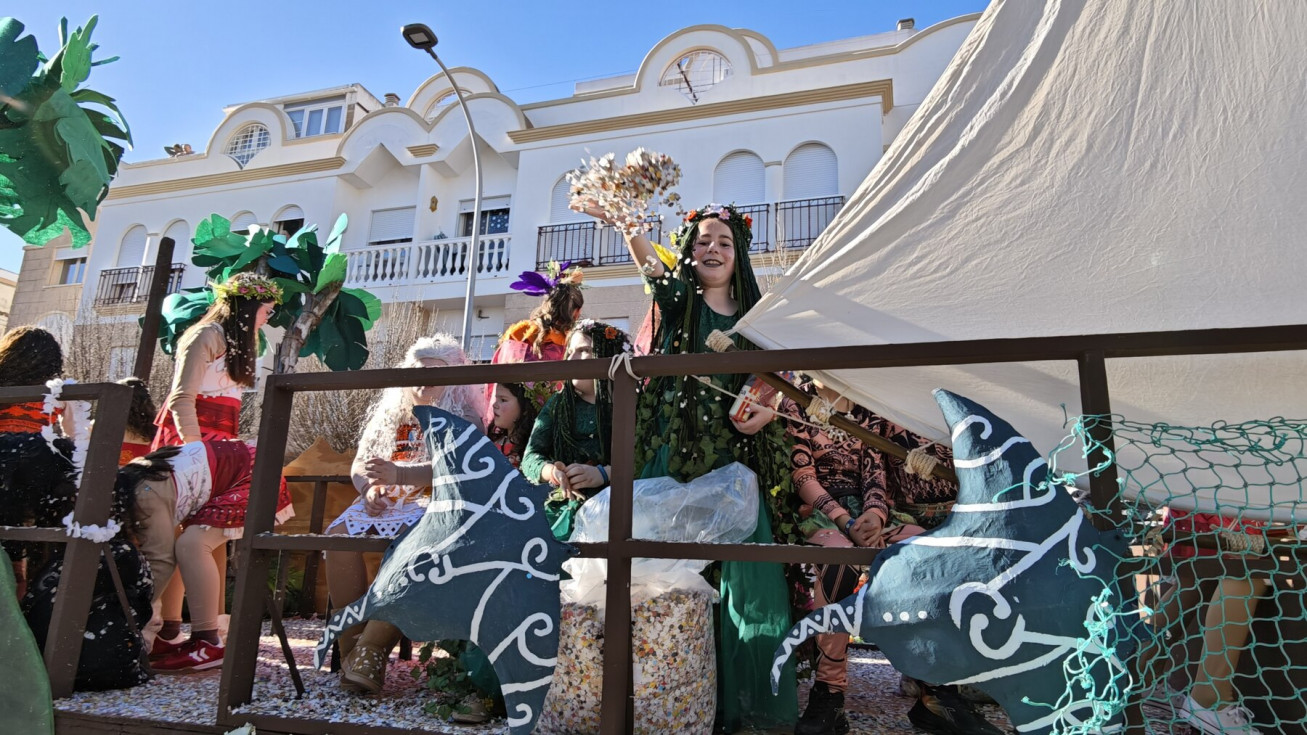 Cerraba el cortejo la carroza de los niños que este año son ninfas y atlantes en representación de peñas y entidades, que han disfrutado lanzando papelillos a puñados y cerraban el cortejo Carlos Bellido y Carlota Romero, Neptuno y Sirena del Carnaval infantil que, como suele ser habitual, al ir los últimos, se quedan algo solos en la animación de la cabalgata, alejado de la algarabía del resto del desfile.