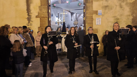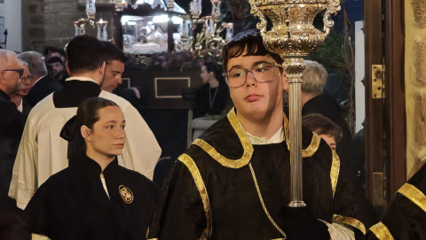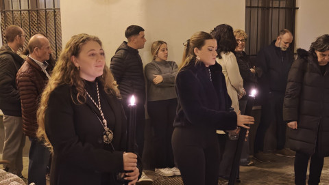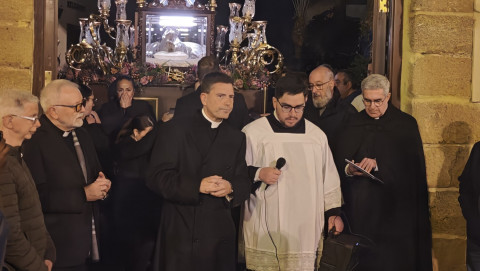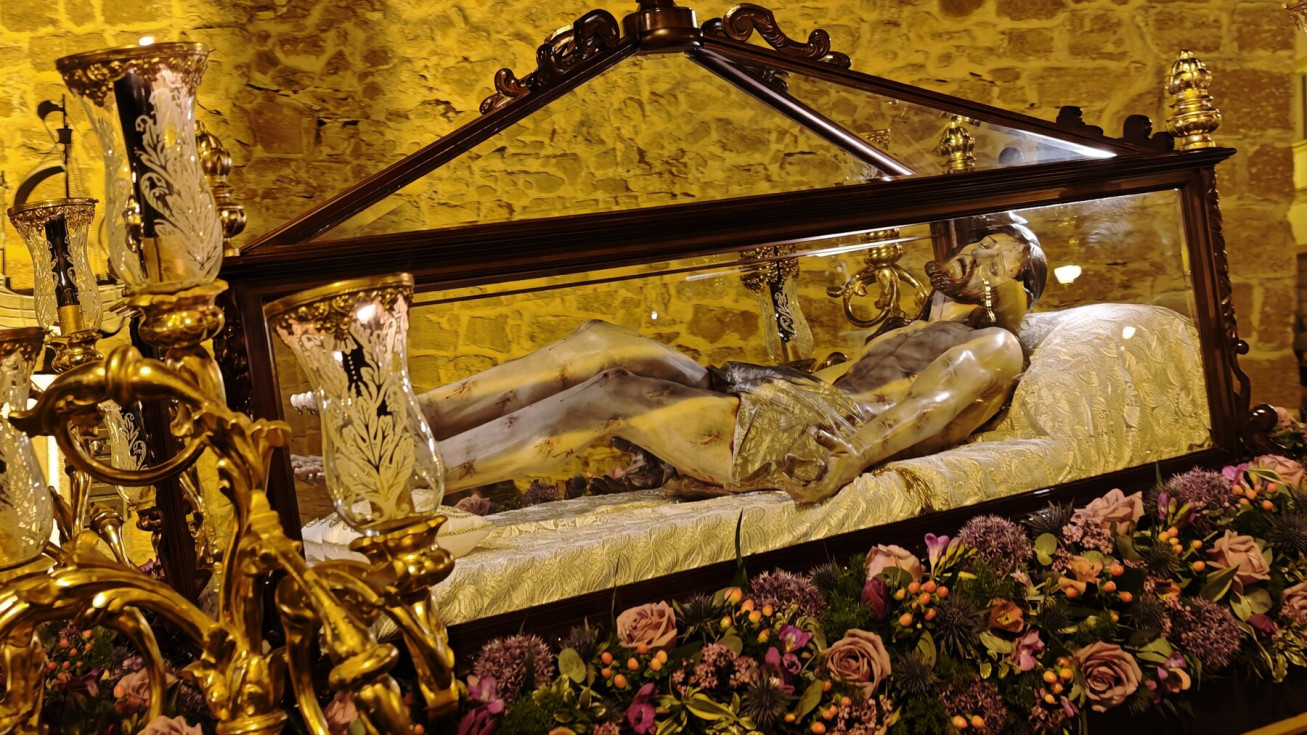 El Cristo Yacente ha lucido sobre unas andas preparadas especialmente para la ocasión, como ha indicado la hermandad organizadora, con un exorno floral elegante y contenido, que junto a la iluminación de los cirios, ha ayudado a crear la estampa de solemnidad que se pretendía para esta reflexión y meditación colectiva, pero a la vez, personal.