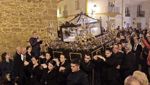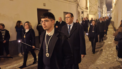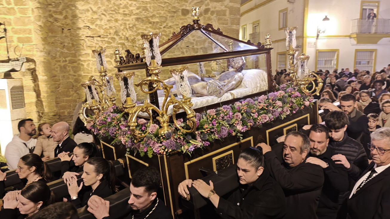 A las ocho de la tarde ha partido desde la parroquia de Nuestra Señora de la O el cortejo que durante dos horas y media recorre las calles del casco histórico de la villa. La imagen del Santísimo Cristo Yacente, titular de la Hermandad del Santo Entierro a la que este año el Consejo Local de Hermandades y Cofradías de Rota le encomendó la organización de este culto en la calle, ha salido desde la puerta lateral de la iglesia mayor ya que por peligro de desprendimientos, la puerta principal de la parroquia está cerrada al paso de los feligreses.
