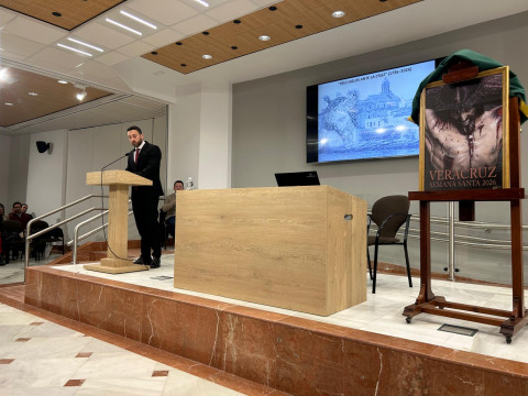 Una vez presentado este, los asistentes han podido escuchar al doctor en Historia del Arte y escultor imaginero Juan Manuel Miñarro que ha ofrecido conferencia "Tres siglos antes la cruz (1726-2026)", sobre el proceso de restauración de una talla como la del Santísimo Cristo de la Veracruz que conoce bien ya que esta obra del escultor Diego Roldán, se ha sometido en dos ocasiones a una intervención para su conservación y tanto en 1993 como en 2024, ha sido él el encargado de realizarla. En la noche del sábado ha contado a los presentes aspectos sobre esa labor y con ello, se ha podido profundizar en el significado de esta imagen y su valor patrimonial.