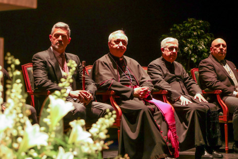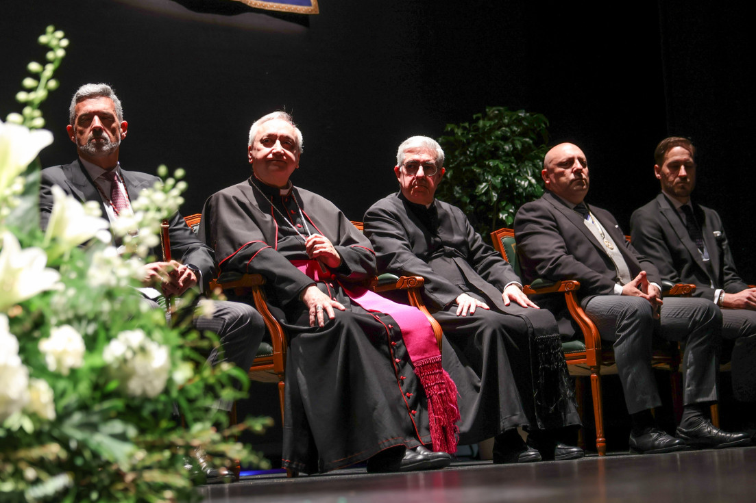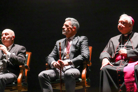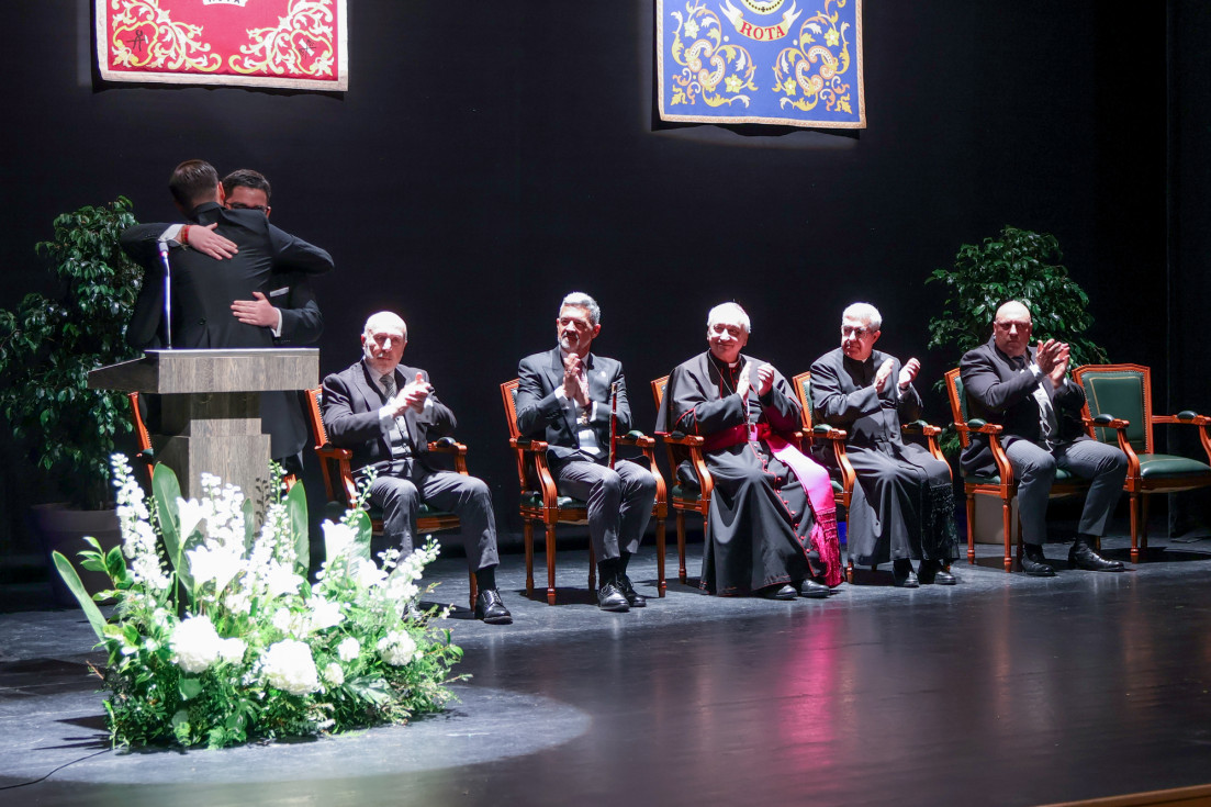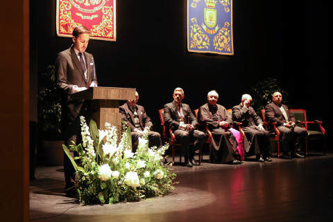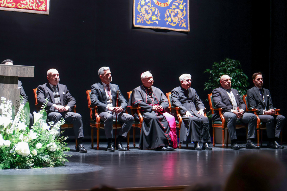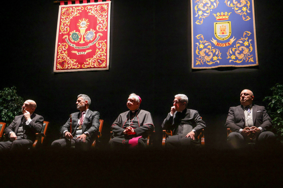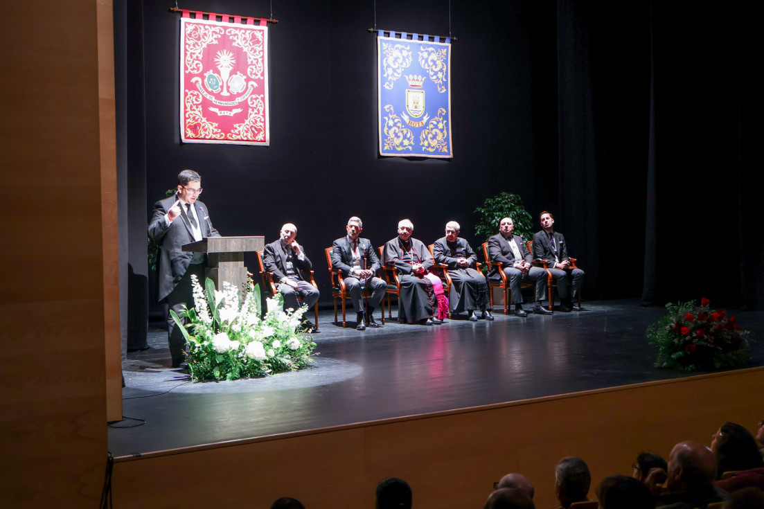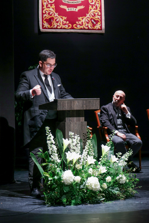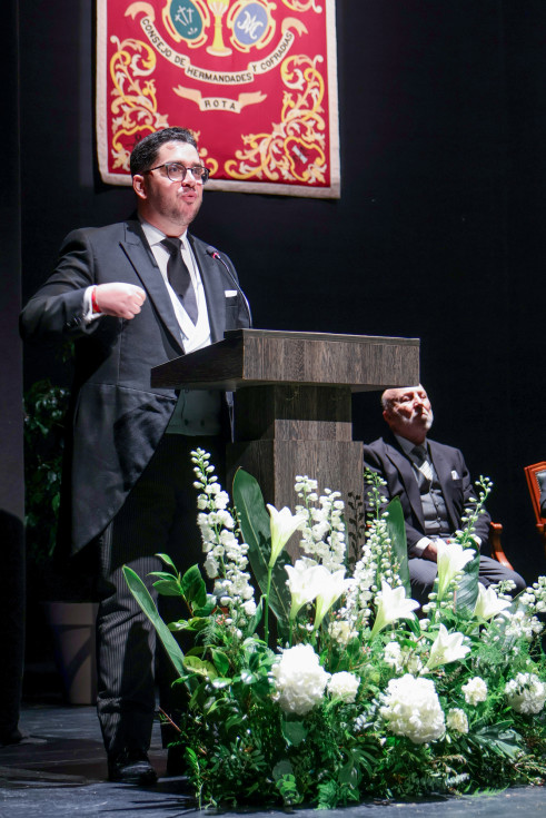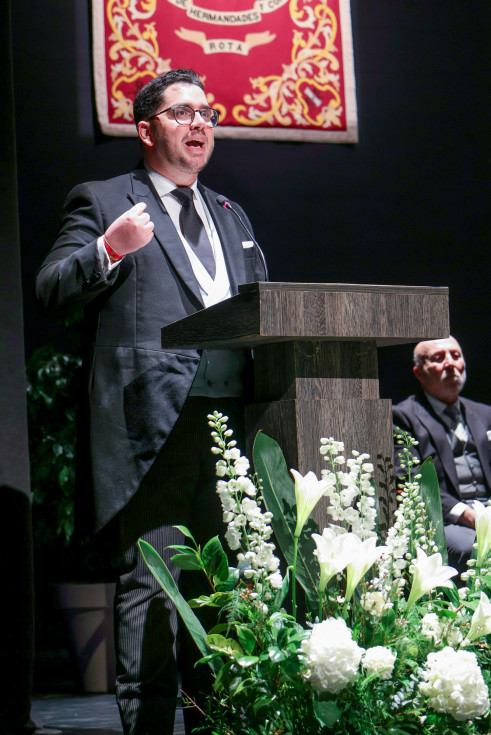 En un concurrido auditorio municipal "Alcalde Felipe Benítez", con el acompañamiento de la banda municipal de música "Maestro Enrique Galán" y una presidencia en la que destacaba la figura del obispo de la Diócesis de Asidonia Jerez, José Rico Pavés, junto al alcalde de Rota, Javier Ruiz Arana, el párroco de la O, Santiago Gassín, y el presidente del Consejo Local de Hermandades y Cofradías, José Manuel Sánchez Peña, el pregonero tuvo la oportunidad de compartir sus sentimientos como cofrade y creyente.